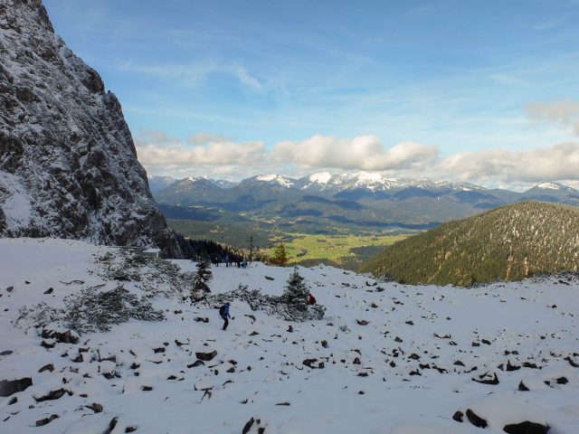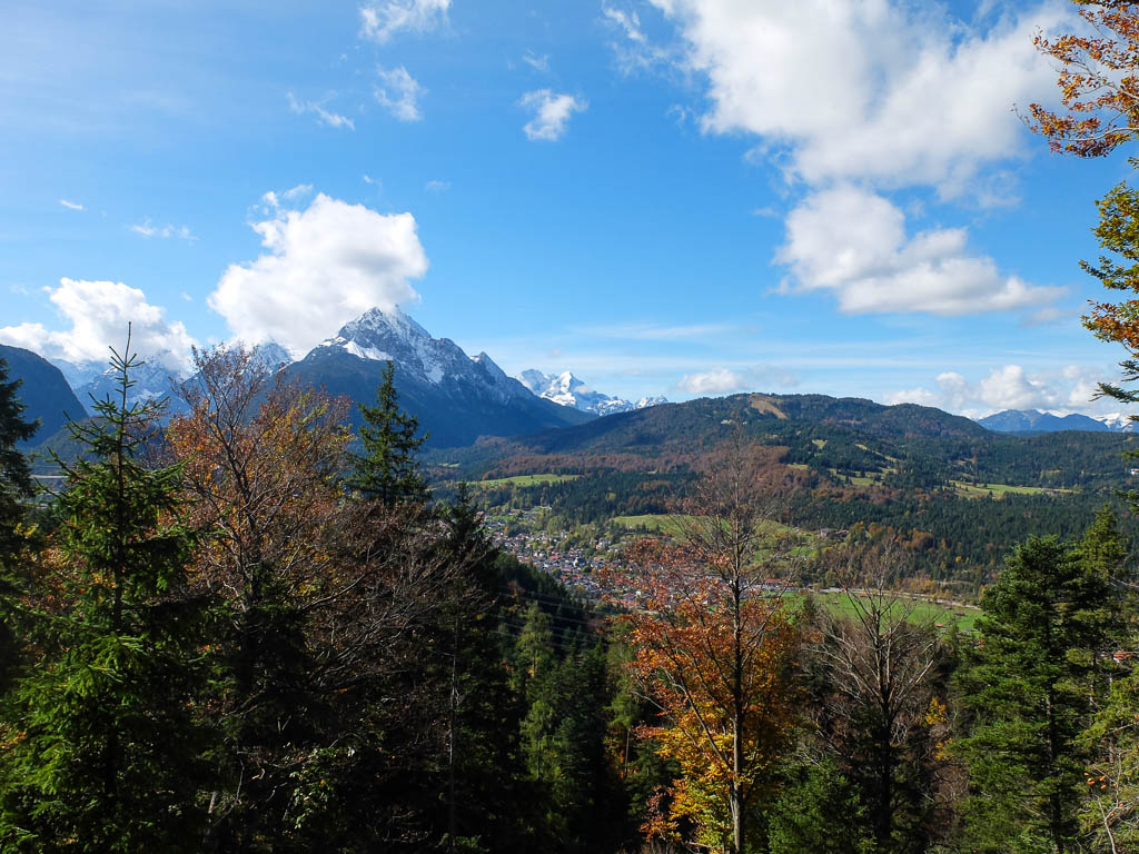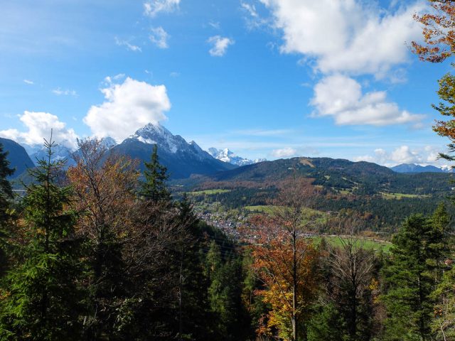 Während der ganzen Prüfung kommt es übrigens immer wieder zu netten Gesprächen mit anderen Teilnehmern. Fast alle sind sich einig: Eigentlich ist es unverschämt, so viele Leute zur Prüfung zuzulassen und dann nur 25 Ausbildungsplätze anzubieten. Denn geeignet sind eigentlich fast alle Teilnehmer. Aber gut, es ist so, wie es ist und auch wenn ich die Ausbildung gerne machen würde, die Welt geht für mich nicht unter, wenn ich nicht mit dabei bin. Der Blick auf Mittenwald und die gegenüberliegende Bergwelt während des Abstiegs: