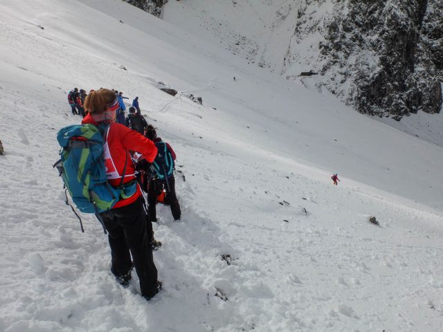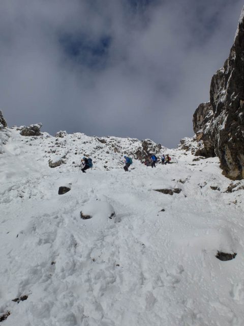 Der nächste Programmpunkt heißt „Abstieg über Geröll“. In der Warteschlange, bevor es unter den kritischen Augen vierer Prüfer nach unten geht: