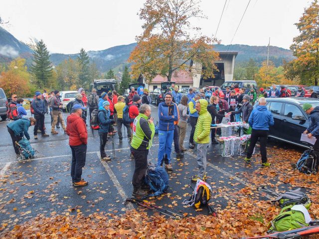 Um 8.40 Uhr sind Guido und ich am Parkplatz der Karwendelbahn, zwanzig Minuten zu früh, aber wir sind nicht die Ersten. Im Gegenteil, es herrscht reges Treiben, einige Leute laufen sogar mit Startnummern herum und da wir wissen, dass am heutigen Tag auch eine 24-Stunden-Wanderung stattfindet, nehmen wir an, dass es sich bei dem Großteil der anwesenden Leute um Teilnehmer der Wanderung handelt. Wie falsch wir mit dieser Annahme liegen, merken wir kurze Zeit später: Die Leute mit den Nummern sind wie wir Teilnehmer des Eignungstests! Also gesellen wir uns ebenfalls zu der Menschenmenge, um uns eine Nummer abzuholen. So sieht das Gewimmel um den Tisch mit den Startnummern herum aus: