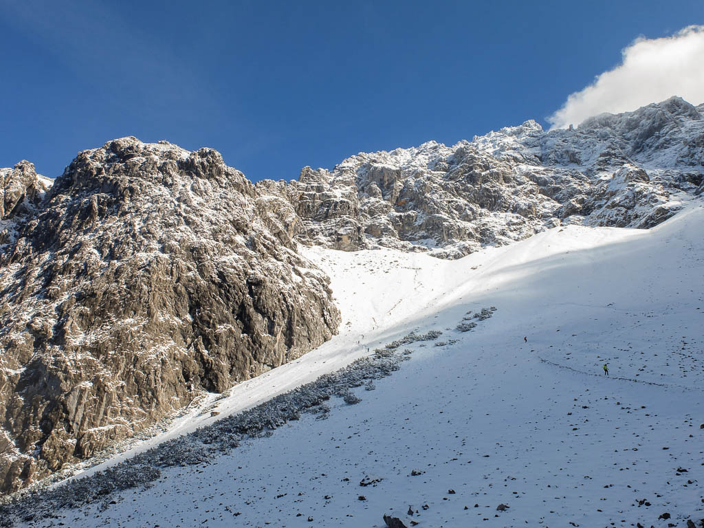 Wie erwartet liegt heute schon weit unterhalb der Dammkar-Hütte Schnee. Aber gerade das Stapfen durch den Schnee macht mir viel Spaß. Hier sieht man die letzten etwa 300 Höhenmeter zum Gipfel, es geht links über die Schneefläche hoch: