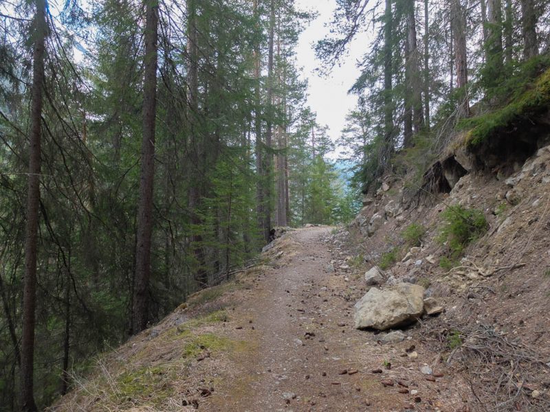 Nach einer kurzen Verschnaufpause geht es auf gleichem Weg – allerdings deutlich schneller – zurück zum Wiesener Bahnhof und von dort aus über einen zweiten Wanderweg zurück nach Schmitten. Zu Beginn eher gemächlich und flach, dann steil bergab und ziemlich abenteuerlich: