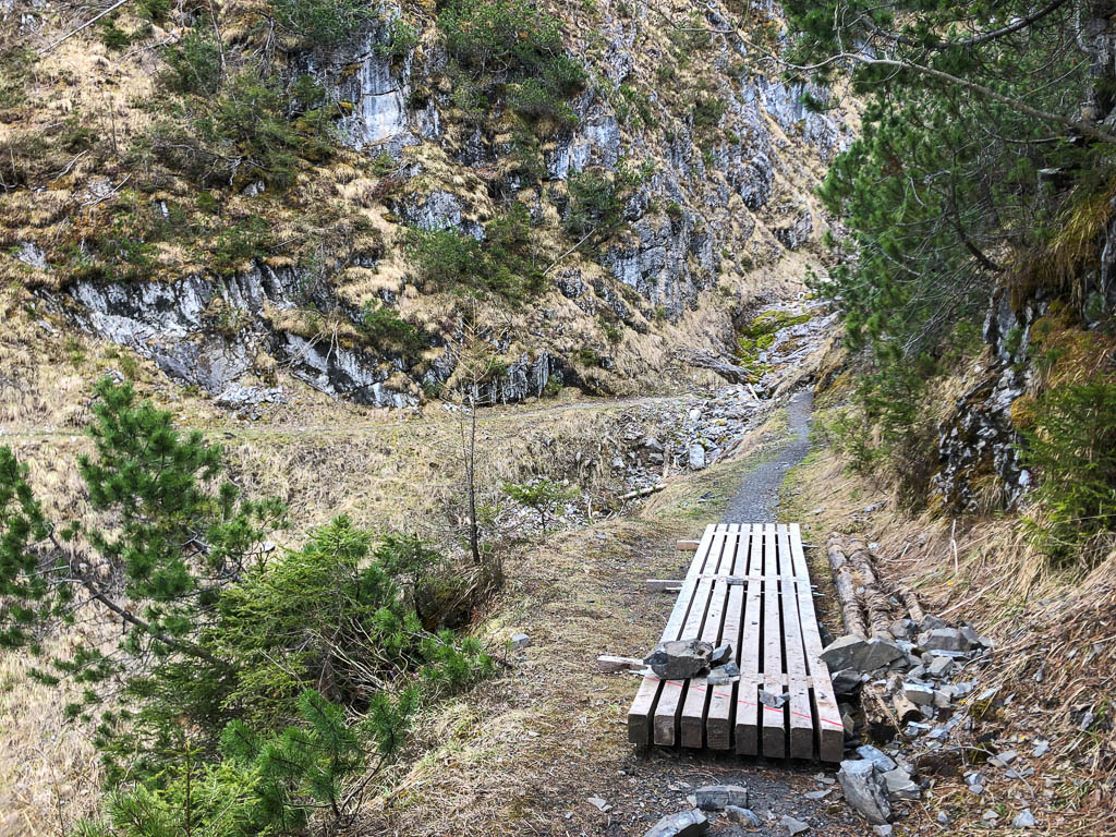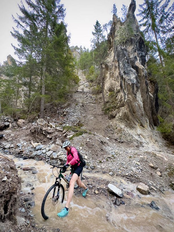 Nun ja, wer braucht hier schon eine Brücke, über die paar trockenen Steine kommt man auch ohne Brücke! Es folgt ein steiles Waldstück, das ich hinaufschieben muss. Dann geht es erneut recht gemütlich weiter, bis sich uns dieser Anblick bietet: