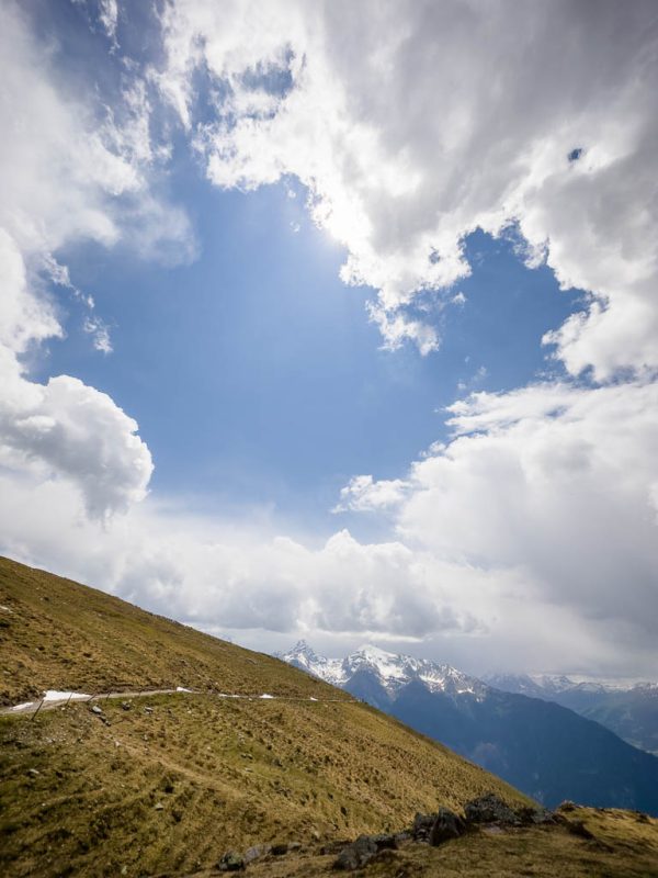 Während ich und mein Rad langsam noch oben bewege, höre ich es in der Ferne immer wieder Rumpeln und Poltern. Auf der gegenüberliegenden Talseite liegt nämlich das von einem Bergsturz gefährdete Dorf Brienz. Wenn die Bäume die Sicht freigeben, sieht man außerdem Staubwolken über Brienz schweben. Allerdings scheinen es immer nur kleinere Mengen an Gestein zu sein, die abgehen. Auf den ersten Blick sehen Dorf und Umgebung nämlich noch recht „normal“ aus.