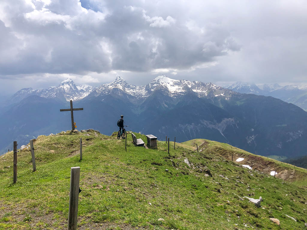 Schließlich kann aber auch ich wieder in den Sattel steigen und den Blick vom Weg auf Piz Toissa und Piz Curvér genießen: