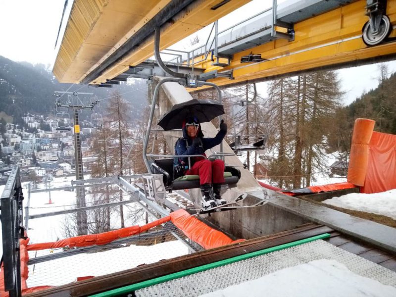 Als ich morgens aus dem Haus gehe, regnet es in Schmitten in Strömen. In Davos sieht es nicht anders aus. Gut, dass ich einen Schirm dabei habe und so halbwegs trocken mit dem Zweier-Sessellift nach oben komme:
