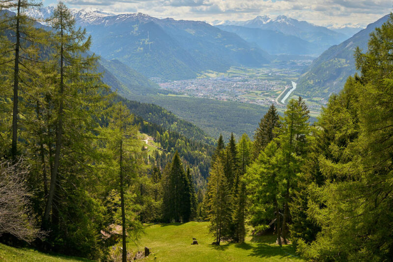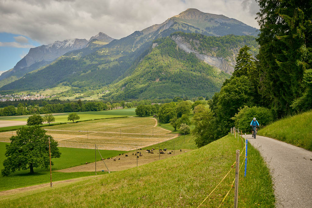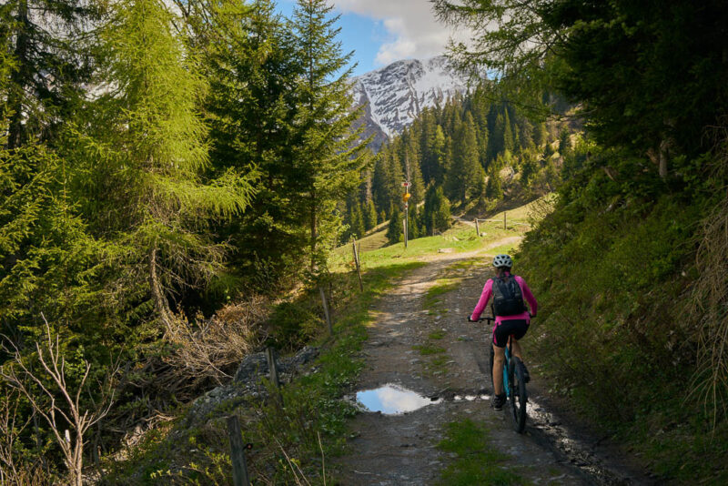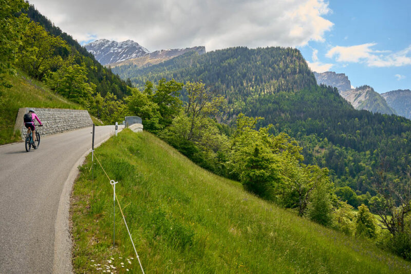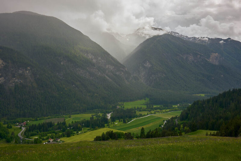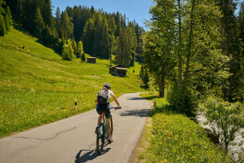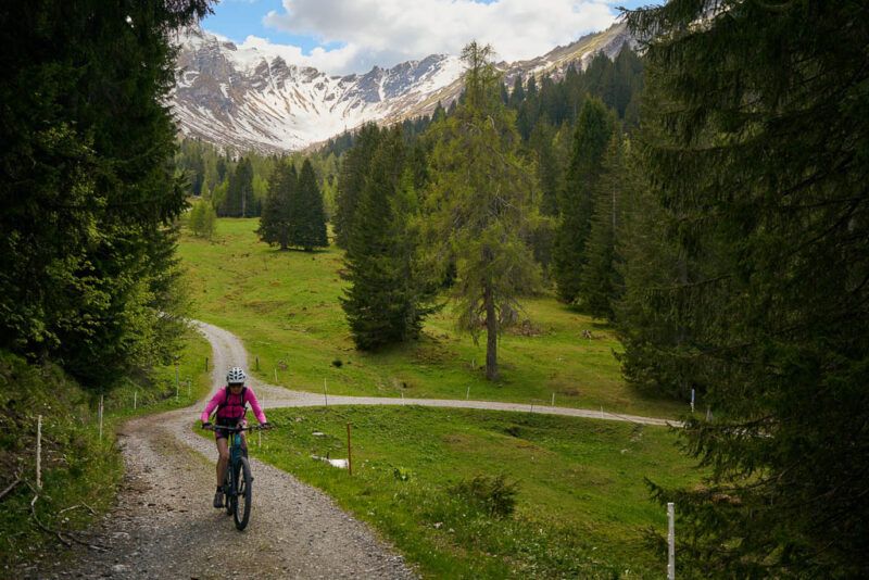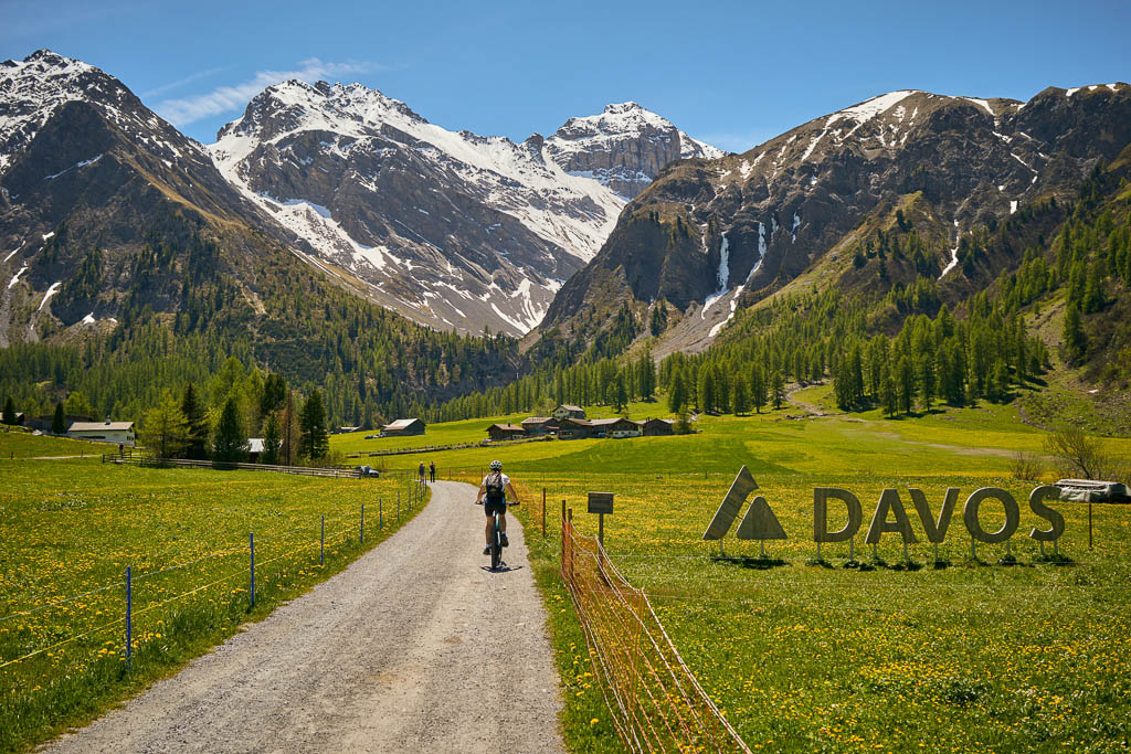 Bei strahlendem Sonnenschein und sommerlichen Temperaturen starten wir heute in Davos Glaris zu einer Radtour ins Sertigtal. Das Sertigtal ist ein südliches Seitental des Landwassertals und gehört zur Gemeinde Davos. Geologisch wurde es während der letzten Eiszeit durch Gletscher geformt – entsprechend U-förmig ist sein Querschnitt. Während Guido das Tal schon unzählige Male durchfahren hat, ist es erst mein zweiter Besuch als Radlerin. Statt über die nach Davos führende Hauptstraße das Sertigtal zu erreichen, wählen wir ruhige Seitenstraßen – hier der Blick kurz vor Davos-Frauenkirch: