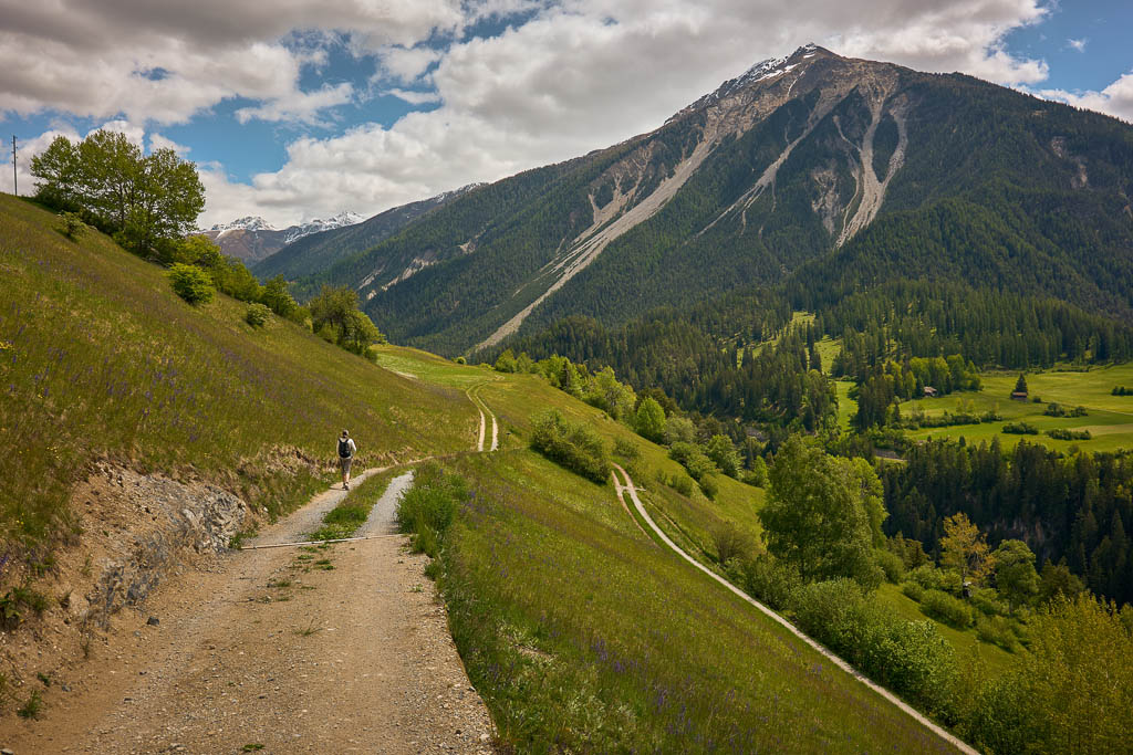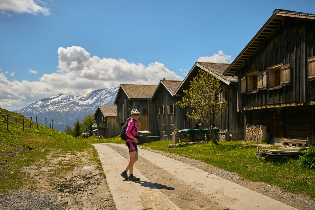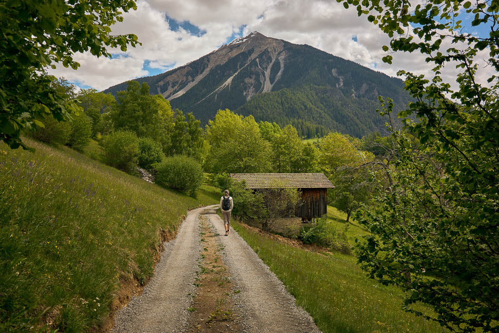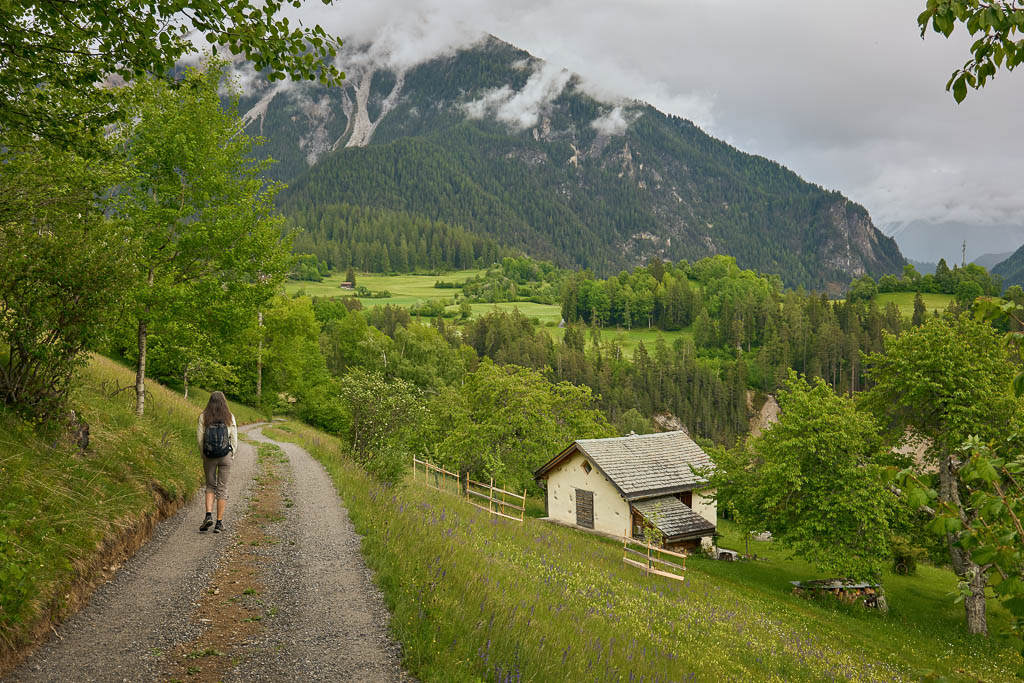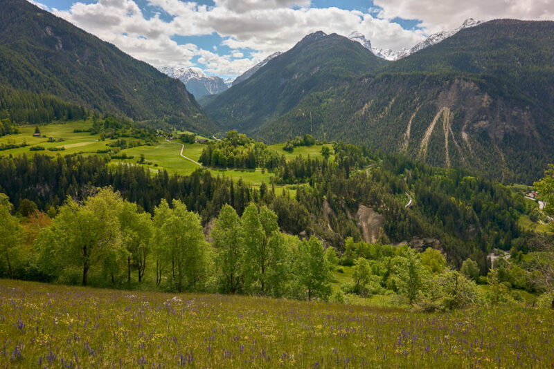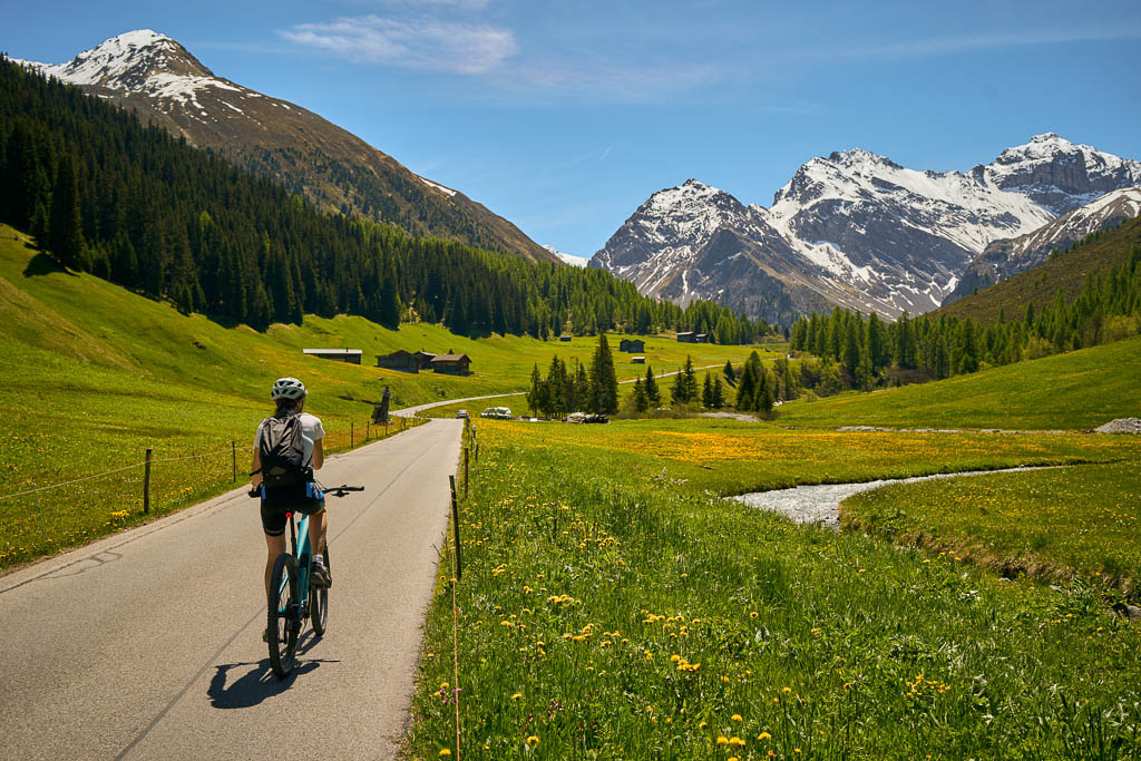 Die Landschaft zeigt sich um diese Jahreszeit von ihrer schönsten Seite: saftig grüne Wiesen, übersät mit Blüten. Entgegen meiner Befürchtung ist der Verkehr angenehm gering. Trotz der moderaten Steigung bringt mich die Wärme ordentlich ins Schwitzen. Schließlich erreichen wir Sertig Dörfli:
