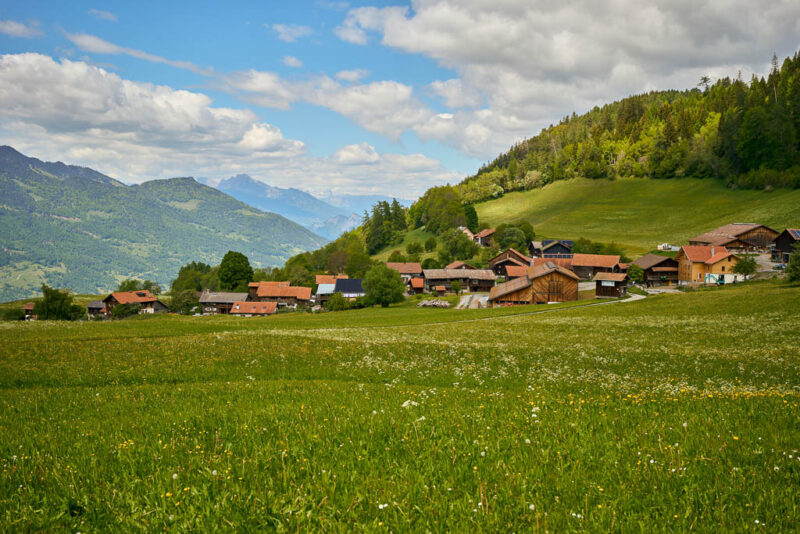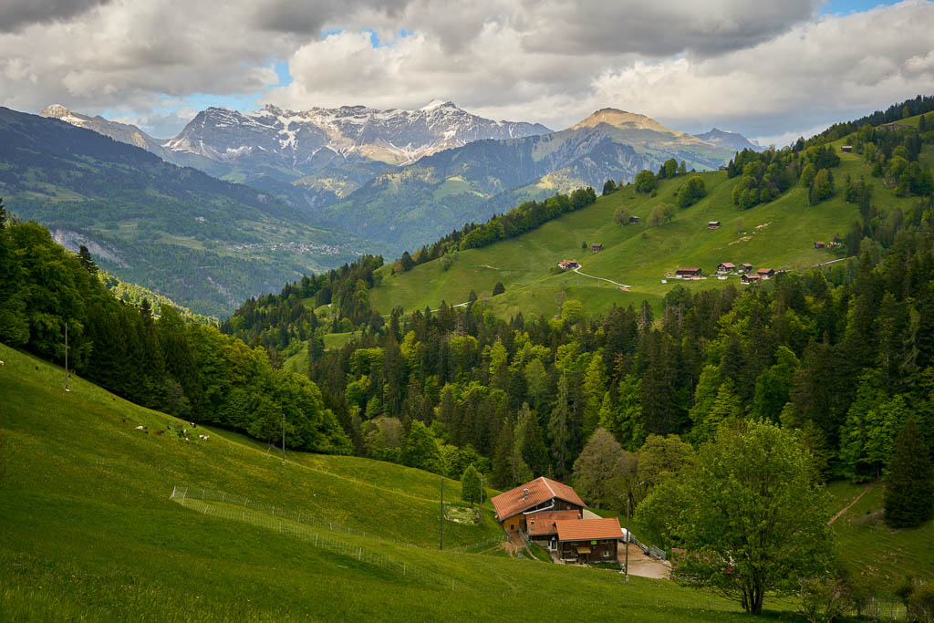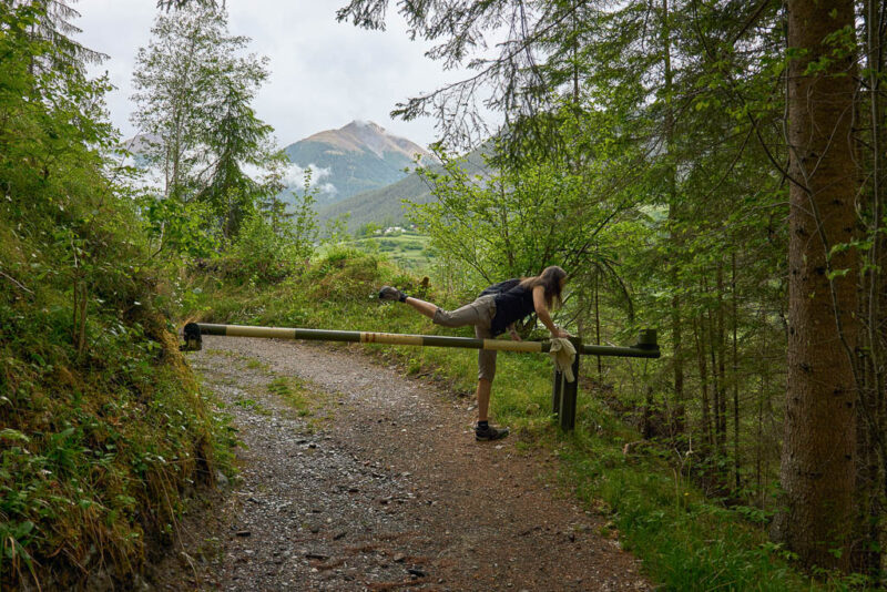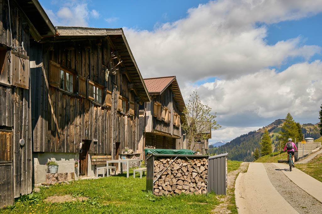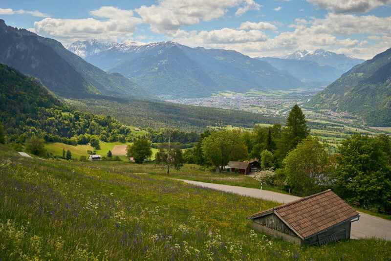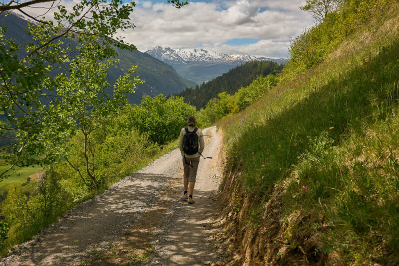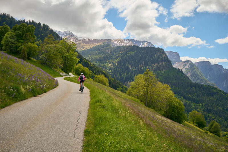 Die Landschaft zeigt sich um diese Jahreszeit von ihrer schönsten Seite: saftig grüne Wiesen, übersät mit Blüten. Entgegen meiner Befürchtung ist der Verkehr angenehm gering. Trotz der moderaten Steigung bringt mich die Wärme ordentlich ins Schwitzen. Schließlich erreichen wir Sertig Dörfli:
