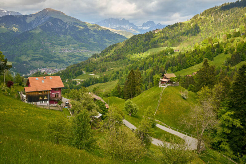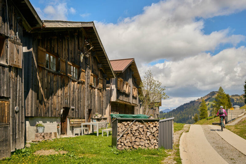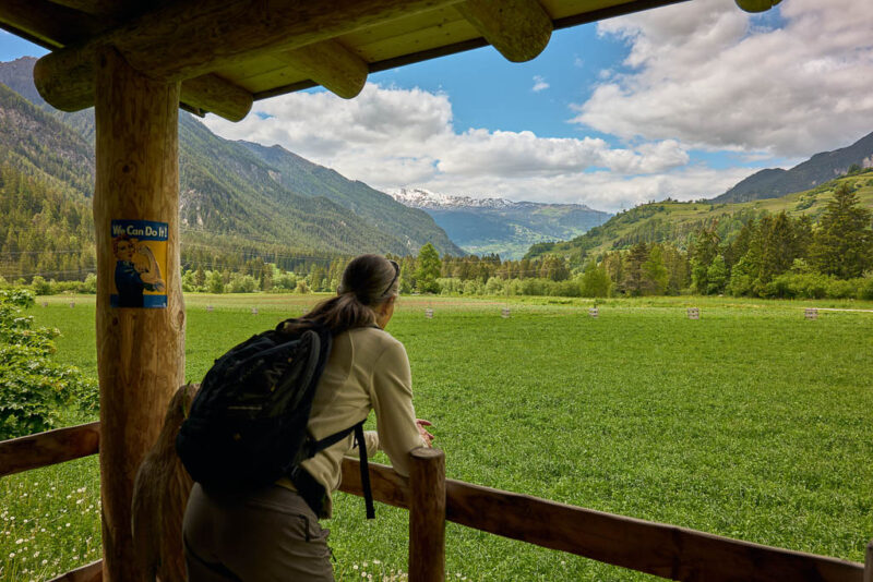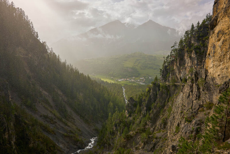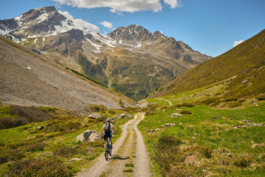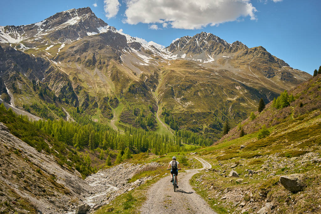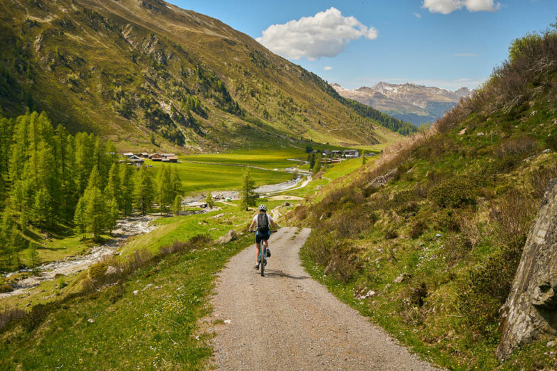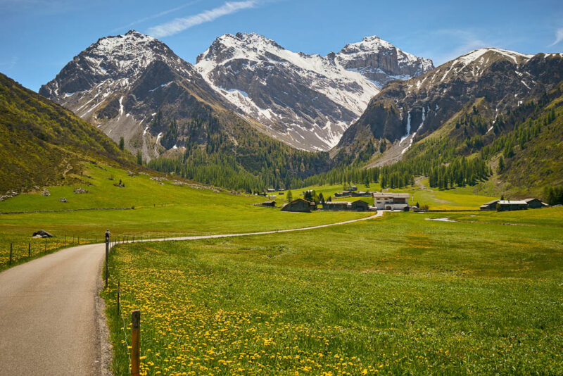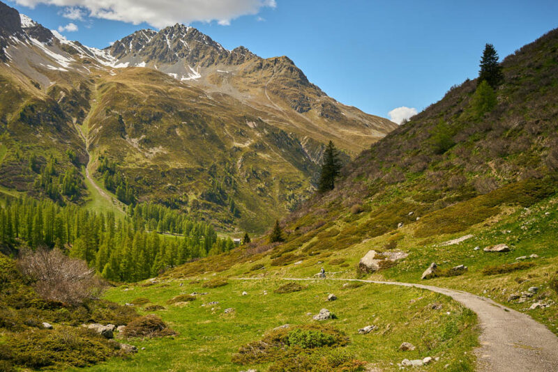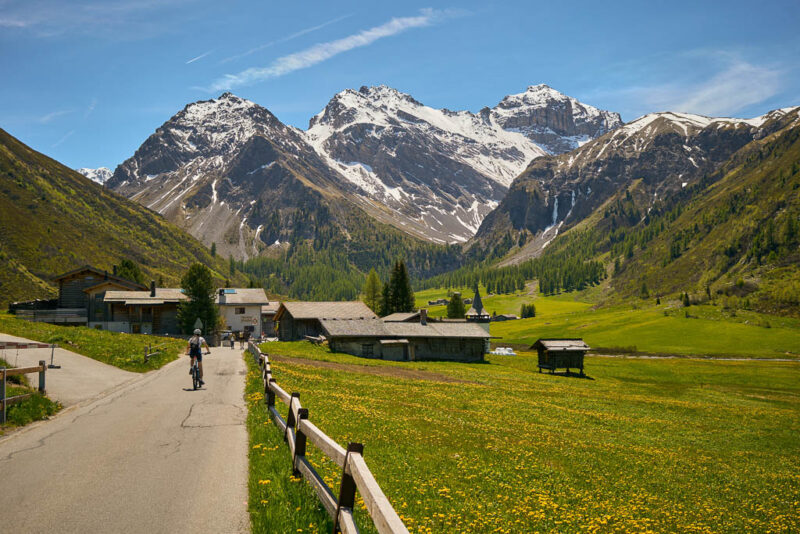 Der Weiler Sertig-Dörfli liegt auf rund 1.860 Metern Höhe und gilt mit seinen traditionellen Walserhäusern als Postkartenmotiv par excellence. Früher lebten hier Bauernfamilien in fast völliger Abgeschiedenheit, heute ist das Tal ein beliebtes Ziel für Wanderer und Biker. Von Sertig Dörfli geht es weiter nach Sertig Sand: