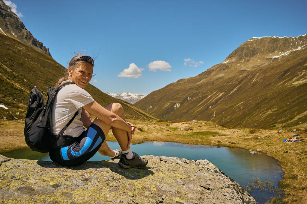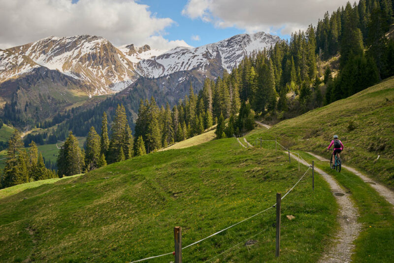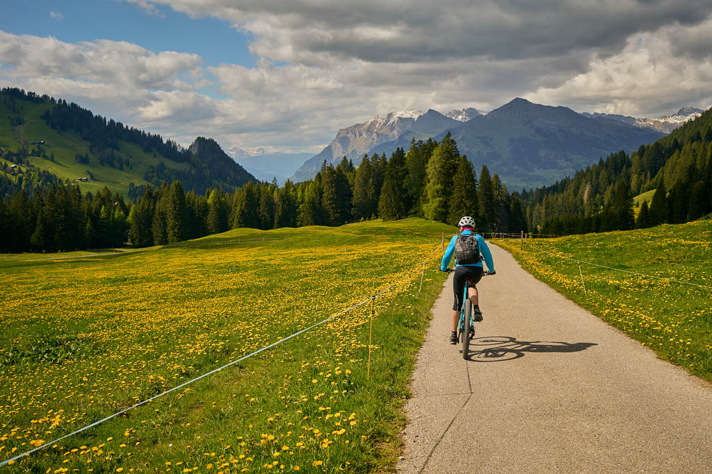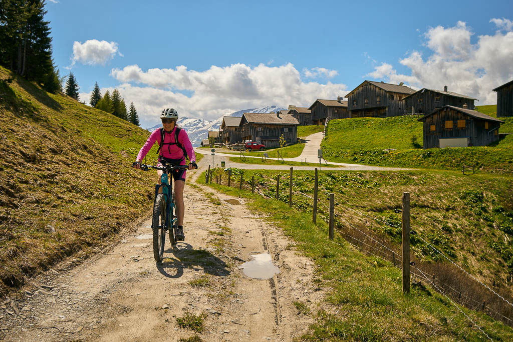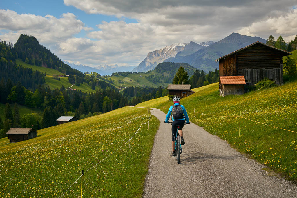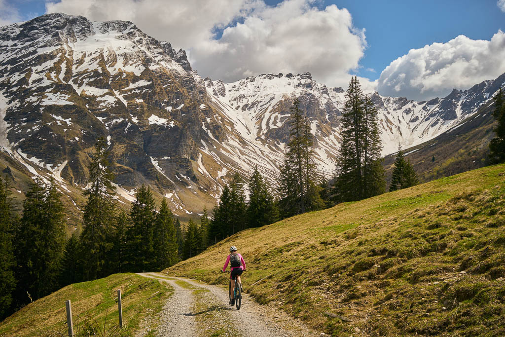 In Sertig Sand müssen wir uns durch Touristengruppen schlängeln. Doch dahinter beginnt die traumhafte Abfahrt durchs Sertigtal: Die Wiesen leuchten in satten Farben, ganze Felder voller goldgelber Löwenzahnblüten wechseln sich ab mit flächigem Blau der Vergissmeinnichte. Dazwischen setzen rostbraune Ampferstauden und die leuchtend roten Köpfe der Lichtnelken markante Akzente. Mit jeder Wegbiegung zeigt sich das Tal von einer neuen Seite – ein ständiges Spiel der Farben. Viel zu schnell erreichen wir Davos-Frauenkirch und nach einigen letzten Höhenmetern dann unseren Ausgangspunkt.