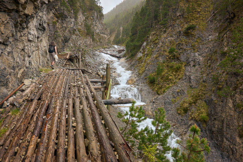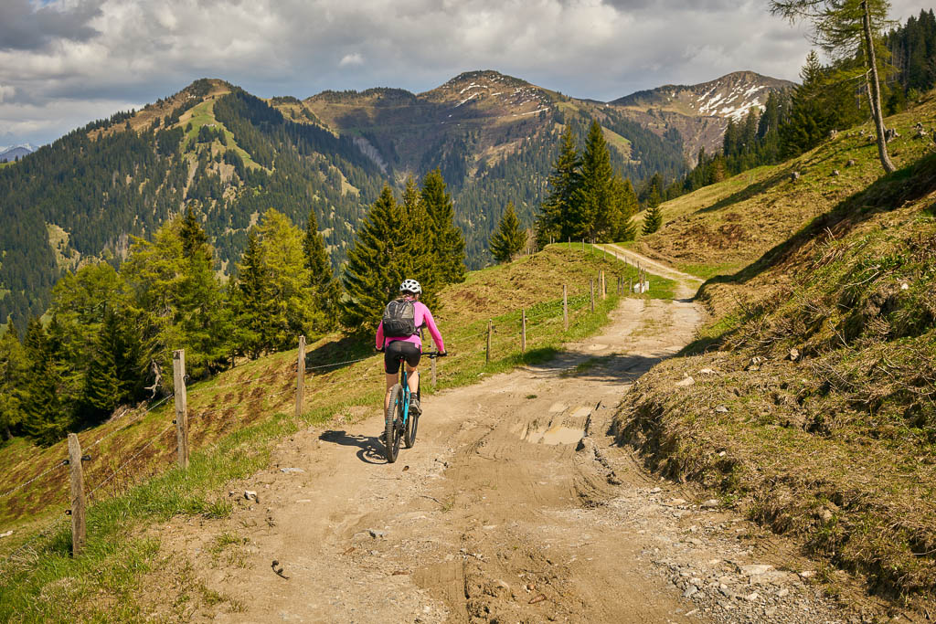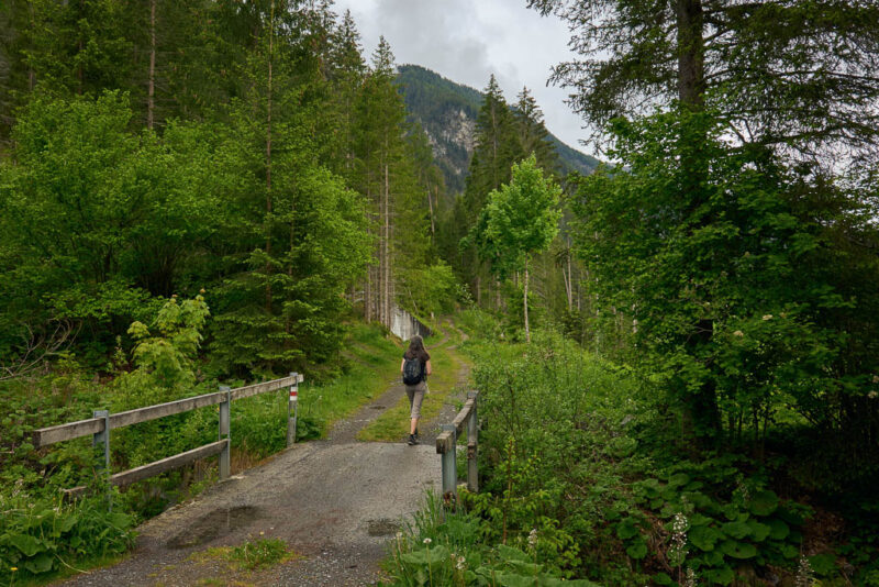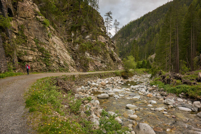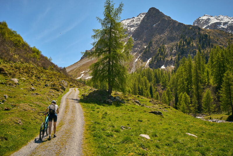 Von hier aus wollen wir durchs Kühalptal bis zum Grünsee fahren. Doch schon nach wenigen Metern muss ich absteigen – aus „fahren“ wird „schieben“: