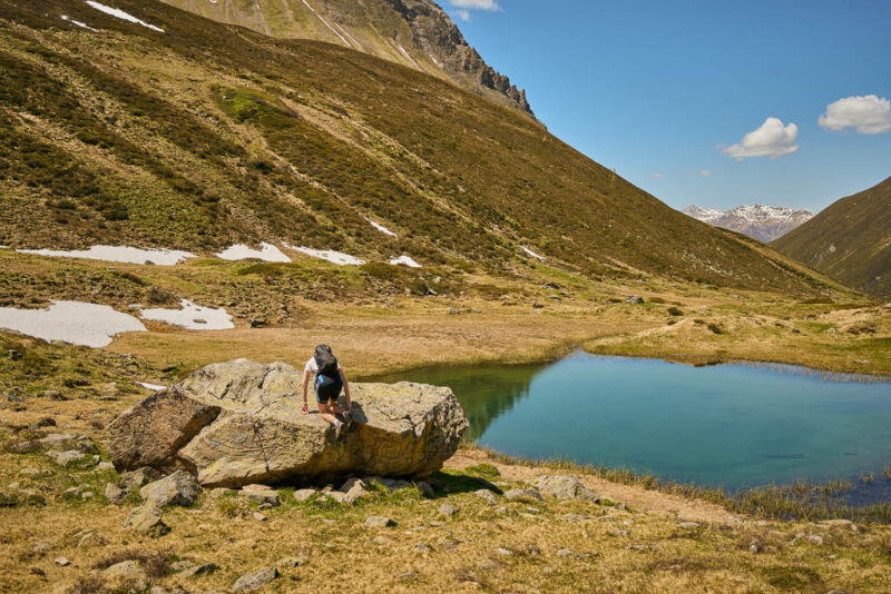 Am Ufer des Sees lockt ein großer Felsbrocken: