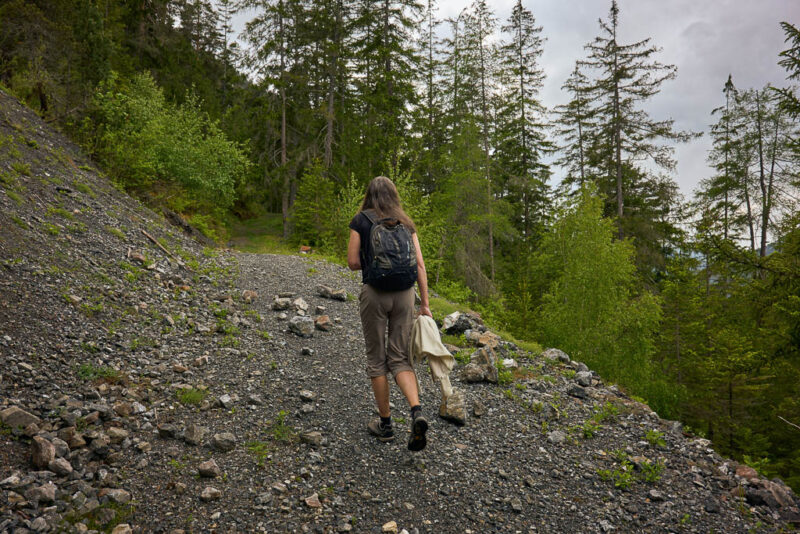 Doch ob rollend oder schiebend: Irgendwann ist es geschafft! Das Schild zum Grünsee markiert das Ziel – der See selbst versteckt sich hinter einem Hügel: