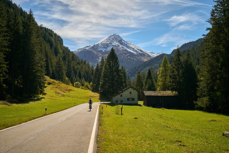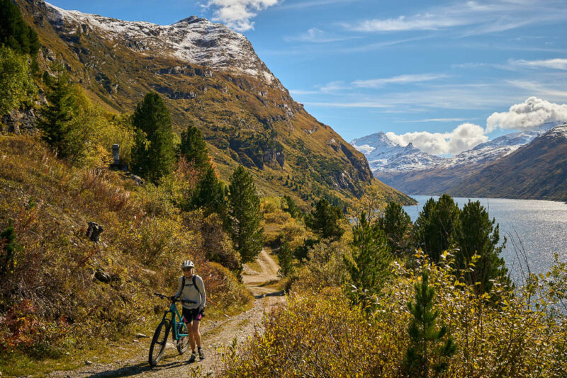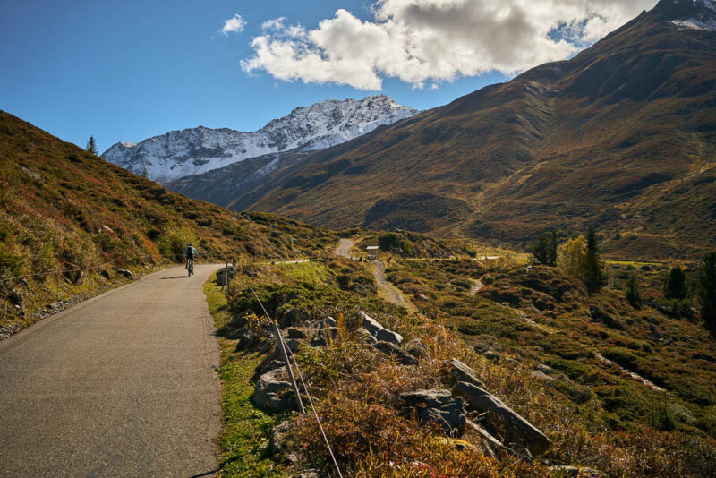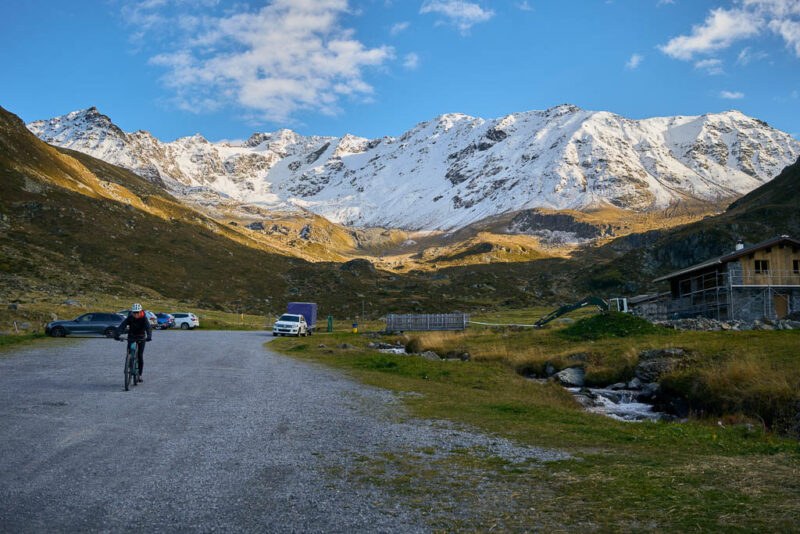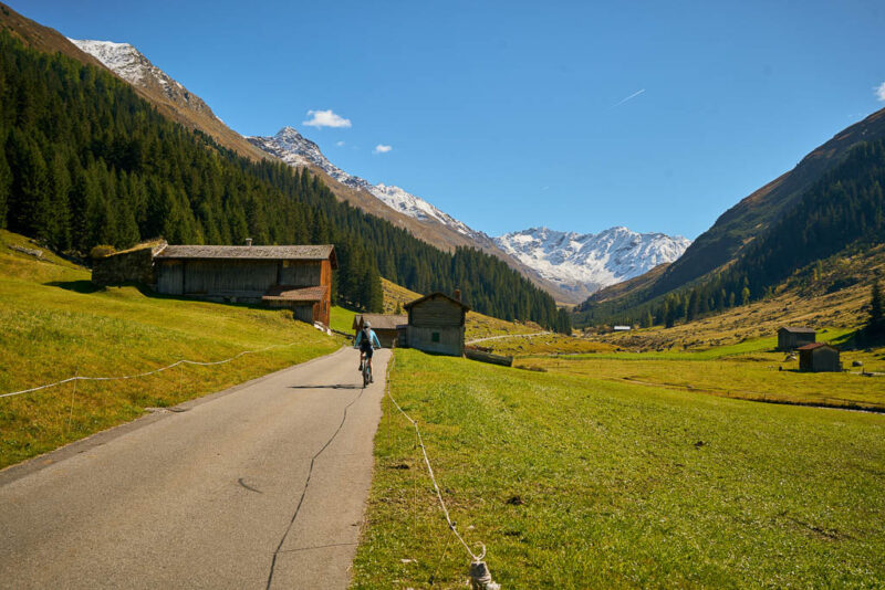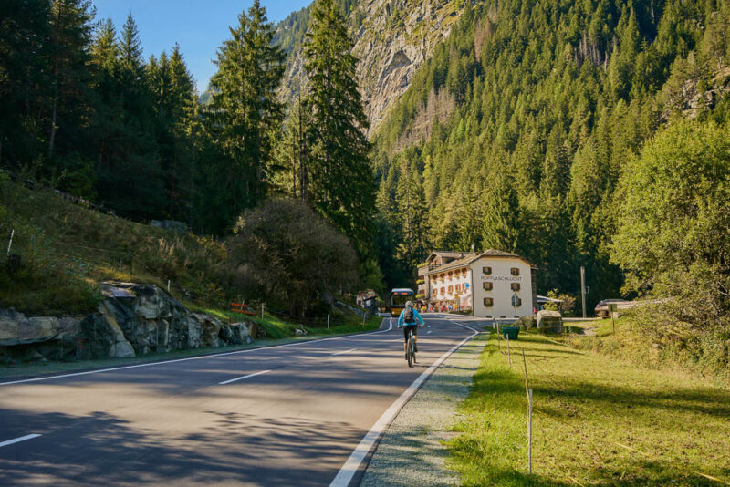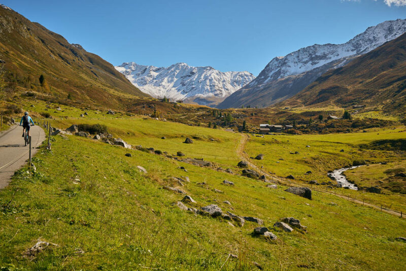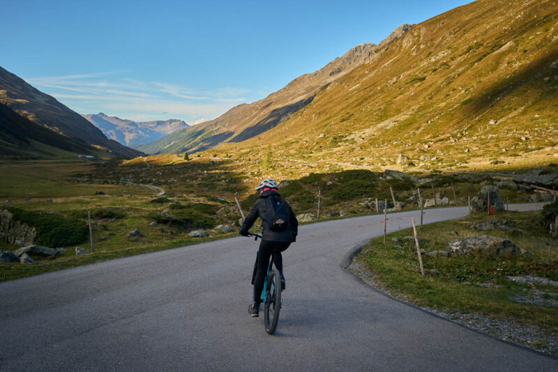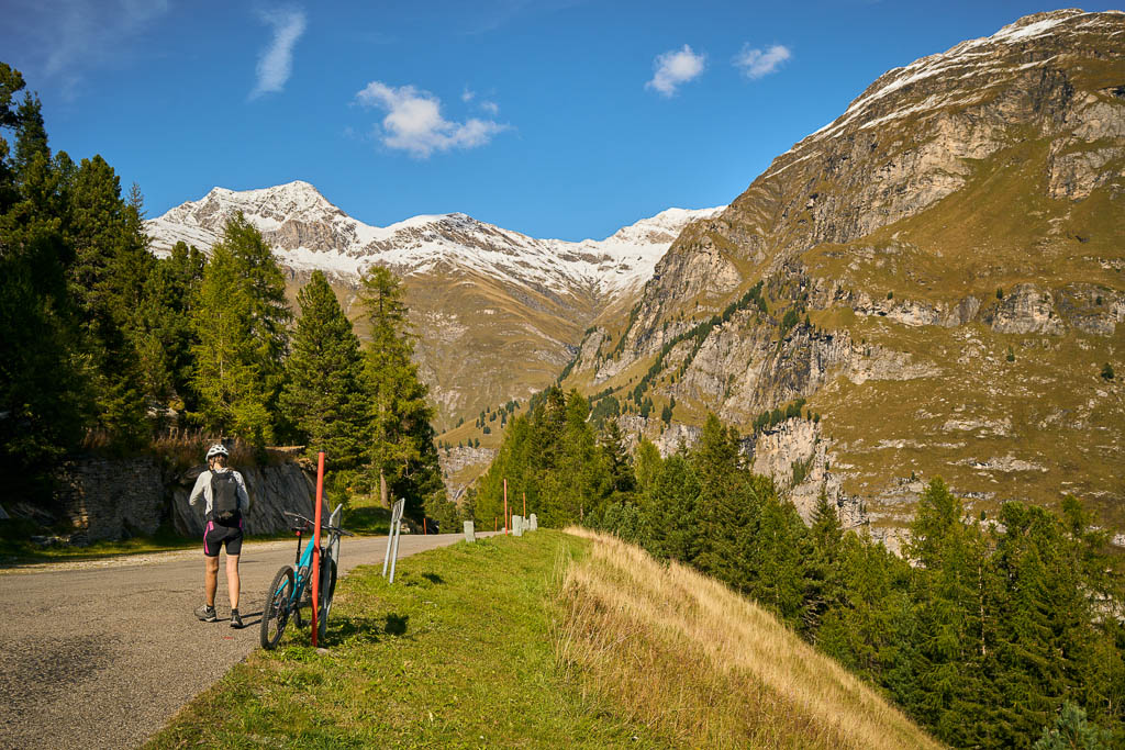 Ausgangspunkt der heutigen Tour ist das auf 945 Höhenmetern gelegene Dorf Zillis. Es ist bekannt für seine romanische Kirche St. Martin mit der berühmten bemalten Kassettendecke. Wir parken unser Auto neben der Kirche, steigen aber nicht ins kulturelle Erbe ein, sondern in den Sattel unserer Räder und starten zur heutigen Tour. Von Zillis aus führt der Weg zunächst gemütlich dem Hinterrhein entlang bis nach Andeer: Andeer liegt auf einer Sonnenterrasse und ist für sein Mineralbad berühmt. Im Dorfzentrum von Andeer: Hinter Andeer steigt die Straße spürbar an und erreicht bald das Kraftwerk Lai da Sera bei Bärenburg. Wenige Kilometer weiter liegt das traditionsreiche Gasthaus Roflaschlucht, das direkt am Eingang zur gleichnamigen, tief eingeschnittenen Schlucht thront: Kurz hinter dem Gasthaus zweigt von der nach Sufers und weiter zum Splügen- bzw. Bernadinopass führenden Straße die ins Val Ferrera führende Route ab. Der lange Straßenabschnitt nach Ausserferrera und Innerferrera ist landschaftlich wunderschön: wenig Verkehr, viel Natur. Begleitet werden wir vom Ragn da Ferrera, dessen türkisblaues Wasser zwischen riesigen Felsblöcken tost. Die Felsen sind ein beliebtes Ziel für Kletterer, in Ausserferrera können im Dorfrestaurant sogar Crashpads für Boulderer gemietet werden: Auf dem Weg von Ausserferrera nach Innerferrera: Kurz vor Innerferrera: Hinter Innerferrera wird die Szenerie noch wilder: Zahlreiche Felsgalerien, kurze Tunnels und eine imposante Brücke prägen die Strecke ins hintere Tal. Am Punt di Val di Lei führt eine Brücke über einen reißenden Seitenbach. Hier trifft der Reno di Lei aus dem hochgelegenen Stausee im Valle di Lei auf den Ragn da Ferrera, und zugleich verläuft auf dieser Brücke die Schweizer-italienische Grenze. Von hier sind es noch etwa anderthalb Kilometer bis zur Abzweigung ins Valle di Lei. Ab der Abzweigung wird die Straße spürbar steiler, mit einer Steigung von knapp über 9 % aber gut fahrbar. Bald erreichen wir den Eingang des rund einen Kilometer langen Tunnels, der direkt zur Staumauer des Lago di Lei führt. Eine Ampel zwingt uns kurz zum Warten. Doch schon nach wenigen Minuten schaltet sie auf Grün, wir durchqueren den Tunnel und stehen kurz darauf unmittelbar vor der Staumauer: Ein kleiner Anstieg noch – dann liegt der Lago di Lei vor uns: Der See wurde in den 1960er Jahren zur Nutzung der Wasserkraft angelegt. Ein ganzes Tal verschwand unter den Wassermassen. Obwohl die Staumauer auf Schweizer Boden liegt, gehört der größte Teil des Sees politisch zu Italien. Guido hat schon einmal die zehn Kilometer lange Strecke bis zum Ende des Sees erkundet: Nach Italien ins Valle di Lei. Dafür ist es heute zu spät, aber eine Fahrt über die Staumauer lassen wir uns nicht entgehen: Von der Staumauer des Lago di Lei reicht der Blick nordwärts ins Val digl Uors: Tief unten windet sich der Torrente Reno di Lei durch ein von Lärchen und Fichten geprägtes Tal, links liegen Maiensässe und Alpweiden. Der Name „Val digl Uors“ stammt aus dem Rätoromanischen und bedeutet „Tal der Bären“ (uors = Bär). Er erinnert daran, dass in dieser abgeschiedenen Gegend früher tatsächlich Bären heimisch waren. Der Blick zurück zum Tunnelportal: Das andere Ende der Staumauer: Wir fahren noch ein Stück weiter und blicken auf den am anderen Ufer verlaufenden Saumweg zum Passo del Scengio: Der in der Sonne leuchtende Weg lässt uns nicht los, spontan beschließen wir, den Rückweg über den Pass zu nehmen. Die ersten Meter sind noch fahrbar: Dann beginnt für mich die zwei Kilometer lange Schiebestrecke hinauf zum Pass: Ich genieße das gemächliche Vorankommen, während Guido im Sattel sitzend über Stock und Stein nach oben rumpelt. Schließlich erreichen wir den Passo del Scengio: Hier parkieren wir unsere Räder und wandern zunächst zu einem Aussichtspunkt südlich des Passes mit traumhaftem Tiefblick auf den Stausee: Anschließend geht es Richtung Norden auf einen kleinen Hügel: Hier liegt der Piz Grisch direkt vor unserer Nase und links davon reicht die Sicht bis zum Ringelspitz: So schön es hier auch ist, irgendwann heißt es Abschied nehmen. Wir steigen wieder auf unsere Räder und stürzen uns in die Abfahrt über den steinigen und holprigen Wanderweg: Für mich nicht unbedingt ein Vergnügen, aber ich bleibe im Sattel sitzen: Das Tempo auf dem Wanderweg ist gemächlich, die fehlende Sonne kaum spürbar. Auf der Straße aber erhöht sich die Geschwindigkeit, und die Fahrt durchs Val Ferrera wird zu einer eiskalten Angelegenheit. Erst kurz vor Zillis kommen wir noch einmal in den Genuss der warmen Abendsonne. Mein Fazit: Toureninfos: