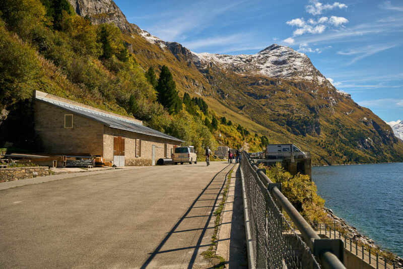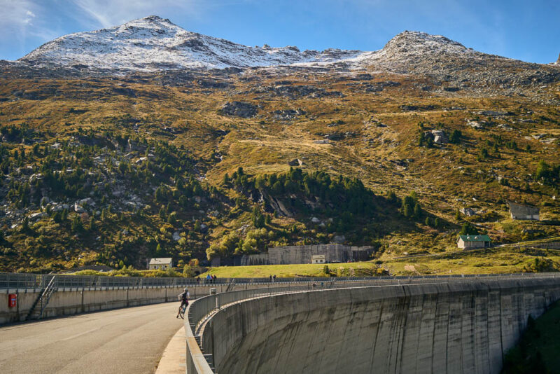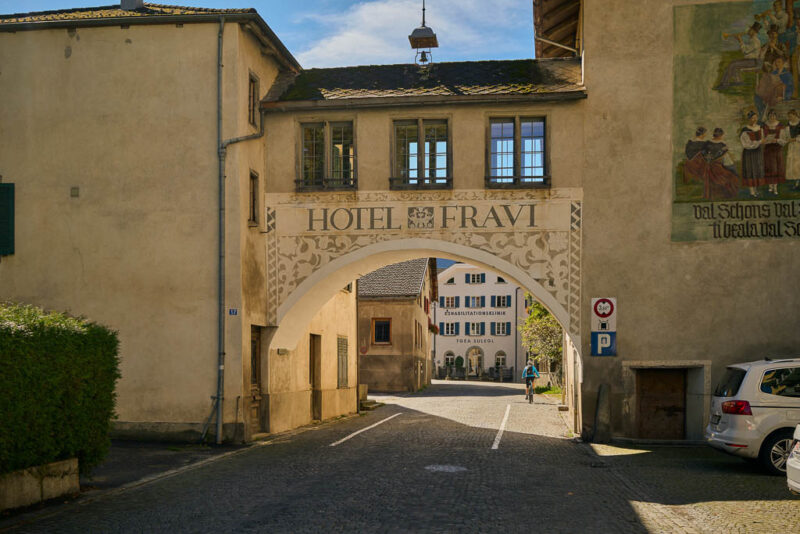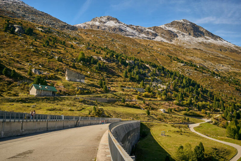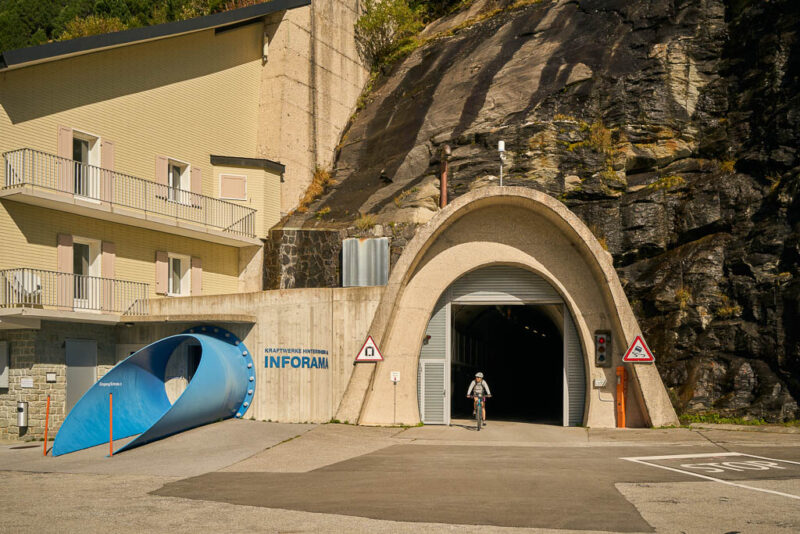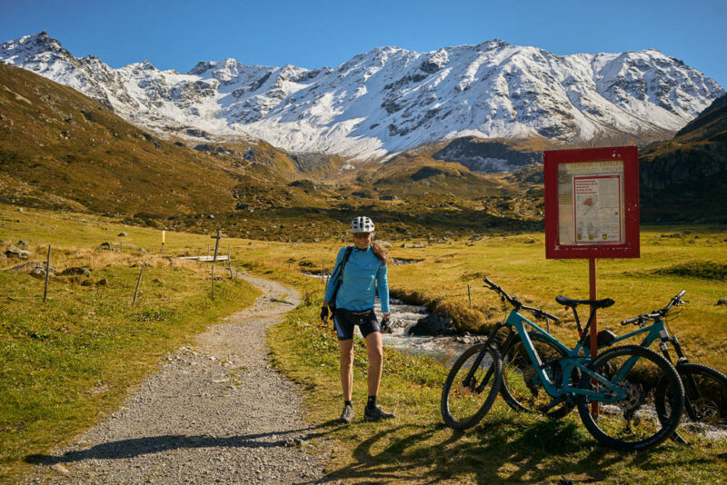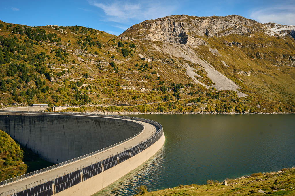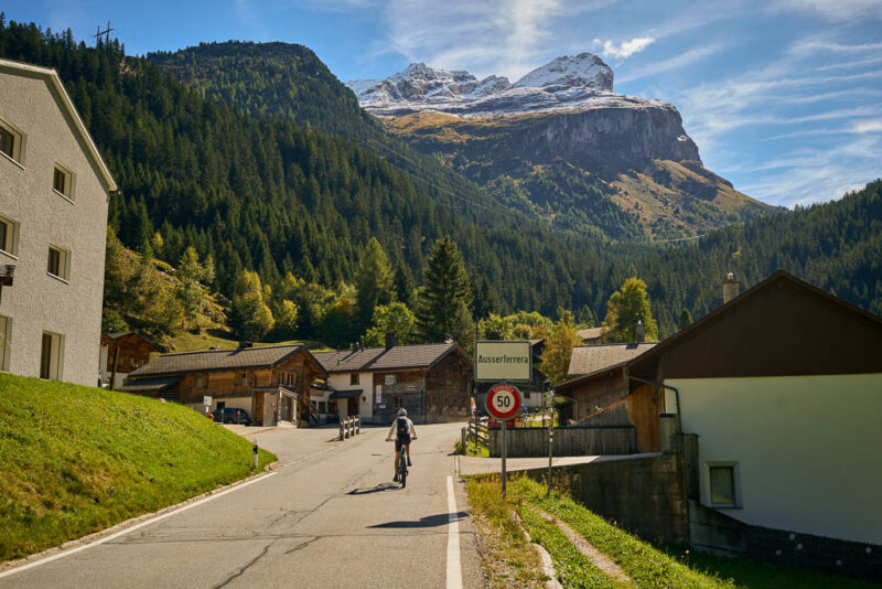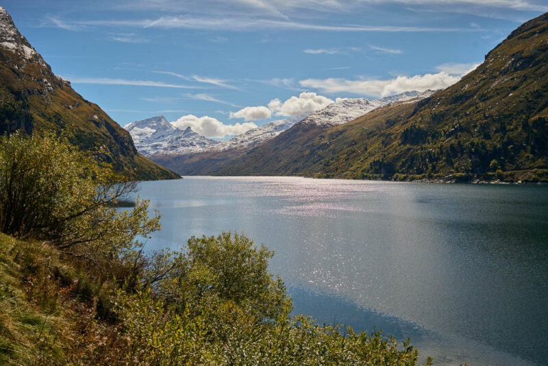 Ausgangspunkt der heutigen Tour ist das auf 945 Höhenmetern gelegene Dorf Zillis. Es ist bekannt für seine romanische Kirche St. Martin mit der berühmten bemalten Kassettendecke. Wir parken unser Auto neben der Kirche, steigen aber nicht ins kulturelle Erbe ein, sondern in den Sattel unserer Räder und starten zur heutigen Tour. Von Zillis aus führt der Weg zunächst gemütlich dem Hinterrhein entlang bis nach Andeer: Andeer liegt auf einer Sonnenterrasse und ist für sein Mineralbad berühmt. Im Dorfzentrum von Andeer: Hinter Andeer steigt die Straße spürbar an und erreicht bald das Kraftwerk Lai da Sera bei Bärenburg. Wenige Kilometer weiter liegt das traditionsreiche Gasthaus Roflaschlucht, das direkt am Eingang zur gleichnamigen, tief eingeschnittenen Schlucht thront: Kurz hinter dem Gasthaus zweigt von der nach Sufers und weiter zum Splügen- bzw. Bernadinopass führenden Straße die ins Val Ferrera führende Route ab. Der lange Straßenabschnitt nach Ausserferrera und Innerferrera ist landschaftlich wunderschön: wenig Verkehr, viel Natur. Begleitet werden wir vom Ragn da Ferrera, dessen türkisblaues Wasser zwischen riesigen Felsblöcken tost. Die Felsen sind ein beliebtes Ziel für Kletterer, in Ausserferrera können im Dorfrestaurant sogar Crashpads für Boulderer gemietet werden: Auf dem Weg von Ausserferrera nach Innerferrera: Kurz vor Innerferrera: Hinter Innerferrera wird die Szenerie noch wilder: Zahlreiche Felsgalerien, kurze Tunnels und eine imposante Brücke prägen die Strecke ins hintere Tal. Am Punt di Val di Lei führt eine Brücke über einen reißenden Seitenbach. Hier trifft der Reno di Lei aus dem hochgelegenen Stausee im Valle di Lei auf den Ragn da Ferrera, und zugleich verläuft auf dieser Brücke die Schweizer-italienische Grenze. Von hier sind es noch etwa anderthalb Kilometer bis zur Abzweigung ins Valle di Lei. Ab der Abzweigung wird die Straße spürbar steiler, mit einer Steigung von knapp über 9 % aber gut fahrbar. Bald erreichen wir den Eingang des rund einen Kilometer langen Tunnels, der direkt zur Staumauer des Lago di Lei führt. Eine Ampel zwingt uns kurz zum Warten. Doch schon nach wenigen Minuten schaltet sie auf Grün, wir durchqueren den Tunnel und stehen kurz darauf unmittelbar vor der Staumauer: Ein kleiner Anstieg noch – dann liegt der Lago di Lei vor uns: Der See wurde in den 1960er Jahren zur Nutzung der Wasserkraft angelegt. Ein ganzes Tal verschwand unter den Wassermassen. Obwohl die Staumauer auf Schweizer Boden liegt, gehört der größte Teil des Sees politisch zu Italien. Guido hat schon einmal die zehn Kilometer lange Strecke bis zum Ende des Sees erkundet: Nach Italien ins Valle di Lei. Dafür ist es heute zu spät, aber eine Fahrt über die Staumauer lassen wir uns nicht entgehen: Von der Staumauer des Lago di Lei reicht der Blick nordwärts ins Val digl Uors: Tief unten windet sich der Torrente Reno di Lei durch ein von Lärchen und Fichten geprägtes Tal, links liegen Maiensässe und Alpweiden. Der Name „Val digl Uors“ stammt aus dem Rätoromanischen und bedeutet „Tal der Bären“ (uors = Bär). Er erinnert daran, dass in dieser abgeschiedenen Gegend früher tatsächlich Bären heimisch waren. Der Blick zurück zum Tunnelportal: Das andere Ende der Staumauer: Wir fahren noch ein Stück weiter und blicken auf den am anderen Ufer verlaufenden Saumweg zum Passo del Scengio: Der in der Sonne leuchtende Weg lässt uns nicht los, spontan beschließen wir, den Rückweg über den Pass zu nehmen. Die ersten Meter sind noch fahrbar: Dann beginnt für mich die zwei Kilometer lange Schiebestrecke hinauf zum Pass: Ich genieße das gemächliche Vorankommen, während Guido im Sattel sitzend über Stock und Stein nach oben rumpelt. Schließlich erreichen wir den Passo del Scengio: Hier parkieren wir unsere Räder und wandern zunächst zu einem Aussichtspunkt südlich des Passes mit traumhaftem Tiefblick auf den Stausee: Anschließend geht es Richtung Norden auf einen kleinen Hügel: Hier liegt der Piz Grisch direkt vor unserer Nase und links davon reicht die Sicht bis zum Ringelspitz: So schön es hier auch ist, irgendwann heißt es Abschied nehmen. Wir steigen wieder auf unsere Räder und stürzen uns in die Abfahrt über den steinigen und holprigen Wanderweg: Für mich nicht unbedingt ein Vergnügen, aber ich bleibe im Sattel sitzen: Das Tempo auf dem Wanderweg ist gemächlich, die fehlende Sonne kaum spürbar. Auf der Straße aber erhöht sich die Geschwindigkeit, und die Fahrt durchs Val Ferrera wird zu einer eiskalten Angelegenheit. Erst kurz vor Zillis kommen wir noch einmal in den Genuss der warmen Abendsonne. Mein Fazit: Toureninfos: