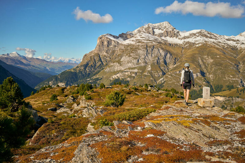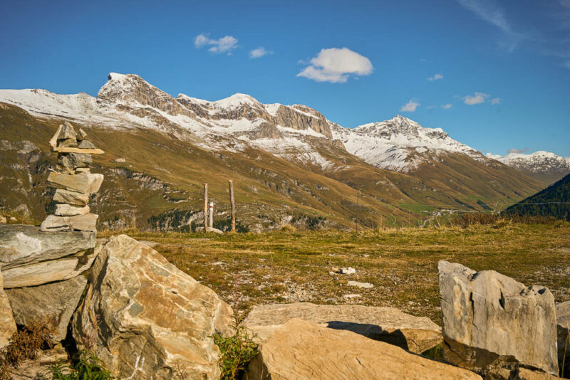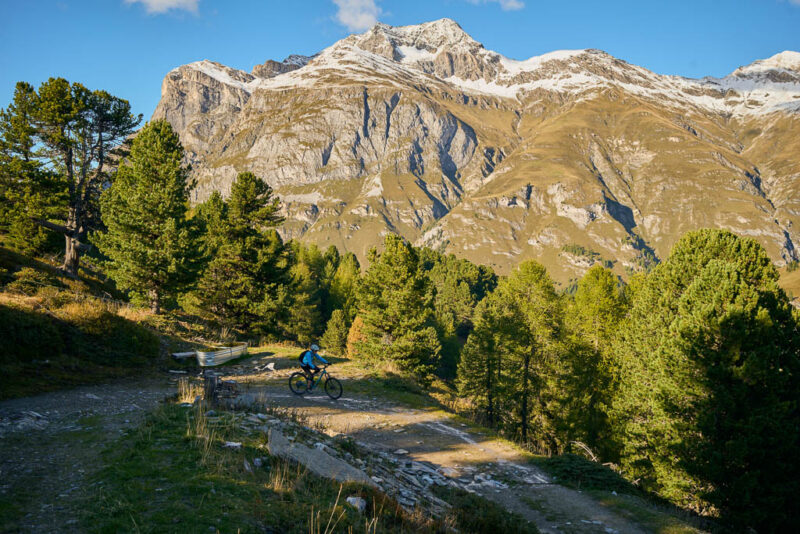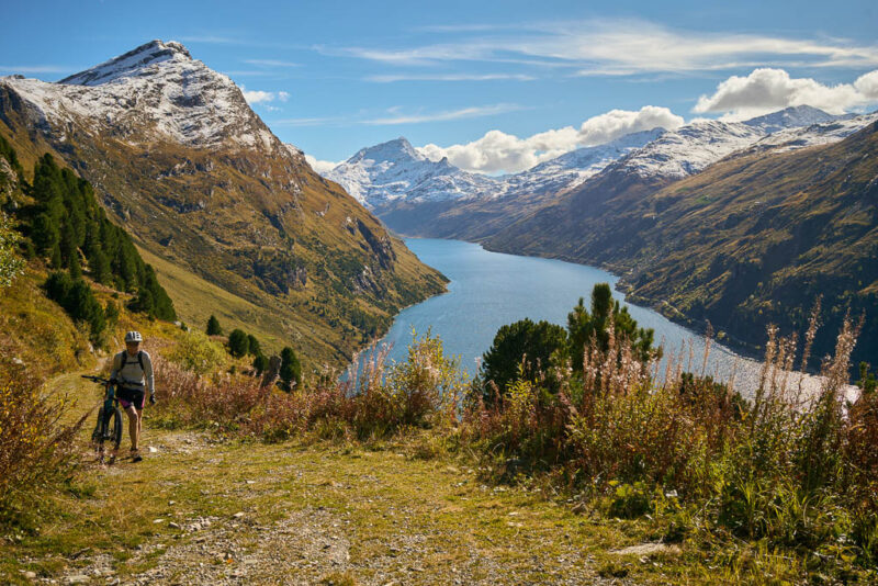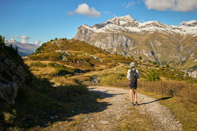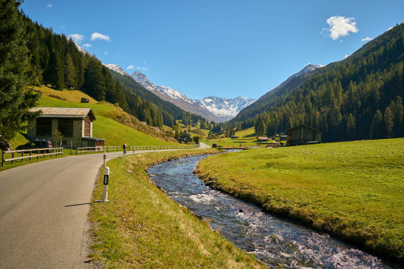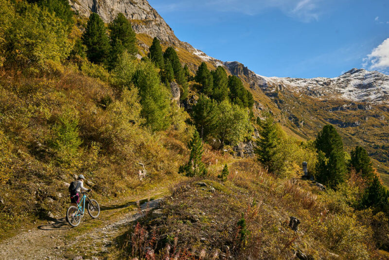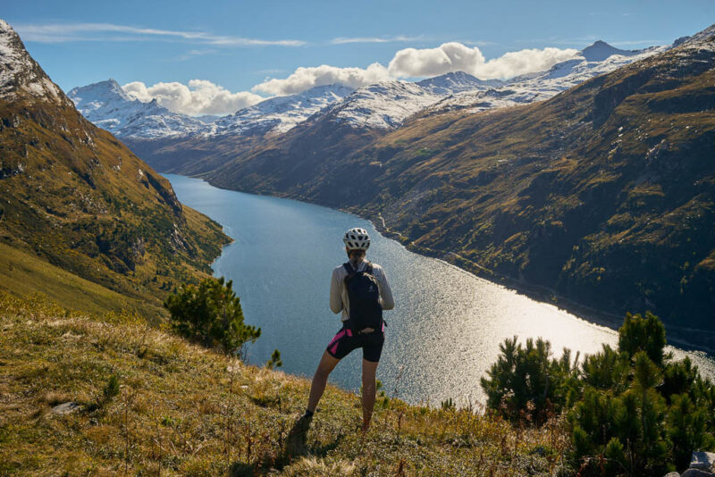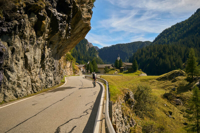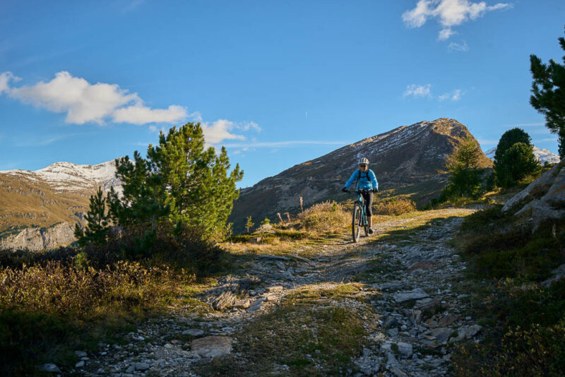 Ausgangspunkt der heutigen Tour ist das auf 945 Höhenmetern gelegene Dorf Zillis. Es ist bekannt für seine romanische Kirche St. Martin mit der berühmten bemalten Kassettendecke. Wir parken unser Auto neben der Kirche, steigen aber nicht ins kulturelle Erbe ein, sondern in den Sattel unserer Räder und starten zur heutigen Tour. Von Zillis aus führt der Weg zunächst gemütlich dem Hinterrhein entlang bis nach Andeer: Andeer liegt auf einer Sonnenterrasse und ist für sein Mineralbad berühmt. Im Dorfzentrum von Andeer: Hinter Andeer steigt die Straße spürbar an und erreicht bald das Kraftwerk Lai da Sera bei Bärenburg. Wenige Kilometer weiter liegt das traditionsreiche Gasthaus Roflaschlucht, das direkt am Eingang zur gleichnamigen, tief eingeschnittenen Schlucht thront: Kurz hinter dem Gasthaus zweigt von der nach Sufers und weiter zum Splügen- bzw. Bernadinopass führenden Straße die ins Val Ferrera führende Route ab. Der lange Straßenabschnitt nach Ausserferrera und Innerferrera ist landschaftlich wunderschön: wenig Verkehr, viel Natur. Begleitet werden wir vom Ragn da Ferrera, dessen türkisblaues Wasser zwischen riesigen Felsblöcken tost. Die Felsen sind ein beliebtes Ziel für Kletterer, in Ausserferrera können im Dorfrestaurant sogar Crashpads für Boulderer gemietet werden: Auf dem Weg von Ausserferrera nach Innerferrera: Kurz vor Innerferrera: Hinter Innerferrera wird die Szenerie noch wilder: Zahlreiche Felsgalerien, kurze Tunnels und eine imposante Brücke prägen die Strecke ins hintere Tal. Am Punt di Val di Lei führt eine Brücke über einen reißenden Seitenbach. Hier trifft der Reno di Lei aus dem hochgelegenen Stausee im Valle di Lei auf den Ragn da Ferrera, und zugleich verläuft auf dieser Brücke die Schweizer-italienische Grenze. Von hier sind es noch etwa anderthalb Kilometer bis zur Abzweigung ins Valle di Lei. Ab der Abzweigung wird die Straße spürbar steiler, mit einer Steigung von knapp über 9 % aber gut fahrbar. Bald erreichen wir den Eingang des rund einen Kilometer langen Tunnels, der direkt zur Staumauer des Lago di Lei führt. Eine Ampel zwingt uns kurz zum Warten. Doch schon nach wenigen Minuten schaltet sie auf Grün, wir durchqueren den Tunnel und stehen kurz darauf unmittelbar vor der Staumauer: Ein kleiner Anstieg noch – dann liegt der Lago di Lei vor uns: Der See wurde in den 1960er Jahren zur Nutzung der Wasserkraft angelegt. Ein ganzes Tal verschwand unter den Wassermassen. Obwohl die Staumauer auf Schweizer Boden liegt, gehört der größte Teil des Sees politisch zu Italien. Guido hat schon einmal die zehn Kilometer lange Strecke bis zum Ende des Sees erkundet: Nach Italien ins Valle di Lei. Dafür ist es heute zu spät, aber eine Fahrt über die Staumauer lassen wir uns nicht entgehen: Von der Staumauer des Lago di Lei reicht der Blick nordwärts ins Val digl Uors: Tief unten windet sich der Torrente Reno di Lei durch ein von Lärchen und Fichten geprägtes Tal, links liegen Maiensässe und Alpweiden. Der Name „Val digl Uors“ stammt aus dem Rätoromanischen und bedeutet „Tal der Bären“ (uors = Bär). Er erinnert daran, dass in dieser abgeschiedenen Gegend früher tatsächlich Bären heimisch waren. Der Blick zurück zum Tunnelportal: Das andere Ende der Staumauer: Wir fahren noch ein Stück weiter und blicken auf den am anderen Ufer verlaufenden Saumweg zum Passo del Scengio: Der in der Sonne leuchtende Weg lässt uns nicht los, spontan beschließen wir, den Rückweg über den Pass zu nehmen. Die ersten Meter sind noch fahrbar: Dann beginnt für mich die zwei Kilometer lange Schiebestrecke hinauf zum Pass: Ich genieße das gemächliche Vorankommen, während Guido im Sattel sitzend über Stock und Stein nach oben rumpelt. Schließlich erreichen wir den Passo del Scengio: Hier parkieren wir unsere Räder und wandern zunächst zu einem Aussichtspunkt südlich des Passes mit traumhaftem Tiefblick auf den Stausee: Anschließend geht es Richtung Norden auf einen kleinen Hügel: Hier liegt der Piz Grisch direkt vor unserer Nase und links davon reicht die Sicht bis zum Ringelspitz: So schön es hier auch ist, irgendwann heißt es Abschied nehmen. Wir steigen wieder auf unsere Räder und stürzen uns in die Abfahrt über den steinigen und holprigen Wanderweg: Für mich nicht unbedingt ein Vergnügen, aber ich bleibe im Sattel sitzen: Das Tempo auf dem Wanderweg ist gemächlich, die fehlende Sonne kaum spürbar. Auf der Straße aber erhöht sich die Geschwindigkeit, und die Fahrt durchs Val Ferrera wird zu einer eiskalten Angelegenheit. Erst kurz vor Zillis kommen wir noch einmal in den Genuss der warmen Abendsonne. Mein Fazit: Toureninfos: