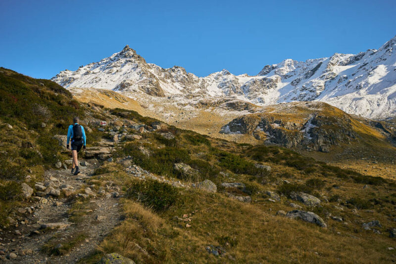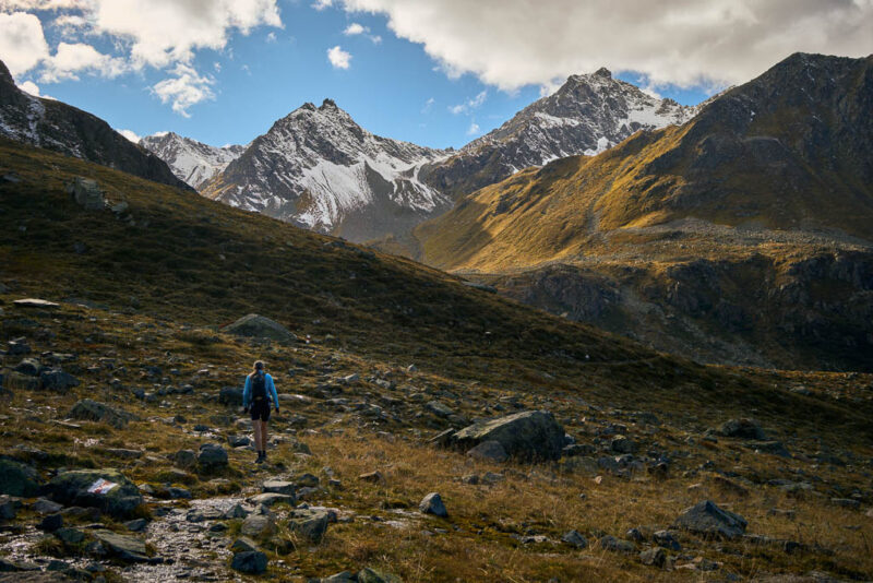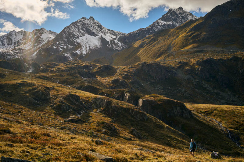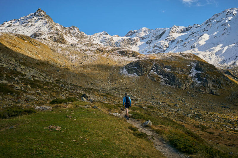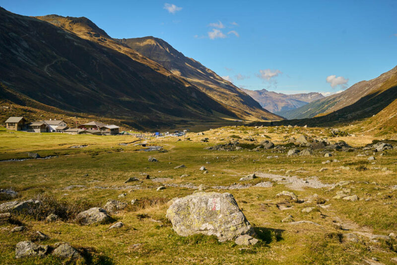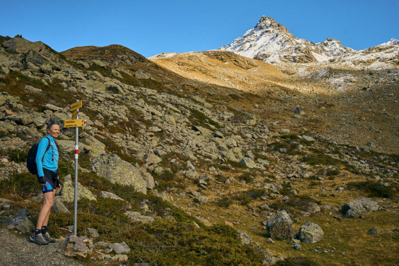 Startpunkt unserer heutigen Wanderung ist Monstein Dorf. Das kleine Walserdorf Monstein liegt auf etwa 1625 Meter auf einer Sonnenterrasse südlich von Davos und ist bekannt als das höchstgelegene Dorf im Landwassertal. Mit seinen traditionellen Blockhäusern und Schindeldächern hat es sich bis heute einen ursprünglichen Charakter bewahrt. Monstein ist weithin bekannt für seine kleine, aber feine Bergbrauerei, die als „höchstgelegene Brauerei Europas“ gilt. Hier sind wir schon am Dorfende und blicken über die Dächer von Monstein auf den Alteingrat: Vom Dorf aus geht es zunächst auf einer asphaltierten Fahrstraße hinauf nach Oberalp: Blick zurück, im Hintergrund ragt das Lenzer Horn empor: Nach dem kurzen, asphaltierten Wegstück geht es über einen geschotterten Fahrweg weiter: Noch strahlen die Lärchen nicht golden, nur die Zwergsträucher sind schon rötlich verfärbt: Wir erreichen die Hütten der Oberalp: Die Oberalp liegt auf rund 1900 bis 2000 Meter Höhe. Es handelt sich um ein typisches alpines Weidegelände, das von einem Bergbach durchzogen wird und von sanften Hängen eingefasst ist. Ein Einkehrmöglichkeit darf natürlich nicht fehlen und für viele endet hier schon ihre Wanderung: Wir marschieren jedoch zügig weiter: Je höher wir kommen, desto alpiner wird das Gelände und desto schmaler und steiniger der Pfad: Unterhalb von Fanezmeder säumen Bänder aus Heidel-, Preisel-, und Rauschbeere den Wegesrand. Hier und da hängen noch einzelne, tiefblaue oder rote Beeren an den Sträuchern. Mit zunehmender Höhe treten Arven und Lärchen, aber auch die Beeren zurück und es folgen alpine Rasengürtel: Ein Blick zurück: Über die weiten Flächen von Fanezmeder: Nach dem Anstieg über die Weideflächen führt der Weg durch einen gerölligen Kessel: Der letzte Anstieg zur Passhöhe: Auf der Passhöhe, hinter mir liegt die Ducan-Kette: Und neben mir ragt der Strel auf: Blick von der Passhöhe auf den Gipfel des Crachenhorns: Auf der Passhöhe weht ein heftiger Wind, so dass wir uns nicht allzu lange hier aufhalten und über das block- und schieferdurchsetzte Gelände ins Ducantal absteigen: Beim Abstieg von der Fanezfurgga öffnet sich das Ducantal wie ein karges, glazial geformtes Amphitheater. Das Gelände ist geprägt von Bündnerschiefer, dessen blaugraue bis violett schimmernde Platten ganze Hänge überziehen und nach Regen metallisch glänzen. Zwischen Schuttfeldern und kleinen Moränenrücken entspringen zahlreiche Quellen, die sich zu klaren Rinnsalen sammeln und den mäandrierenden Bach im Talgrund speisen. Es ist eine faszinierende, eindrucksvolle Landschaft: Die folgenden beiden Bilder zeigen eindrucksvoll die geologische Eigenart des Ducantals unterhalb der Fanezfurgga: Scharf aufragende Felstürme aus widerstandsfähigem Bündnerschiefer stehen wie Zähne im Vordergrund, während sich dahinter das breite, von Gletschern geformte Trogtal öffnet. Links und rechts ziehen sich weitläufige Schutthalden aus zerbrochenem Schiefer die Hänge hinunter, ein Hinweis auf die ständige Erosionsdynamik dieses brüchigen Gesteins. Der Kontrast zwischen den kargen, grauen Felsflanken und den Weiden im Talgrund macht den besonderen Reiz dieser Landschaft aus: Hier nähern wir uns dem Ende des Tals: Der Übergang über den Ducanbach: Der Ducanbach: Nach einem kurzen, letzten Anstieg, der uns aus dem Ducantal herausführt, blicken wir ins Sertigtal: Der Abstieg ins Sertigtal: Blick auf den Sertiger Wasserfall: Kurz vor Sertig Sand: Blick zurück auf Gipfel der Ducankette: An der Bushaltestelle von Sertig Sand endet die Wanderung. Da bis zur Abfahrt des Busses nach Davos noch etwas Zeit ist, kühle ich meine warmgelaufenen Füße im Sertigbach: Mein Fazit: Toureninfos: