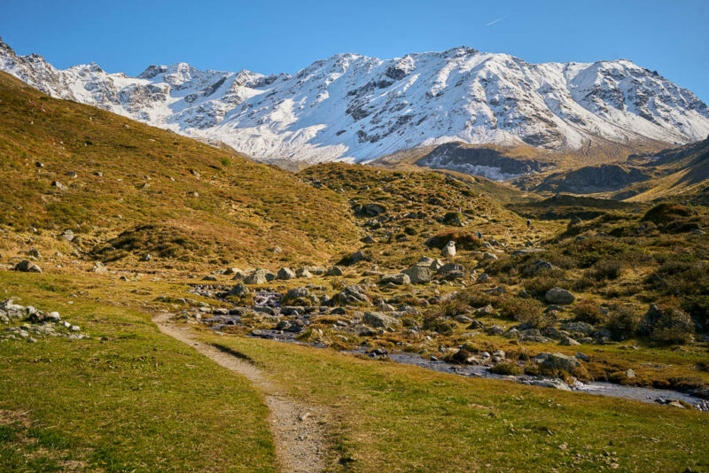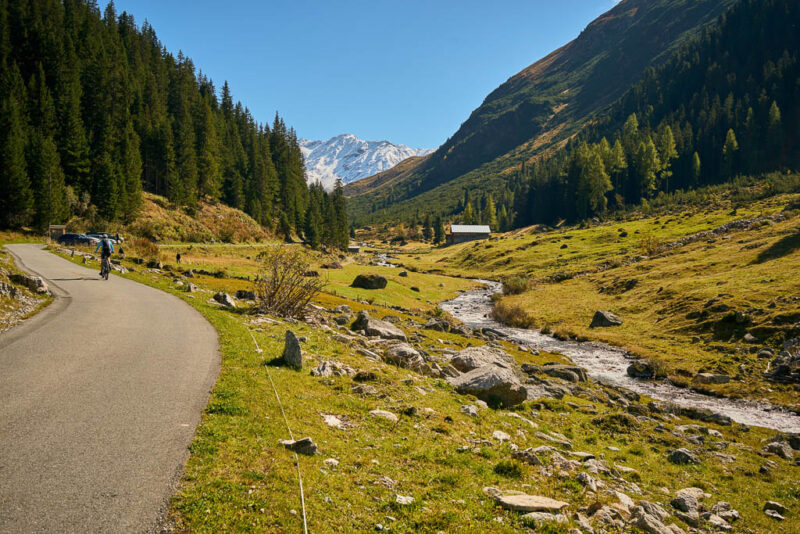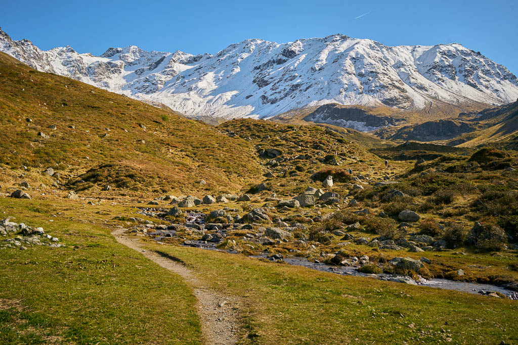 Archiv für September 2025Der Ausgangspunkt unserer heutigen Tour liegt am Bahnhof von Davos Platz. Von hier starten wir mit unseren Rädern, fahren zunächst ein kurzes Stück der Landwasser entlang und rollen dann durch den schattigen Mattawald zum Beginn des Dischmatals. Schon hier öffnet sich der Blick zu den Gipfeln am Talende, Scalettahorn und Piz Grialetsch zeichnen sich markant gegen den Himmel ab: Im Dischmatal empfängt uns die Sonne, und schon bald ist es Zeit, die oberste Kleidungsschicht abzulegen: Dann geht es zügig weiter: Die durchgehend asphaltierte Alpstraße zieht sich sanft ansteigend taleinwärts. Nach den ersten Kilometern erreichen wir den auf rund 1700 Metern gelegenen Weiler Teufi. Hier befindet sich ein traditionsreiches Gasthaus, das bis in den Herbst hinein geöffnet ist. Teufi gilt als klassisches Eingangstor ins Dischmatal. Eindrücke vom weiteren Straßenverlauf: Schließlich nähern wir uns Dürrboden: Bei Dürrboden parkieren wir unsere Räder: Von hier steigen wir zu Fuß in Richtung Grialetschhütte auf: Ein Blick zurück auf Dürrboden zeigt die Weite der Alp: Langsam gewinnen wir an Höhe: Der Blick richtet sich hier zum Scalettapass: Wir folgen dem Weg zur Grialetschhütte bis zu einer Wegkreuzung: Hier zweigt ein Pfad ab, der dem Hang entlang durch das Gletschtälli führt: Zahlreiche Bäche queren den Weg. Über zwei größere führen Brücken, die kleineren lassen sich mit Hilfe großer Steine übertreten. Solche Passagen liebe ich besonders – Schritt für Schritt, Stein für Stein, mit spielerischem Gleichgewicht: Nach einem knappen Kilometer mündet dieser Weg in den Hauptwanderweg, der von Dürrboden zum Scalettapass hinaufführt. Auf ihm kehren wir wieder nach Dürrboden zurück: Der Tag neigt sich, die Sonne verschwindet hinter den Gipfeln, und es wird deutlich kühler. Kurz vor Dürrboden bereiten wir uns für die Abfahrt vor und ziehen uns warm an: Zu Beginn der Abfahrt: Da das Tal mittlerweile weitgehend im Schatten liegt, wird die Rückfahrt eine kühle Angelegenheit. Doch mit der dickeren Jacke und dem gemäßigten Gefälle ist die Abfahrt heute angenehmer als gestern und wir erreichen Davos Platz ohne allzu sehr zu frieren. Mein Fazit: Toureninfos: