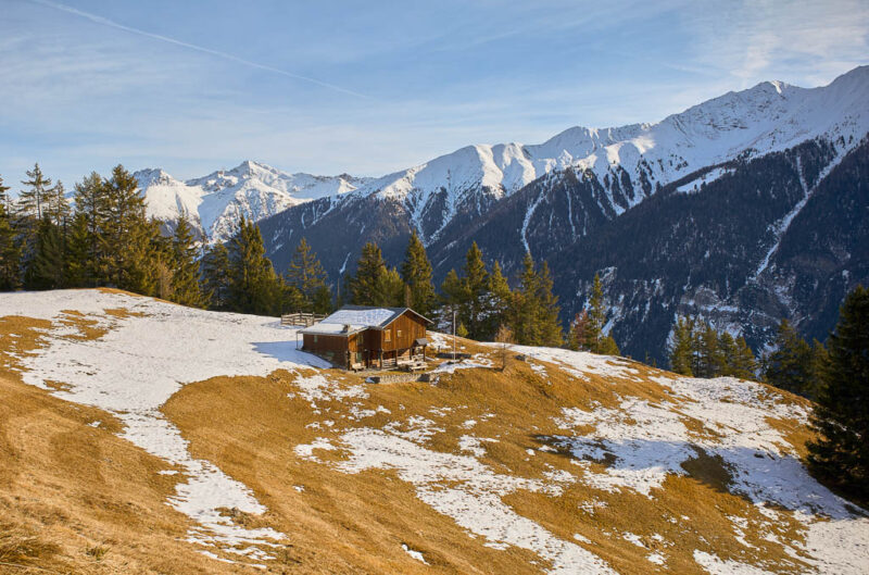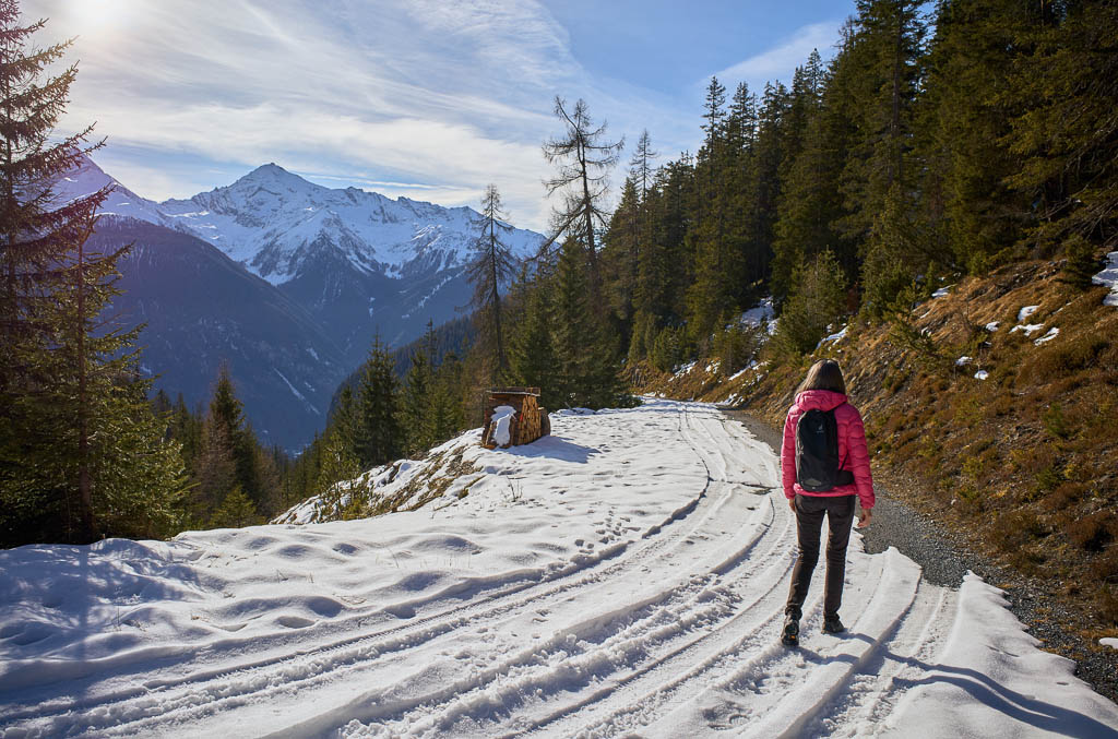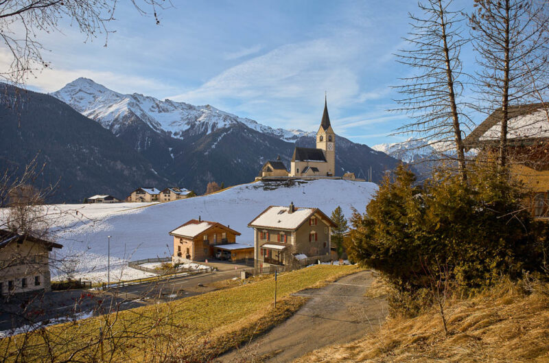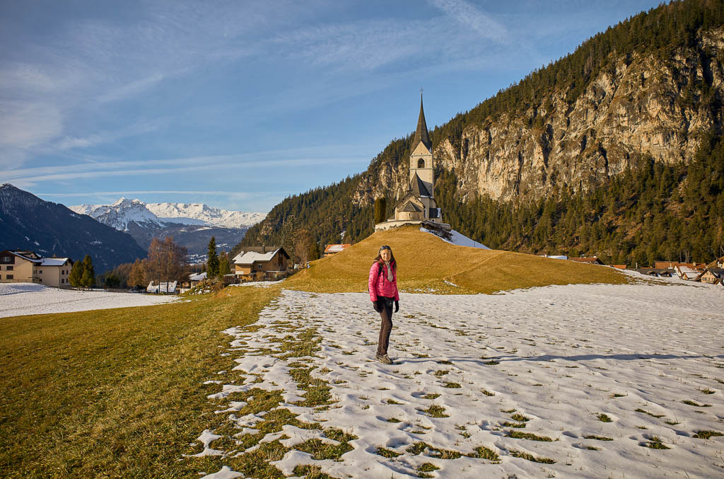 Autor ArchivWir haben fast Mitte Dezember, doch die Temperaturen fühlen sich eher nach Frühling an. Gemeinsam mit Guido nutze ich den herrlichen Sonnenschein und drehe eine Spazierrunde über Pardela, Grünwald und Acla. Zu Beginn unserer Tour gehen wir weglos über die Wiese unterhalb der Kirche: Blick zurück auf die Kirche: Bei Pardela: Weiter geht es in Richtung Grünwald: In Grünwald ist der Fahrweg stark vereist. Trotz der winterlichen Bedingungen sind einige Fahrzeuge nach oben gefahren und haben die Oberfläche glattgefahren. Entsprechend heikel ist das Gehen, jeder Schritt will vorsichtig gesetzt sein. Wir halten uns dabei eher seitlich am Rand, wo noch etwas griffiger Schnee liegt. Wir sind froh, als wir endlich auf den Weg nach Acla abbiegen können, auch wenn dieser anfangs ebenfalls wenig fußgängerfreundlich ist. Bei Acla: Der anschließende Abstieg von Acla nach Schmitten ist zum größten Teil schnee- und eisfrei und damit angenehm zu gehen: Es war ein schöner, friedlicher Winterspaziergang. Eine stille Auszeit im Dezemberlicht. Der Schnee rund um Schmitten schmilzt aufgrund milder Temperaturen und Sonnenschein langsam, und im Dorf ist vom Winter kaum noch etwas zu sehen. Um dennoch in den Genuss einer echten Winterlandschaft zu kommen, steigen wir heute in die höheren Lagen auf. Zunächst wandern wir hinauf nach Acla: Ankunft bei Acla: Von Acla führt ein steiler Wanderweg direkt hinauf nach Zaplina: Bei Zaplina zeigt sich der Winter dann in voller Pracht, die Hänge sind tief verschneit: Von Zaplina aus queren wir hinüber zur Schmittner Alp: Wir haben zwar Schneeschuhe dabei, doch auch wenn wir hin und wieder einsinken, lässt sich der Weg noch gut ohne zusätzliche Ausrüstung bewältigen: Ankunft oberhalb der Schmittner Alp: Von hier sind es nur noch wenige Schritte hinauf zur Alp Afiein. Der Blick über die verschneiten Weiden der Alp: Anschließend laufen wir gemütlich über den Fahrweg hinunter zur Schmittner Alp: Hütten der Schmittner Alp: Von dort geht es weiter nach Pardela: Und schließlich laufen wir über den alten Pardelaweg zurück nach Schmitten. Mein Fazit: Toureninfos:
