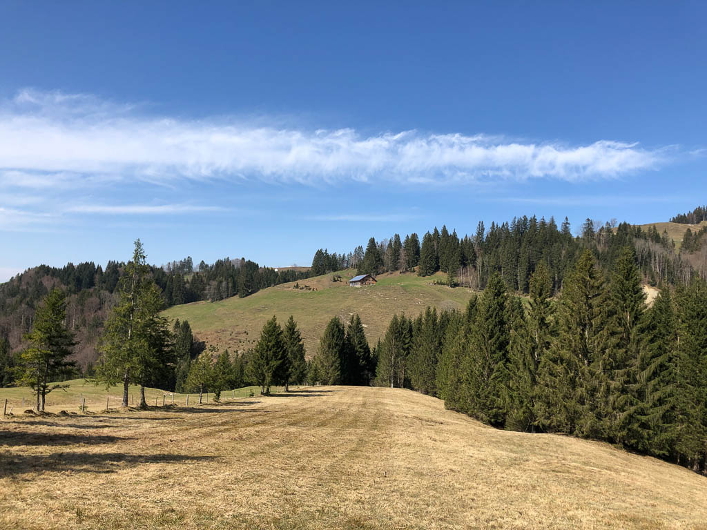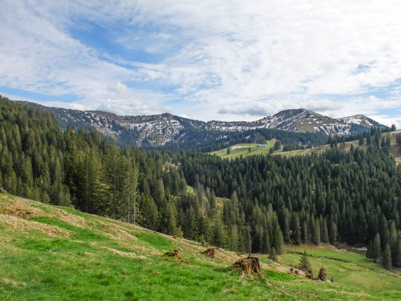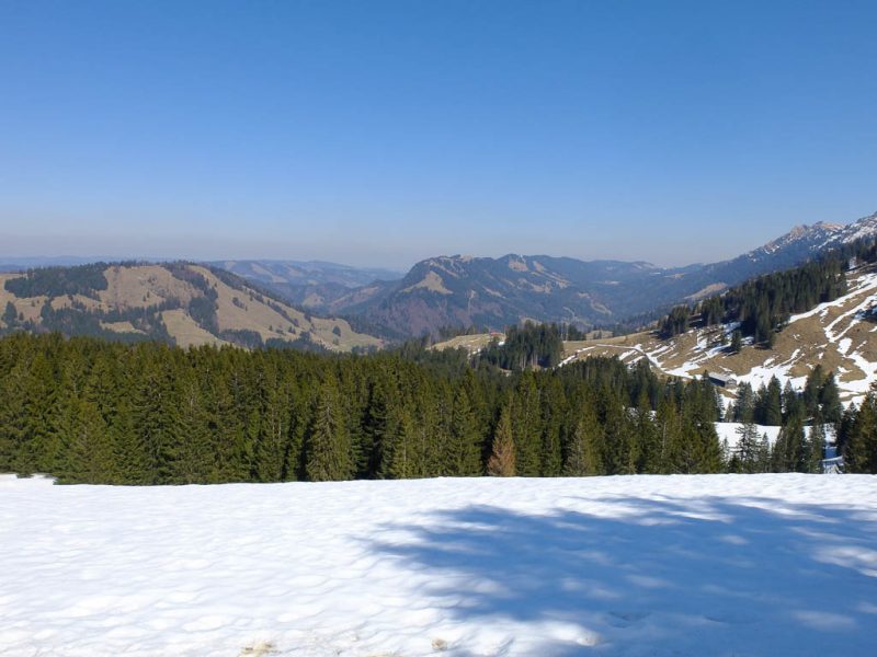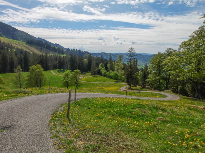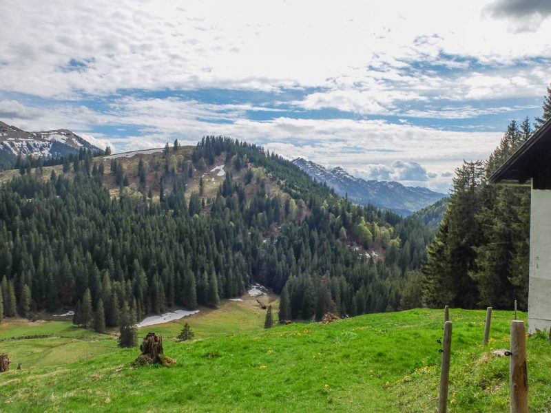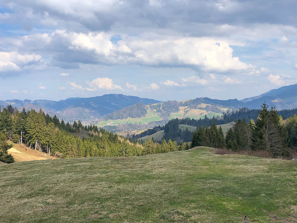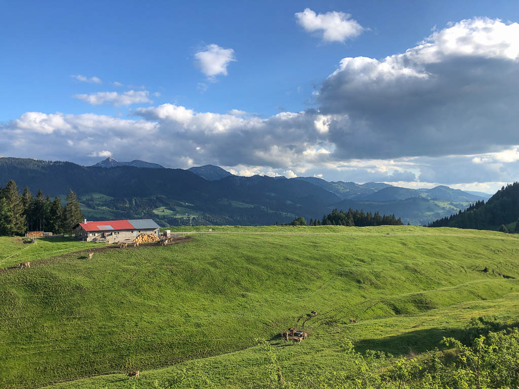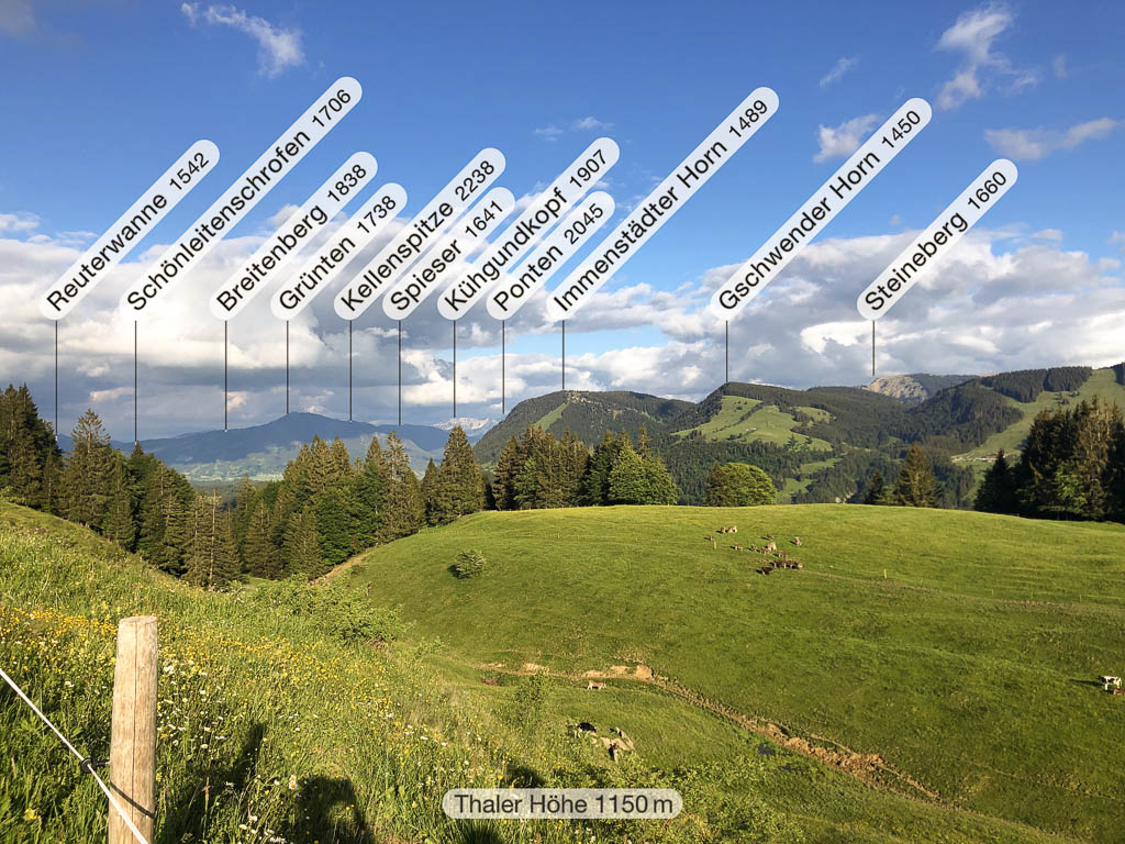 Ich war noch nie auf der Thaler Höhe und so bin ich überrascht von der wunderbaren Aussicht, die man von hier hat. Der Blick von der Thaler Höhe auf die Neuschwand-Alpe, im Hintergrund ragen Hochgrat und Rindalphorn auf: