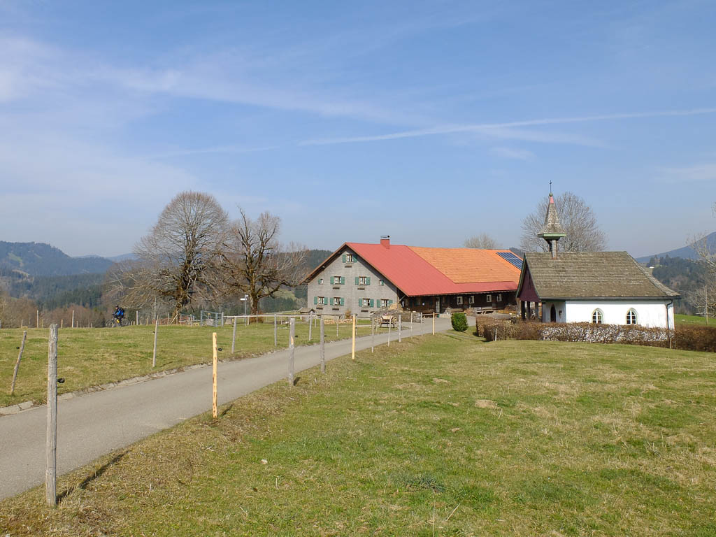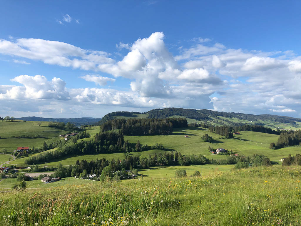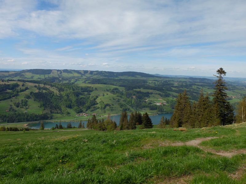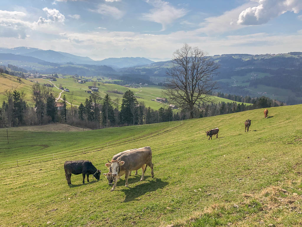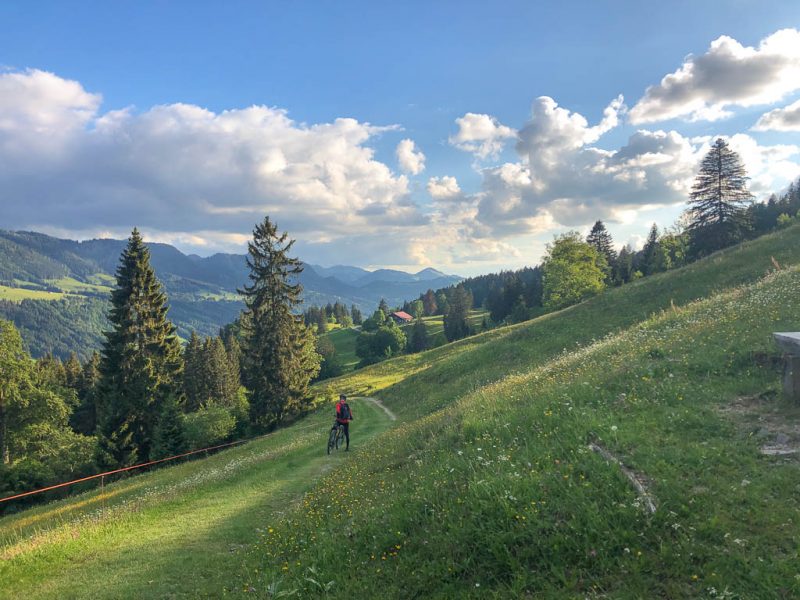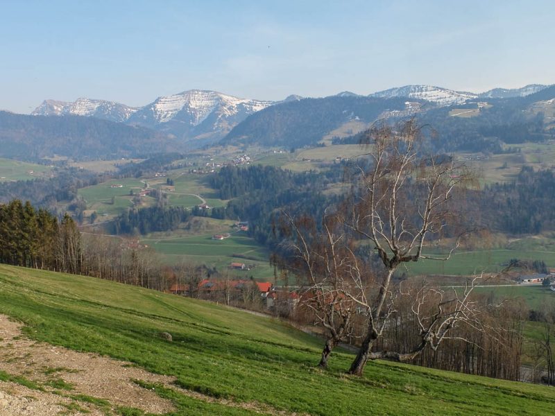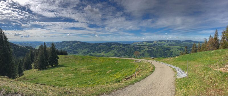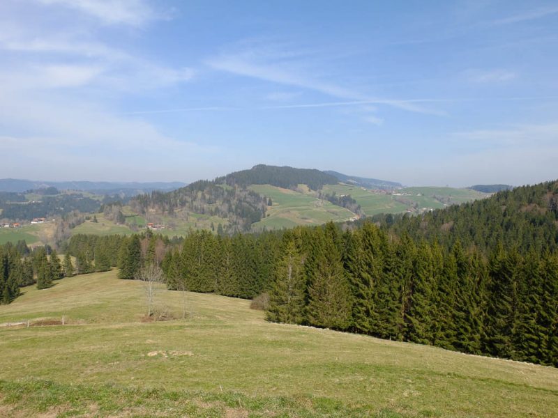 Ich war noch nie auf der Thaler Höhe und so bin ich überrascht von der wunderbaren Aussicht, die man von hier hat. Der Blick von der Thaler Höhe auf die Neuschwand-Alpe, im Hintergrund ragen Hochgrat und Rindalphorn auf: