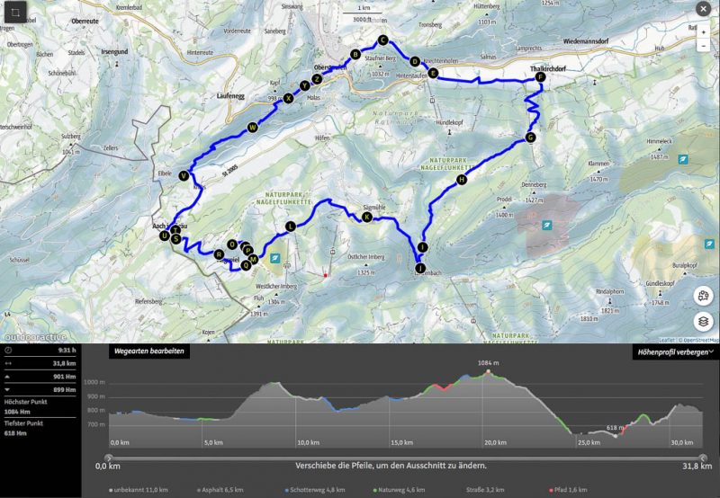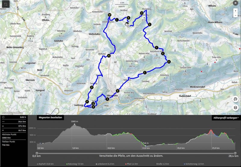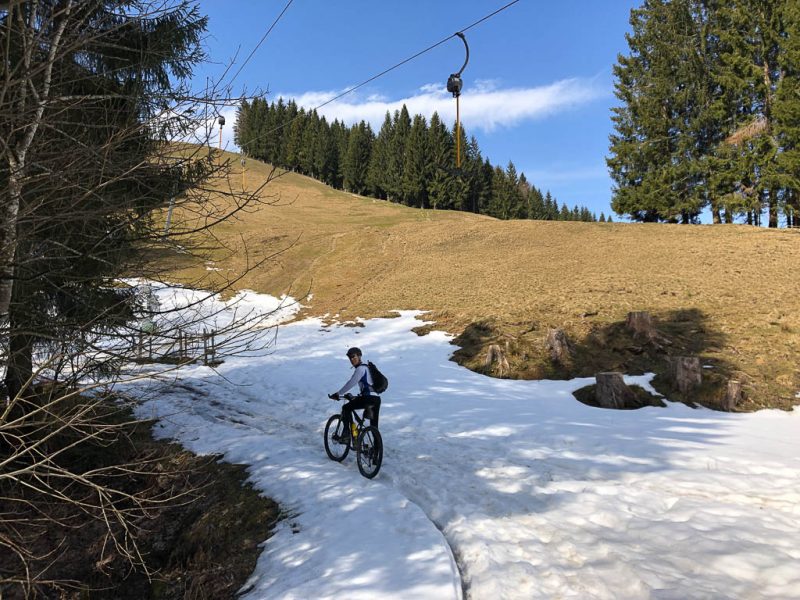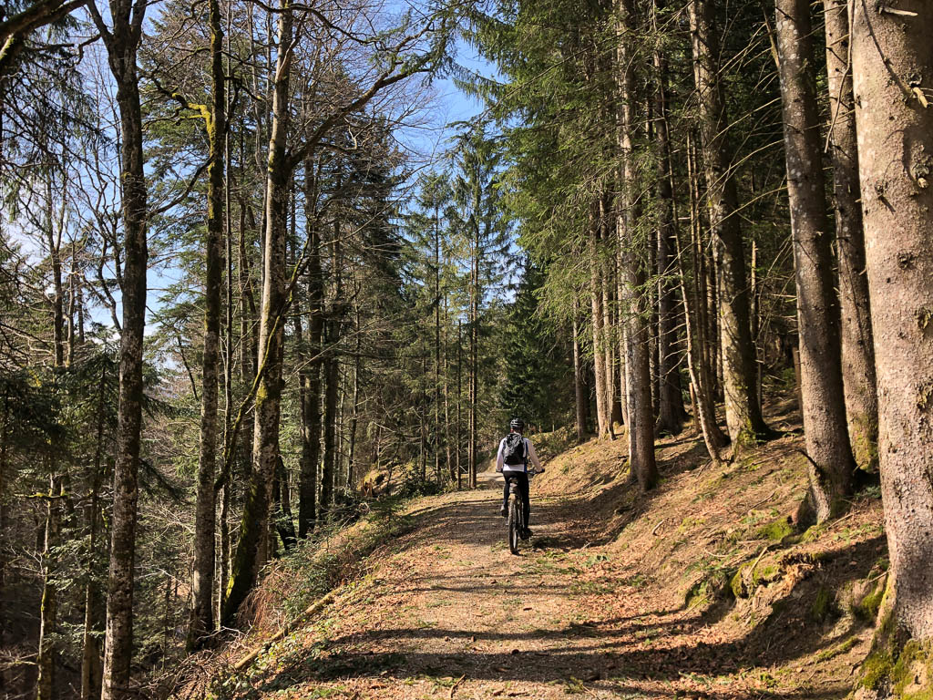 Der wurzelreiche Waldweg ist nicht der einzige, für mich nicht ganz einfach zu fahrende Abschnitt der Tour: Es sind zahlreiche Singletrails und Schotterpisten zu bewältigen. Die Tour ist somit weitaus anspruchsvoller als die gestrige. Die Abfahrt von der Thaler Höhe: