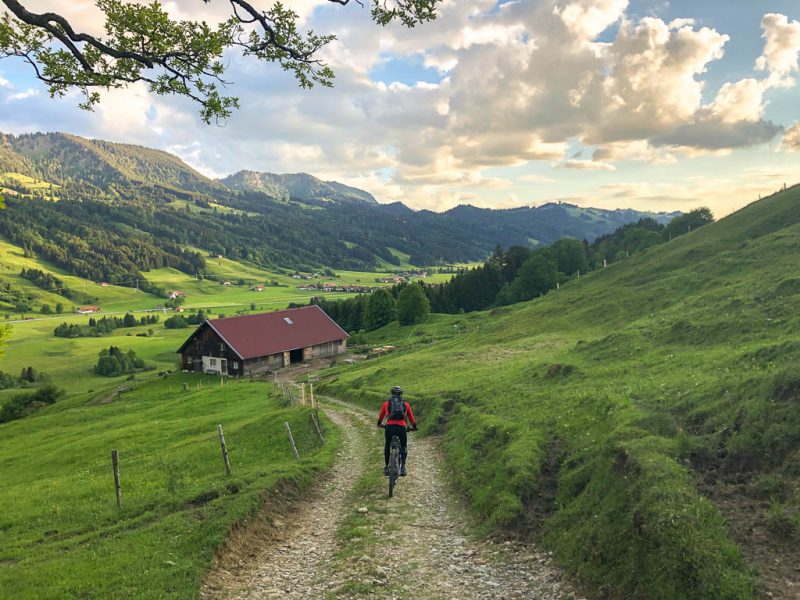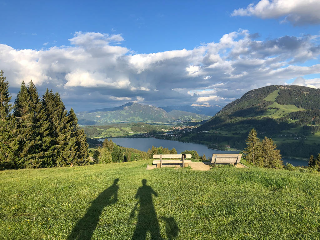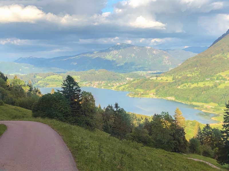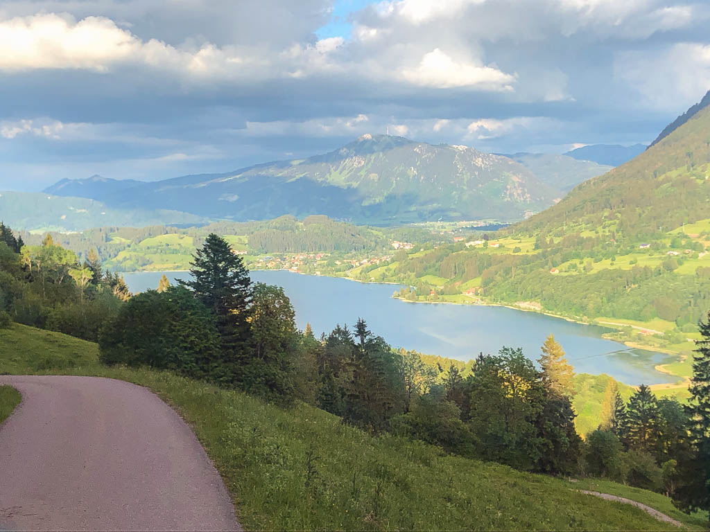 Hier geht es ein Stück des Weges über Asphalt, vor uns glänzt der Alpsee im Licht der Abendsonne: