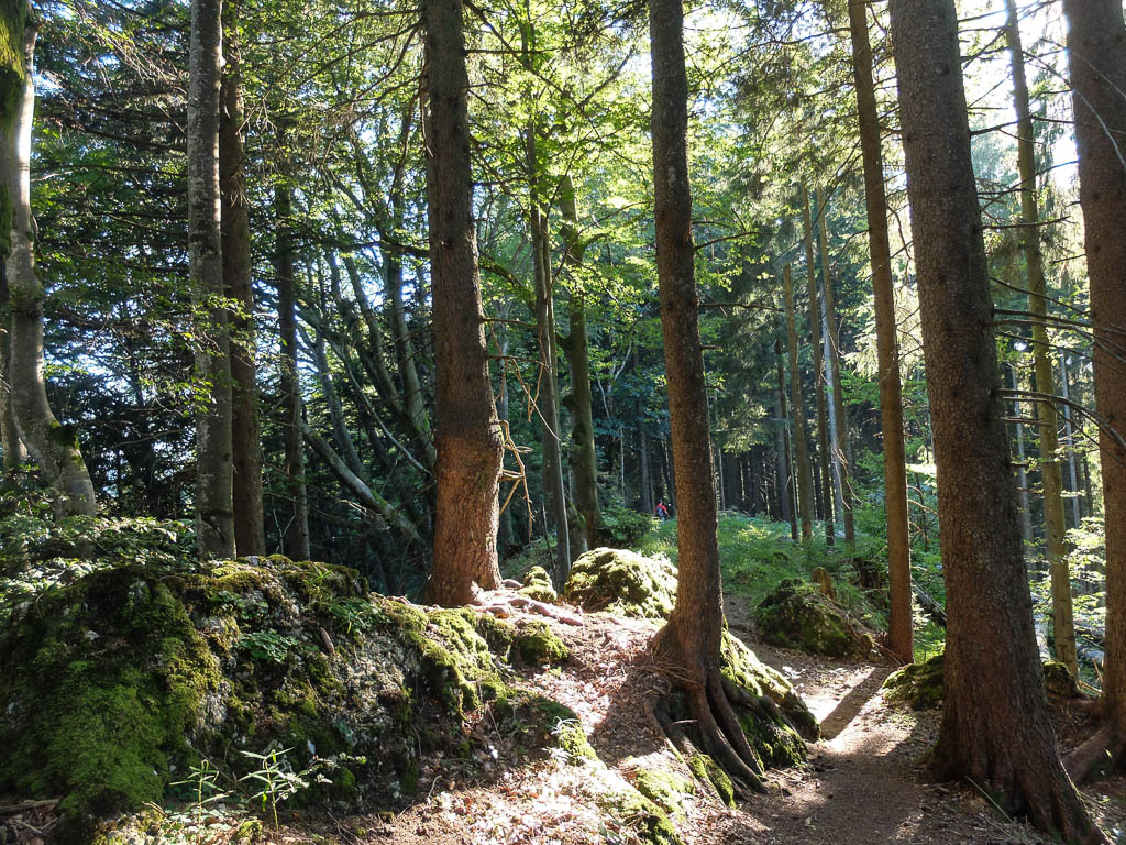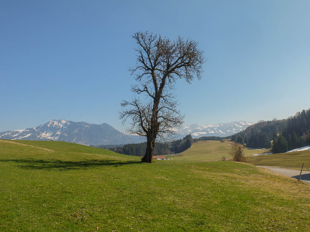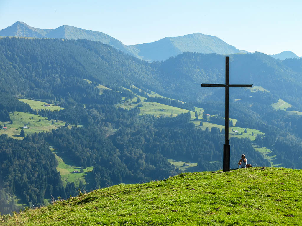 Im Hintergrund sind von links nach rechts die Gipfel von Mörzelspitze, Leuenkopf, Goselkopf, Guntenkopf, Hangköpfle und Hangspitze, alles Gipfel um die 1800 Meter, zu sehen. Von der Wildgunten-Alpe aus geht es dann nur noch bergab: