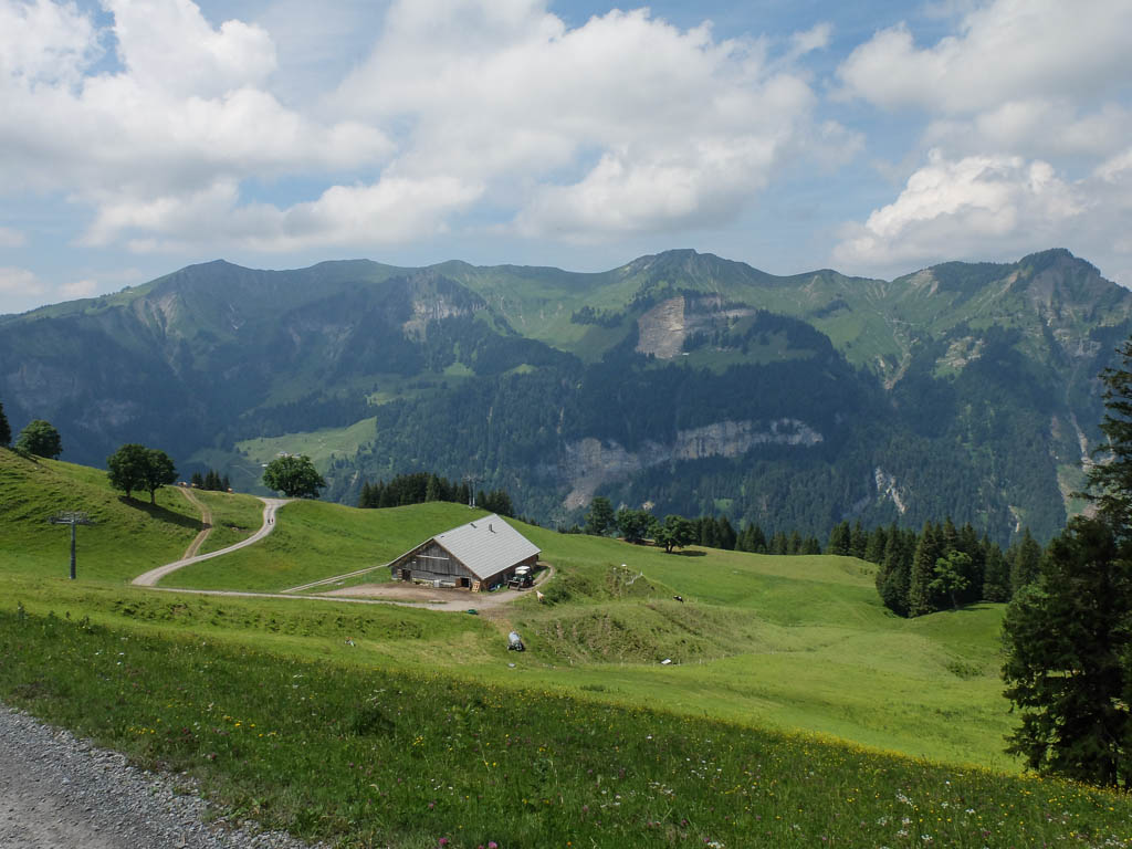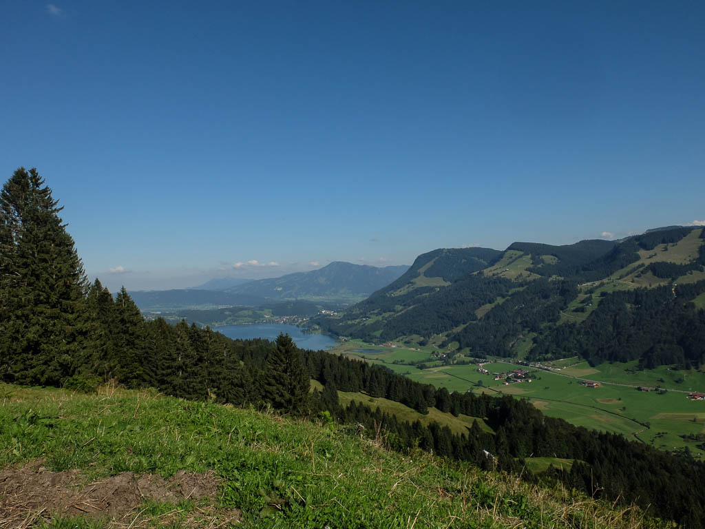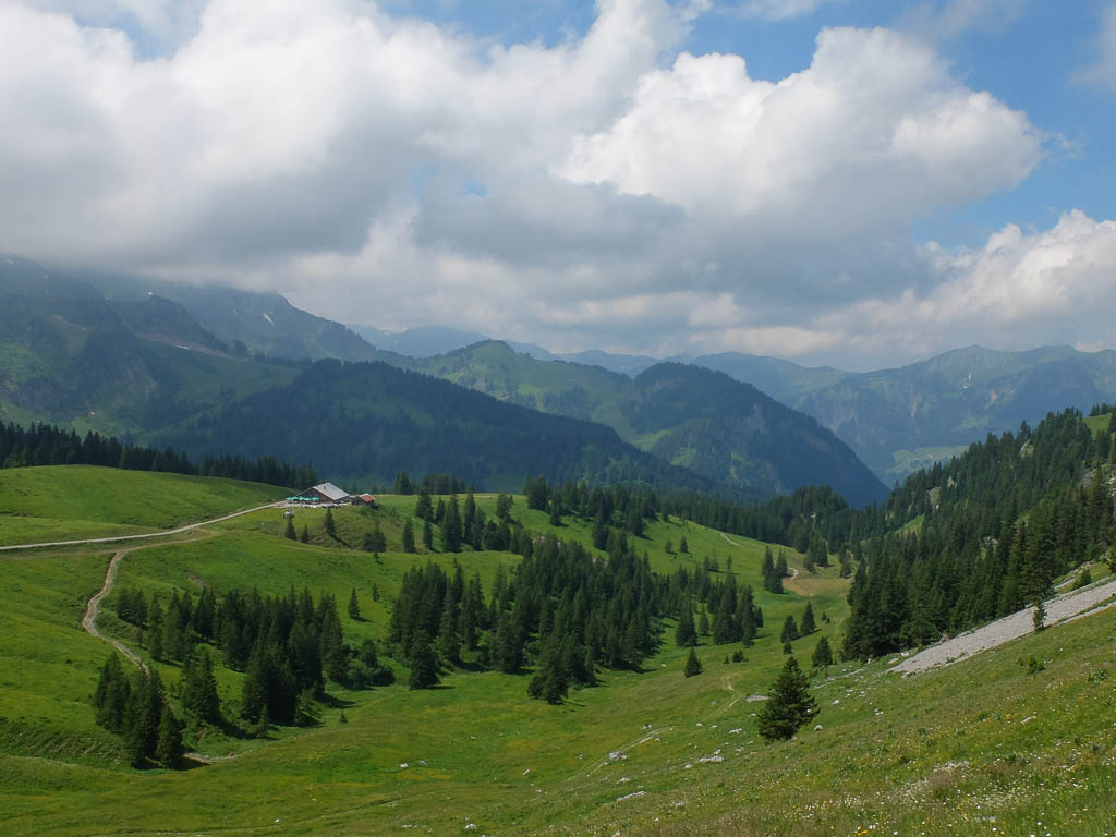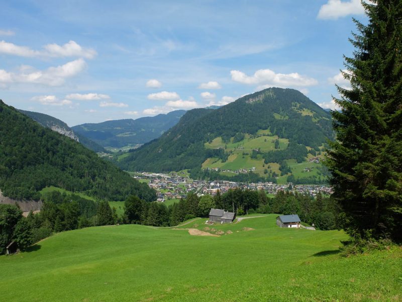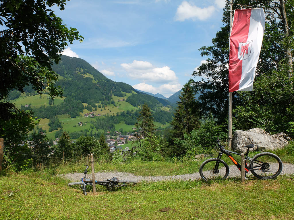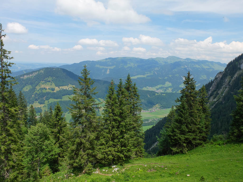 Von Au aus radeln wir mäßig steil ein Stück der Passstraße, die zum Furkajoch führt, hinauf. Dieser Streckenabschnitt ist nicht besonders angenehm zu fahren, da hier selbst an einem Wochentag reger Verkehr herrscht. Nach einem Kilometer können wir die Passstraße jedoch schon wieder verlassen und fahren auf einem Forstweg weiter. Dieser führt über den Alpengasthof Edelweiß zur Wurzach-Alpe hinauf. Der Ausblick während des Anstiegs hinunter ins Tal, in der Bildmitte ist der Diedamskopf, der Hausberg von Schoppernau, zu sehen: