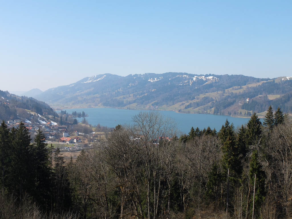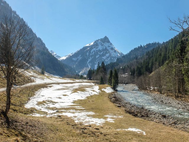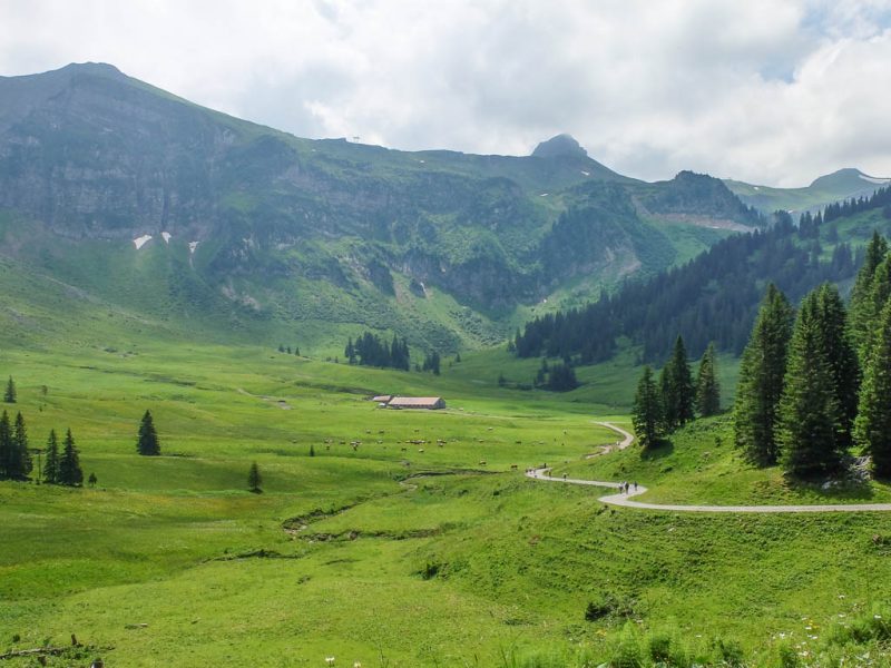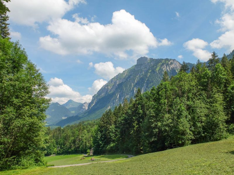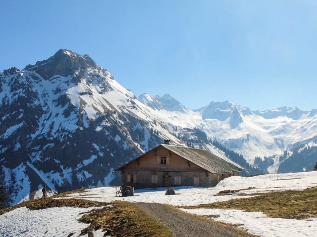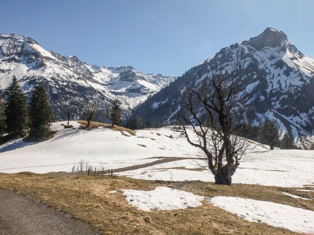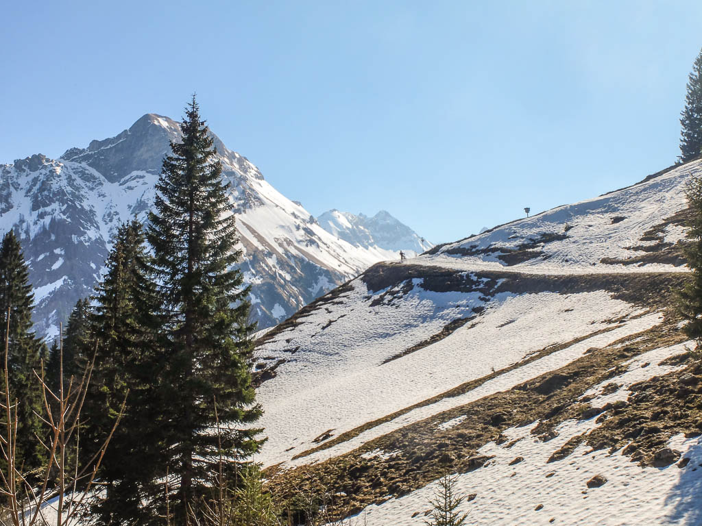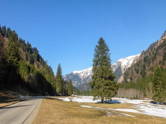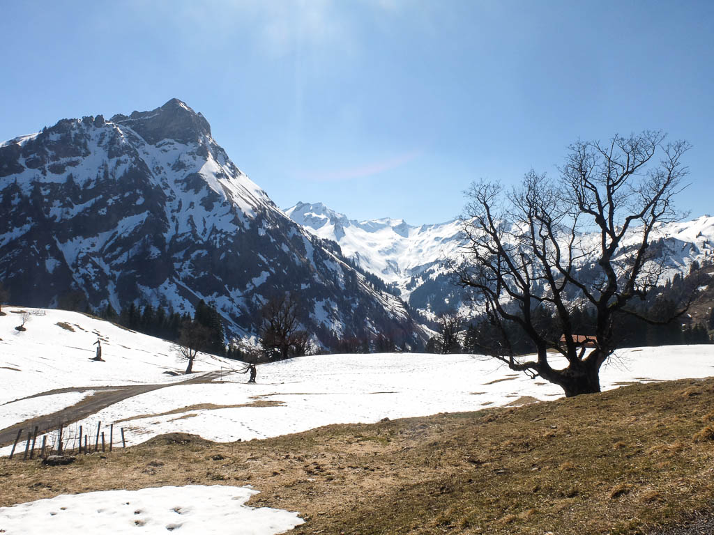 Von Au aus radeln wir mäßig steil ein Stück der Passstraße, die zum Furkajoch führt, hinauf. Dieser Streckenabschnitt ist nicht besonders angenehm zu fahren, da hier selbst an einem Wochentag reger Verkehr herrscht. Nach einem Kilometer können wir die Passstraße jedoch schon wieder verlassen und fahren auf einem Forstweg weiter. Dieser führt über den Alpengasthof Edelweiß zur Wurzach-Alpe hinauf. Der Ausblick während des Anstiegs hinunter ins Tal, in der Bildmitte ist der Diedamskopf, der Hausberg von Schoppernau, zu sehen: