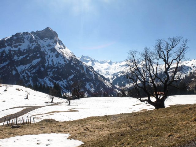 Heute geht es zusammen mit Guido wieder einmal auf Tour: Wir umrunden die Kanisfluh, ein Bergmassiv im Bregenzerwald zwischen den Orten Mellau und Au, mit dem Rad. Den höchsten Punkt des Massivs, den 2044 Meter hohen Holenke, erklimmen wir zu Fuß. Start der Tour ist in Mellau an der Talstation der Mellaubahn. Dort leihe ich mir ein E-Mountainbike, wie beim letzten Mal ein Fully einschließlich Teleskopstütze. Anfangs geht es flach durchs Tal der Bregenzer Ach über Schnepfau nach Au. Von hier aus hat man einen wunderbaren Blick auf das markante Bergmassiv, das als Wahrzeichen des Bregenzerwaldes gilt: