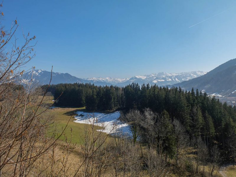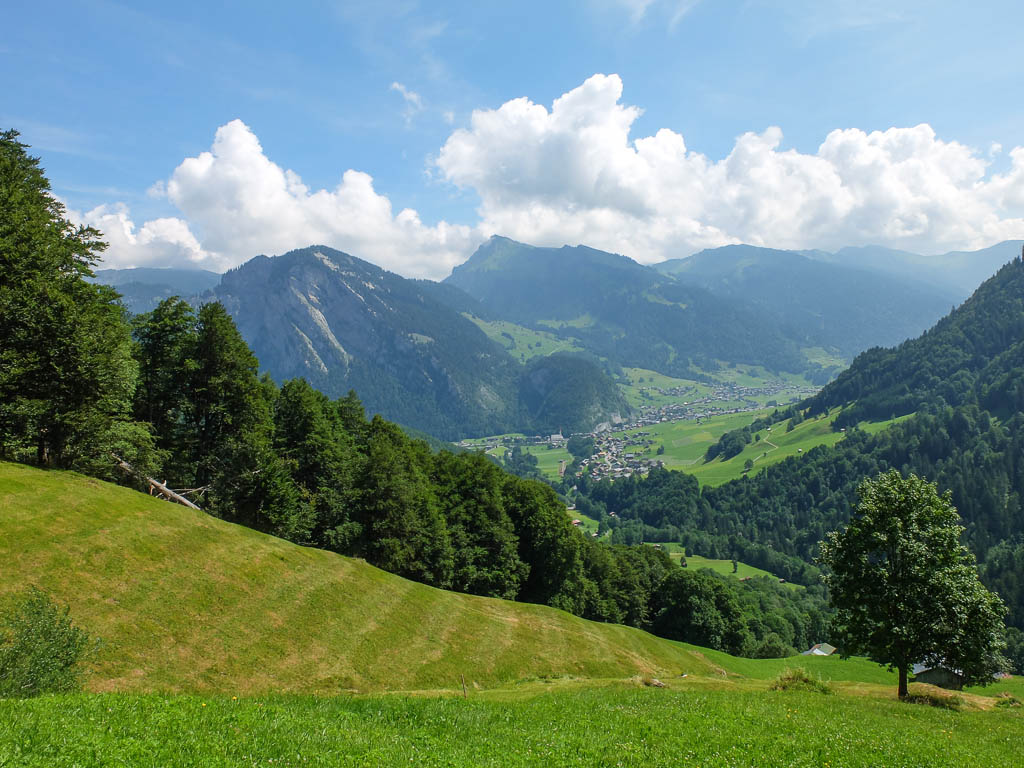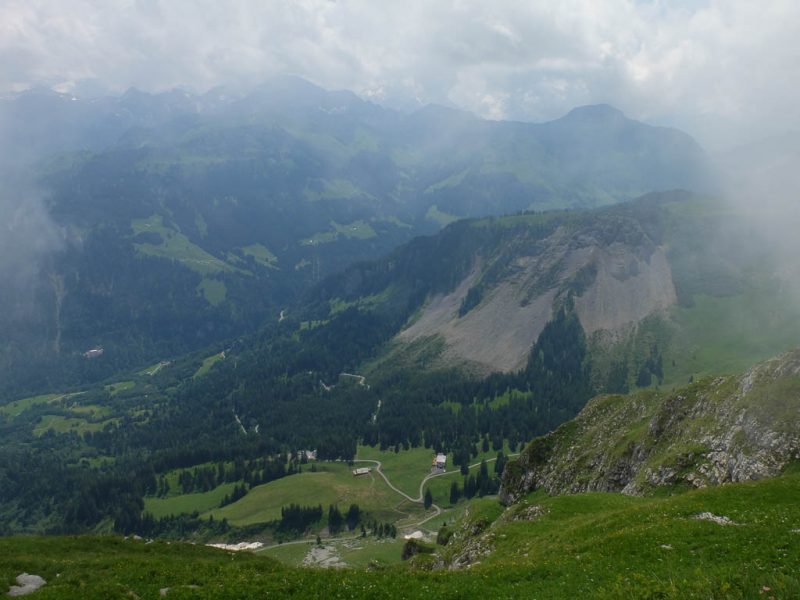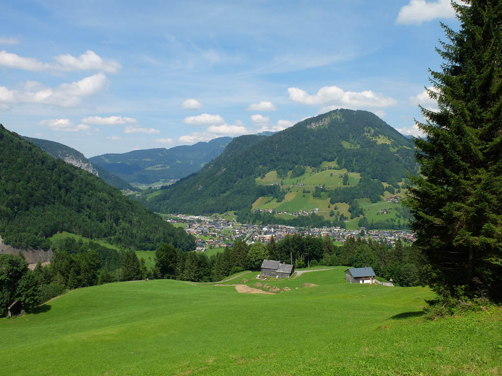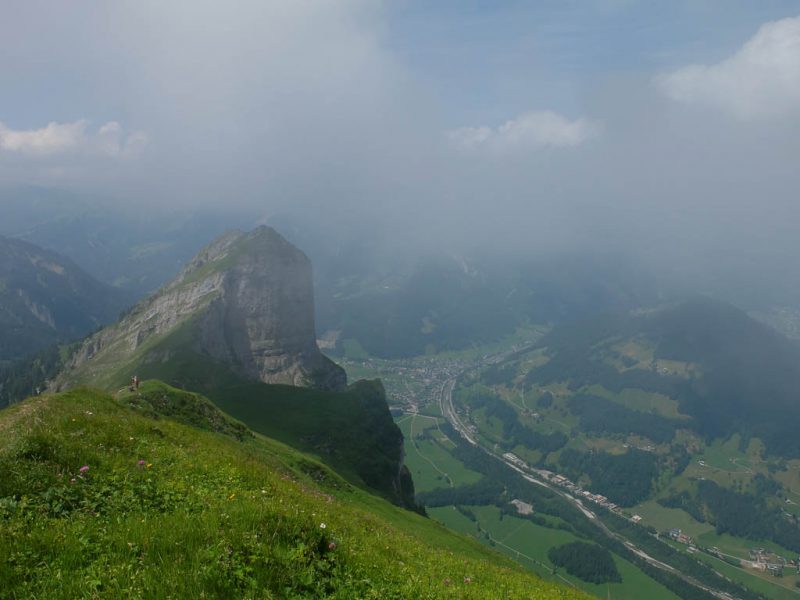 Der Blick hinunter ins Tal über den Hählesattel auf Mellau, der Felsen links im Bild ist der Hohe Stoß, einer der Nebengipfel der Kanisfluh: