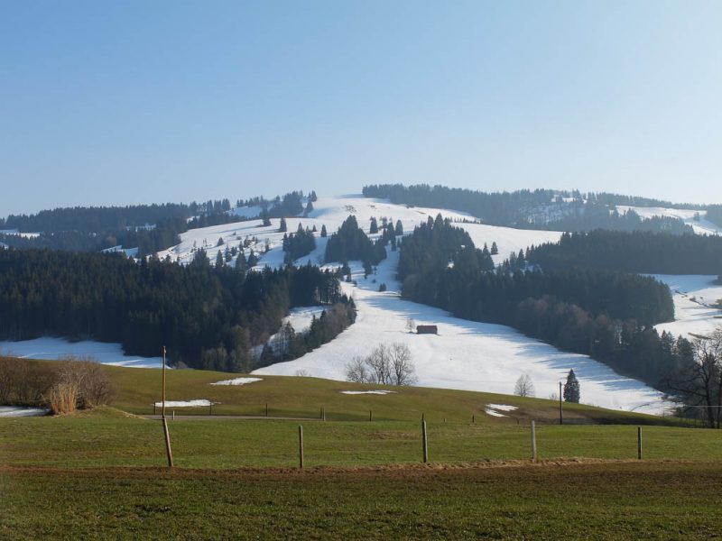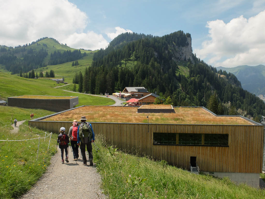 Von der Kanis-Alpe aus führt unser Weg zur Bergstation „Roßstelle“ der Mellaubahn. Auf diesem Streckenabschnitt haben wir einen freien Blick auf die Winterstaude, einen Berg bei Hittisau: