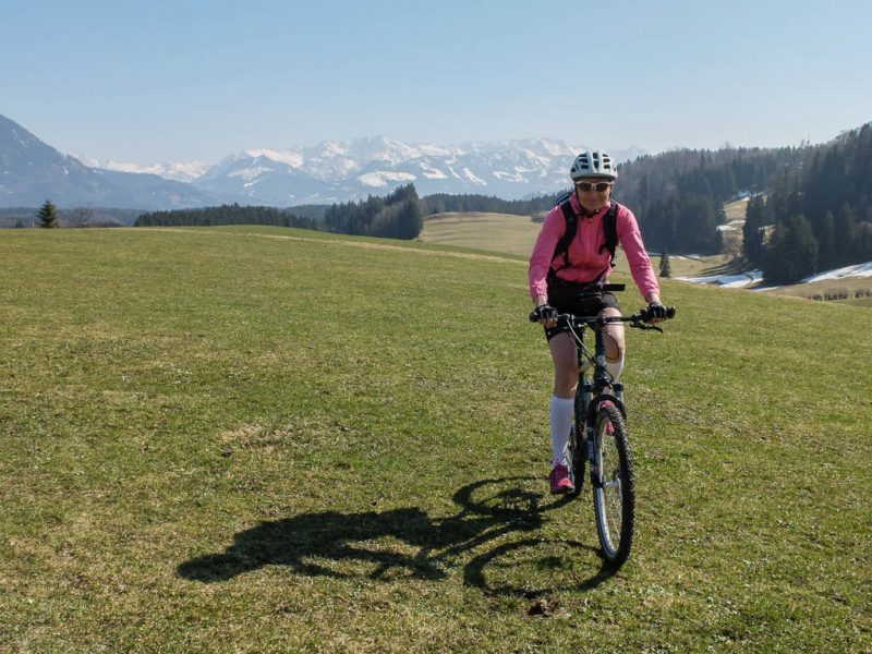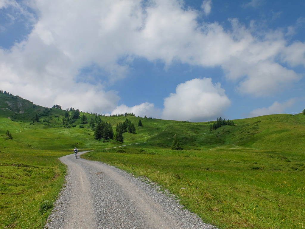 Nach dem Abstecher auf den Gipfel des Holenkes geht es mit den Rädern bergab zur Kanis-Alpe: