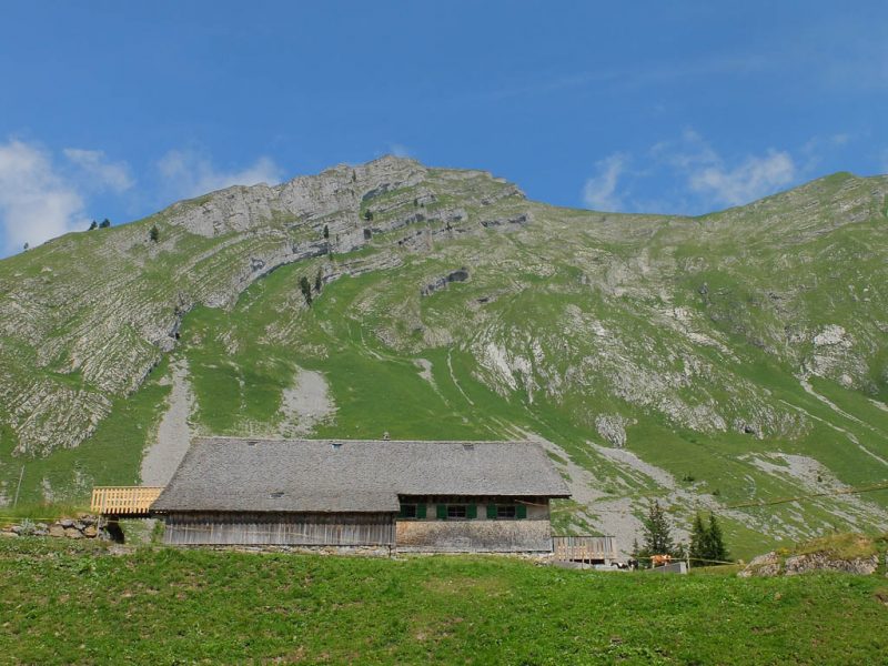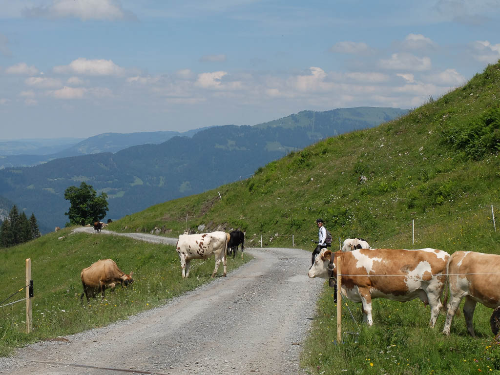 Zum höchsten Punkt der Kanisfluh steigen wir zu Fuß hinauf. Dabei sind 400 Höhenmeter und 1,7 Kilometer zu überwinden. Der Blick während des Aufstiegs über die Wurzach-Alpe, links im Hintergrund liegen wolkenverdeckt Hohe Matona und Hoher Freschen: