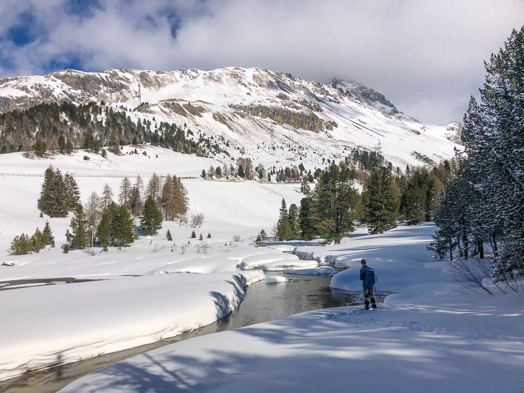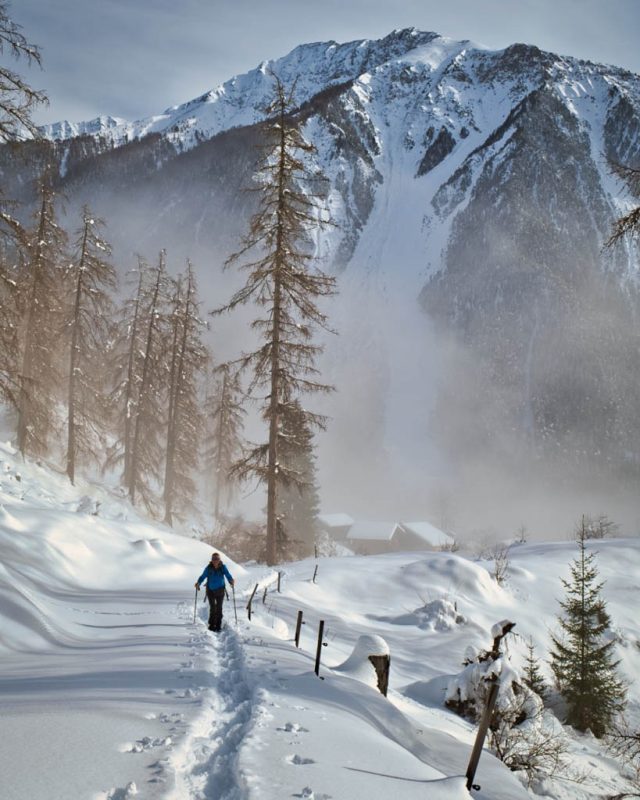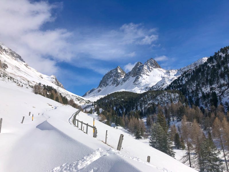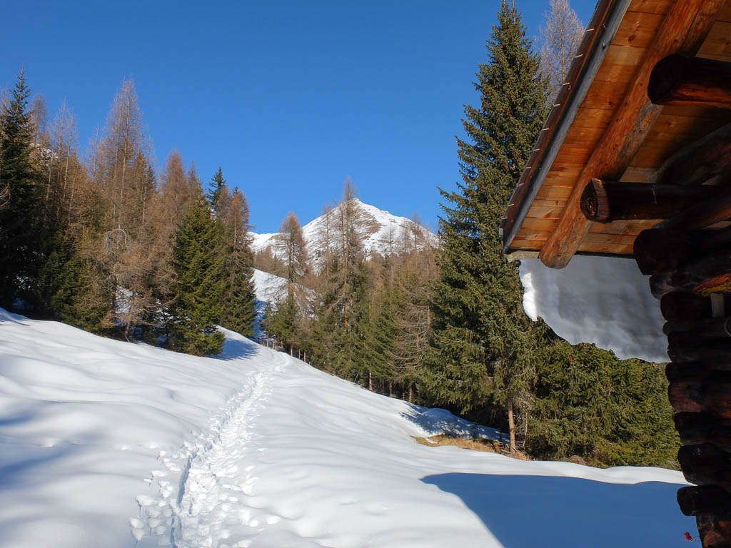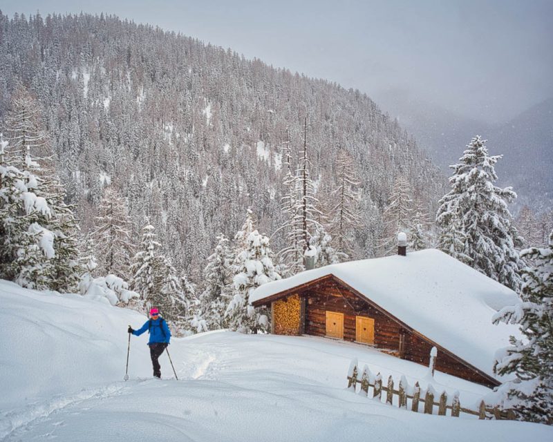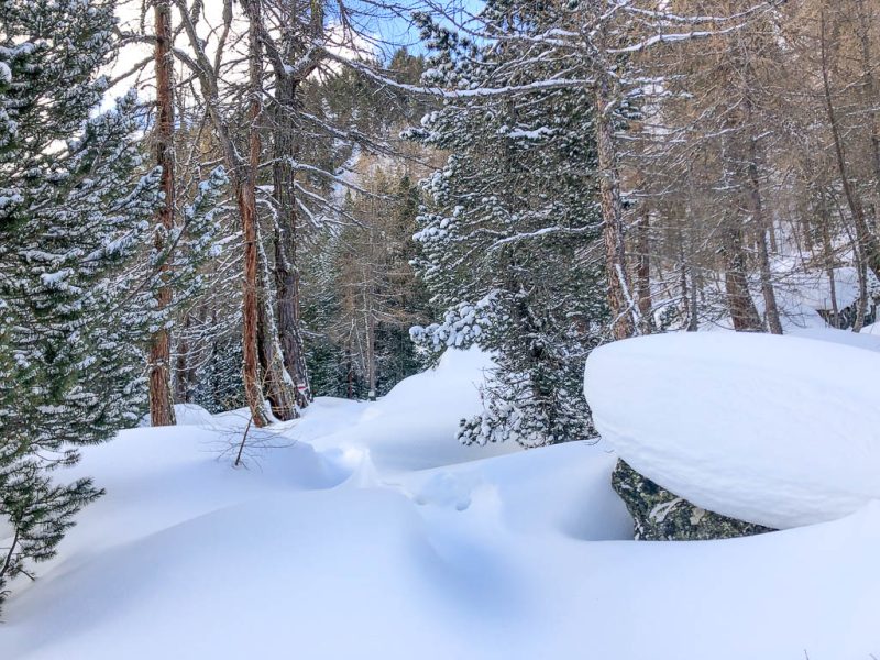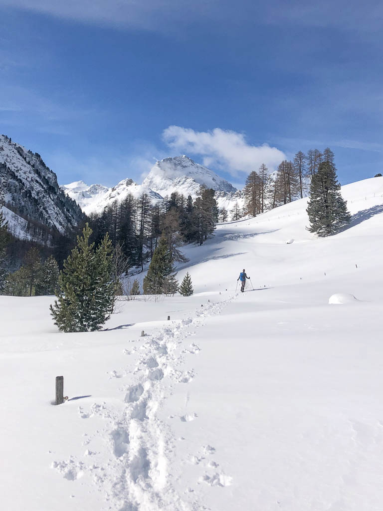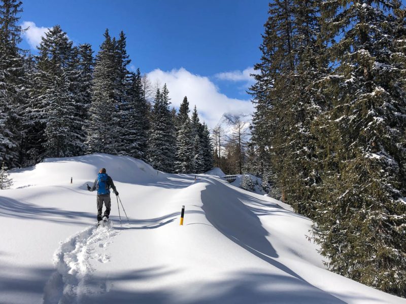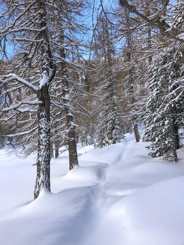 Es schneit und schneit und schneit. Tagsüber allerdings nur sehr leicht, so dass wir uns trotzdem aus dem Haus wagen und mit den Schneeschuhen auf unverspurten Wegen hinauf nach Acla stapfen: