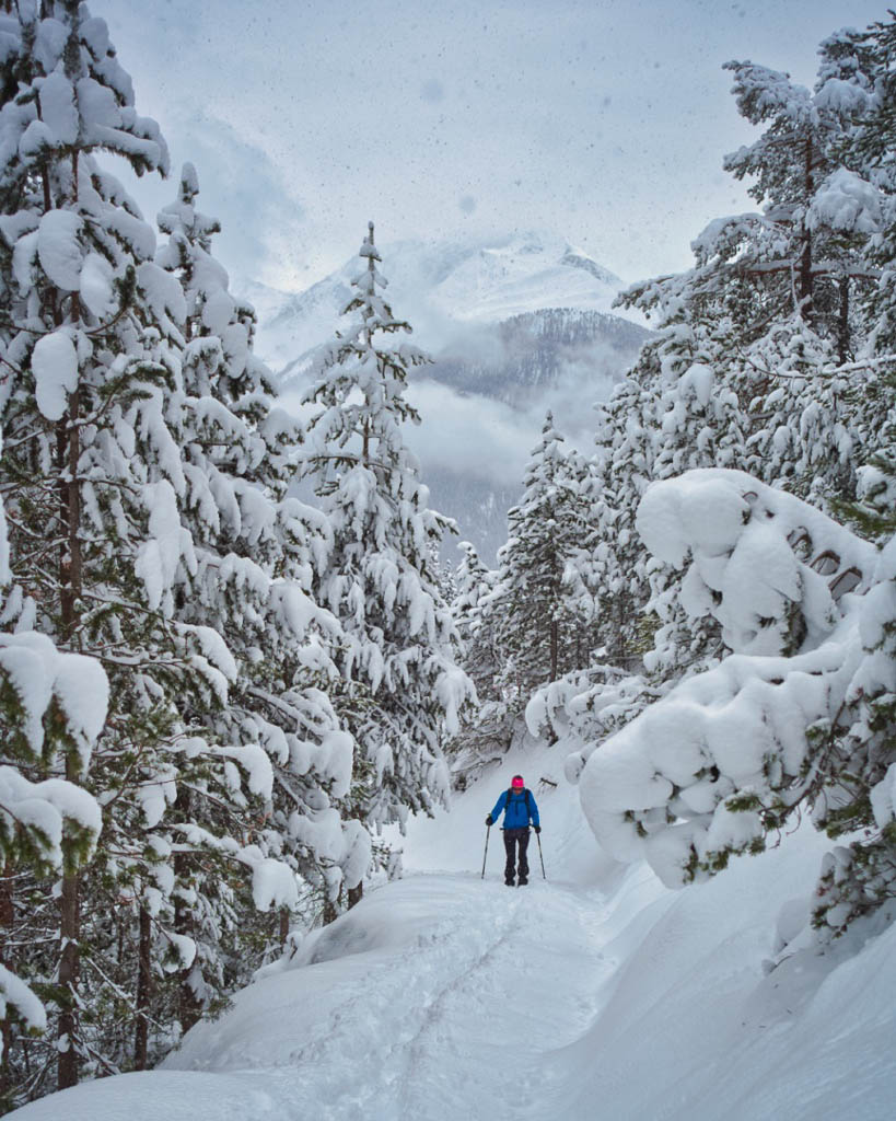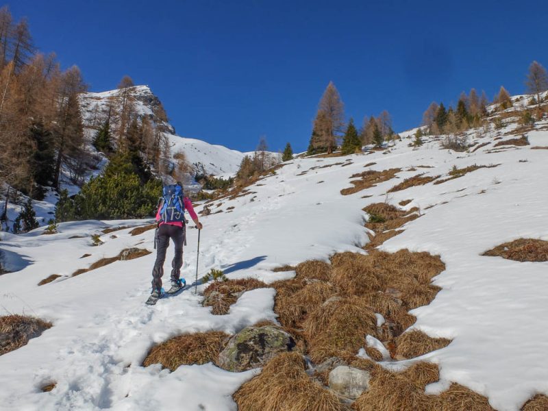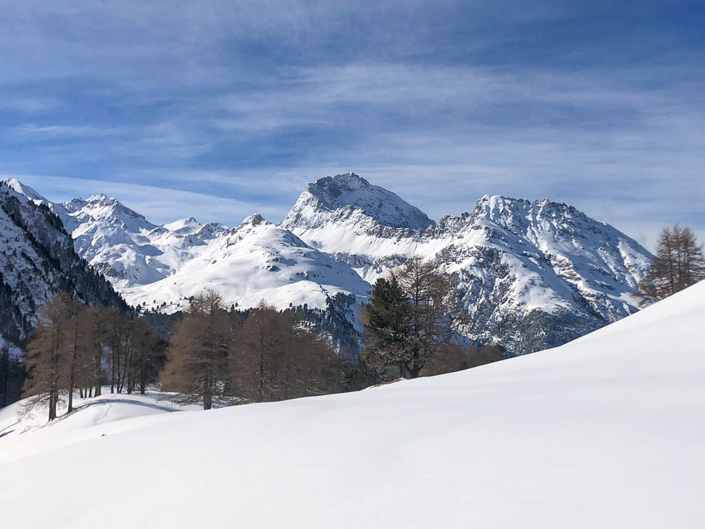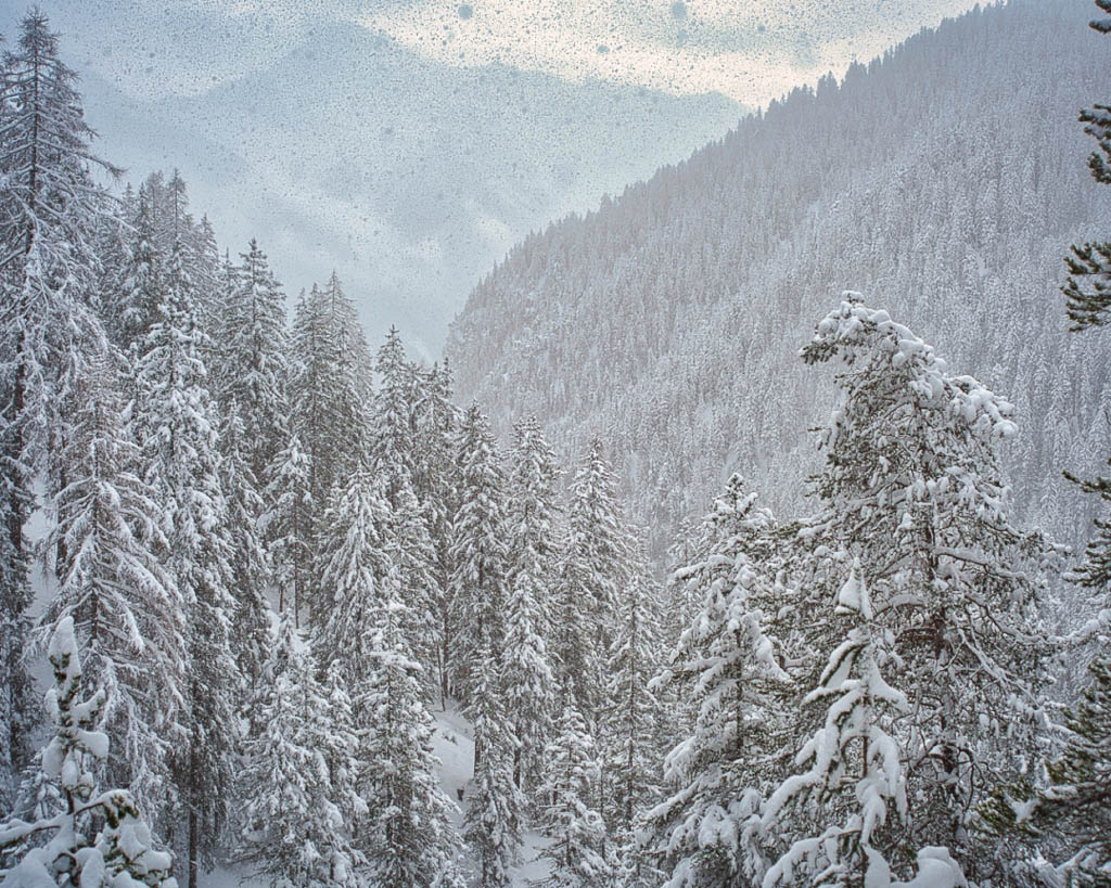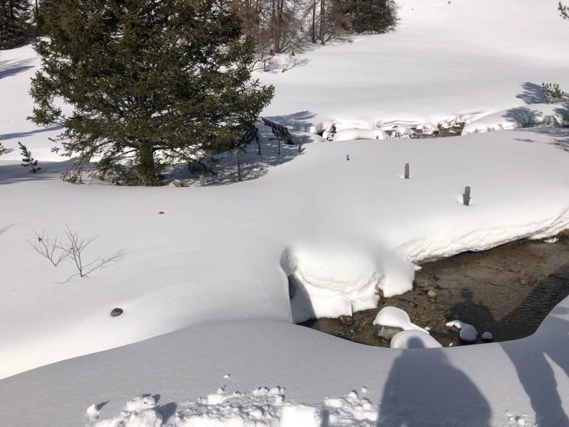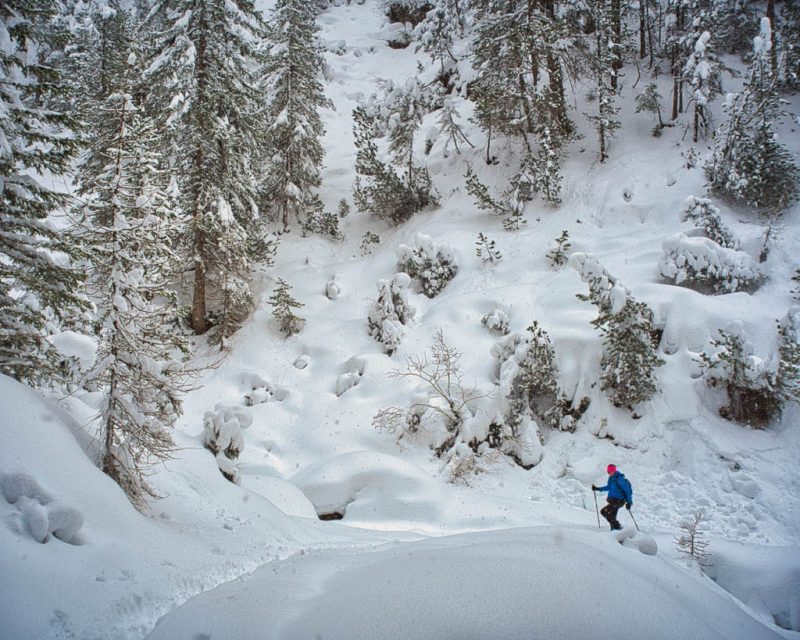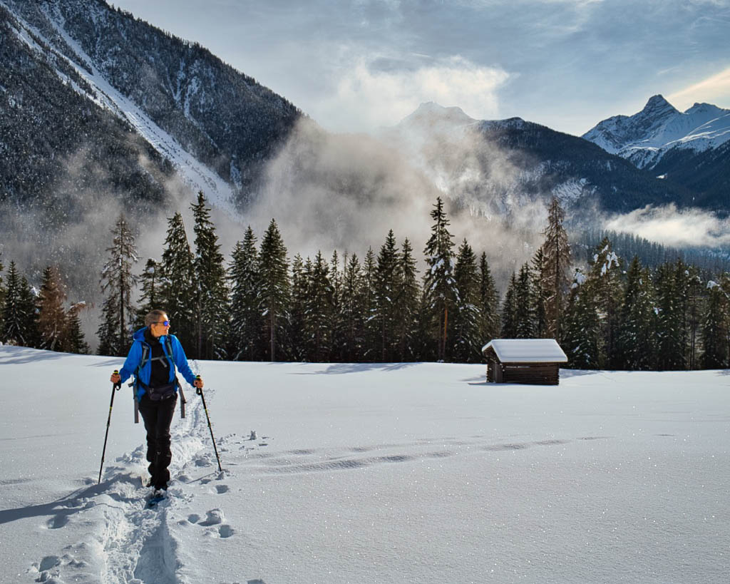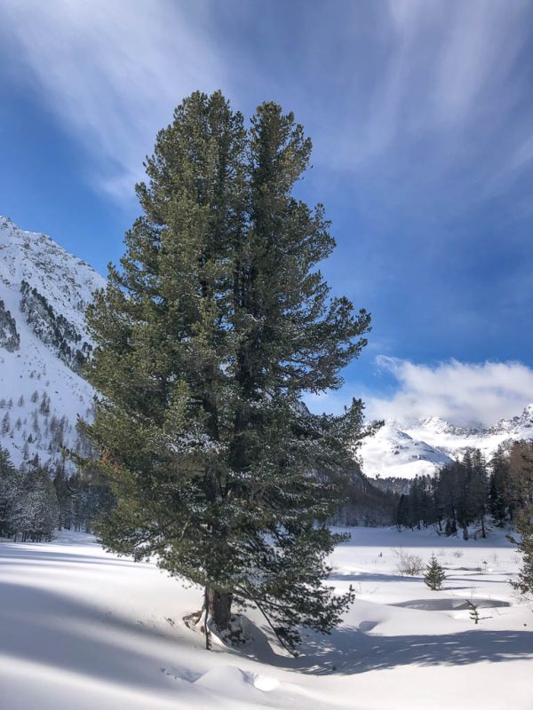 Es schneit und schneit und schneit. Tagsüber allerdings nur sehr leicht, so dass wir uns trotzdem aus dem Haus wagen und mit den Schneeschuhen auf unverspurten Wegen hinauf nach Acla stapfen: