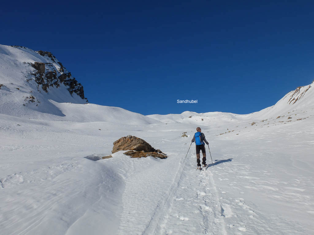 Am Sonntag war Guido allein unterwegs und stieg mit Hilfe von Schneeschuhen zum 2764 Meter hohen Sandhubel hinauf. Für die rund 9 Kilometer lange Strecke, auf der 1500 Höhenmeter zu überwinden sind, benötigte er gerade einmal zwei Stunden und fünfundvierzig Minuten. Der Tourenplaner veranschlagt für diese Strecke vier Stunden und zwanzig Minuten. Im Sommer wohlgemerkt und nicht im Winter, wenn erschwerte Bedingungen herrschen. Eine Kamera hatte Guido an diesem Tag nicht dabei und so schlägt er vor, dass wir heute die Tour gemeinsam unternehmen, so dass er sie mit der Kamera festhalten kann. Ich bin skeptisch, ob ich diese Strecke unter den aktuellen Bedinungen überhaupt bewältigen kann, aber gerne bereit, es zu versuchen. So starten wir um 11.30 Uhr Richtung Sandhubel. Die ersten 500 Höhenmeter können wir ohne Schneeschuhe zurücklegen, der Weg hinauf nach Pardela ist schnee- und eisfrei. An einer kleinen Hütte oberhalb von Pardela schnallen wir die Schneeschuhe an und marschieren mit Blick auf den Tiaun weiter: