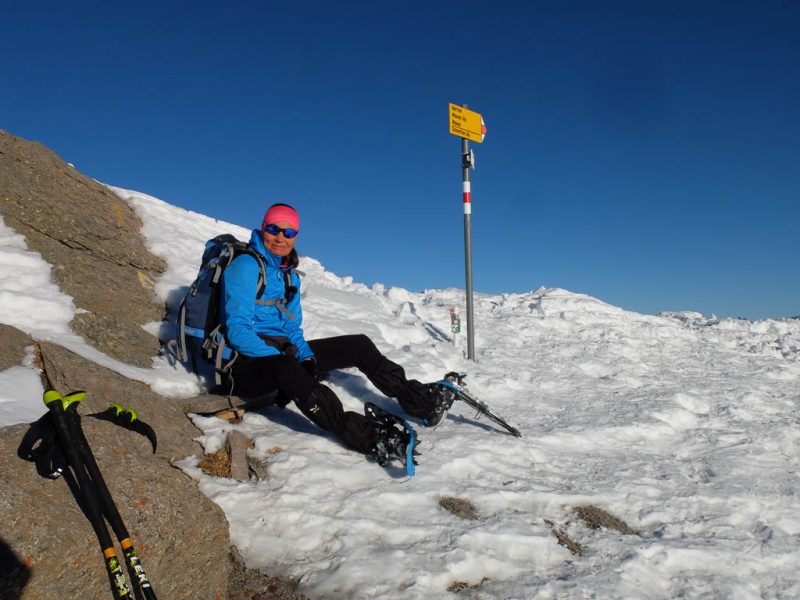 Mehr als einmal bin ich kurz davor, aufzugeben. Aber dann denke ich an Beppo Straßenkehrer aus dem Buch „Momo“ von Michael Ende, setze einen Fuß vor den anderen und schließlich ist es geschafft, wir erreichen nach drei Stunden und fünfunddreißig Minuten den Gipfel des Sandhubels. Ich bin froh, dass ich ein schneefreies Plätzchen finde, um mich setzen zu können, denn ich bin so k.o. wie schon lange nicht mehr. Ein paar Minuten der Erholung reichen allerdings, dann kann ich mich über die vollbrachte Leistung freuen: