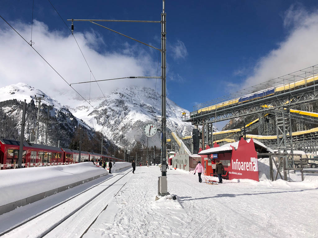 Ich kann ausschlafen, das ist schon einmal ein sehr guter Start in den Tag. Außerdem gönne ich mir vormittags eine einstündige Yogaeinheit. Anschließend geht es zusammen mit Guido nach Preda. Dort wollen wir mit den Schneeschuhen rund um den Lai da Palpuogna laufen. Diese Tour steht schon lange auf unserer Wunschliste. Der Bahnhof von Preda bei unserer Ankunft: