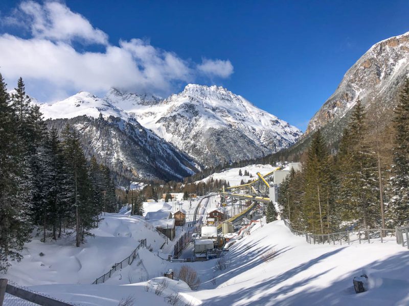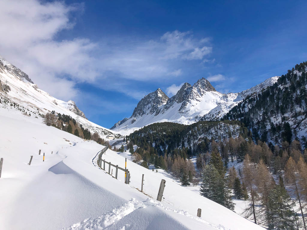 Wir gehen in die entgegengesetzte Richtung und können von der schneebedeckten Passstraße hinunter auf Preda und die Baustelle des Tunnelneubaus blicken: