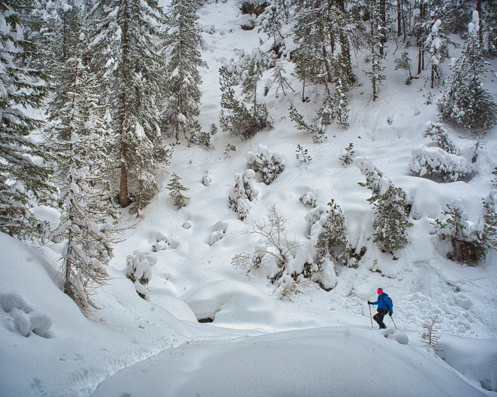 Anstrengend ist das Bergabgehen im steilen Tiefschnee aber trotzdem! Hier sind wir wieder an der Unteren Hauderalpe: