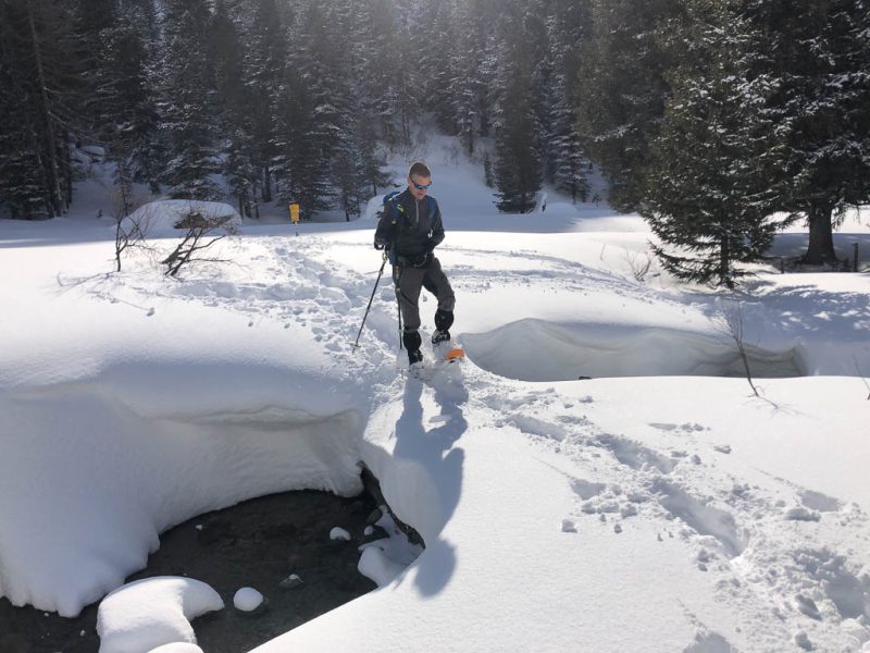 Hell und freundlich ist es am Morgen und so bleibt es auch den ganzen Tag über. Ich bin daher ein bisschen traurig, dass ich heute nicht am Sessellift, sondern im Dorfladen arbeite. Aber es ist so viel zu tun, dass die Traurigkeit schnell vergeht. Zudem kann ich zusammen mit Guido die Mittagspause für ein eineinhalbstündige Schneeschuhtour nutzen: