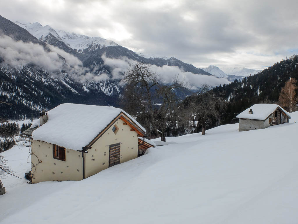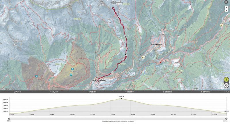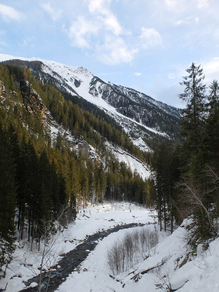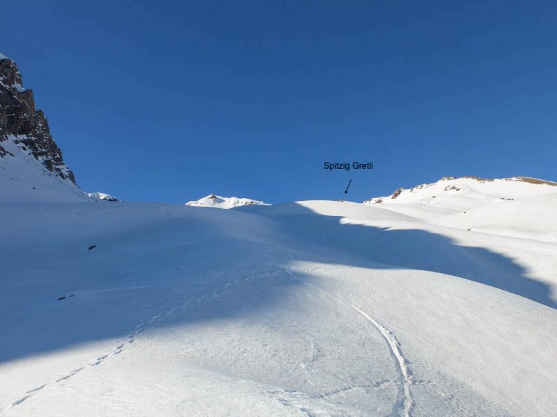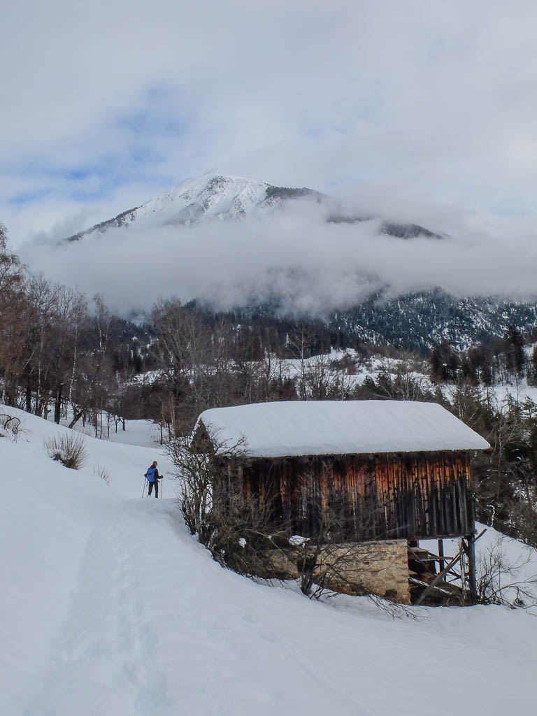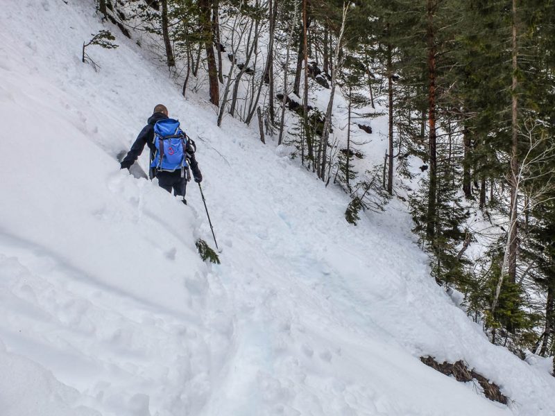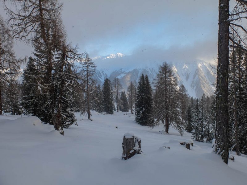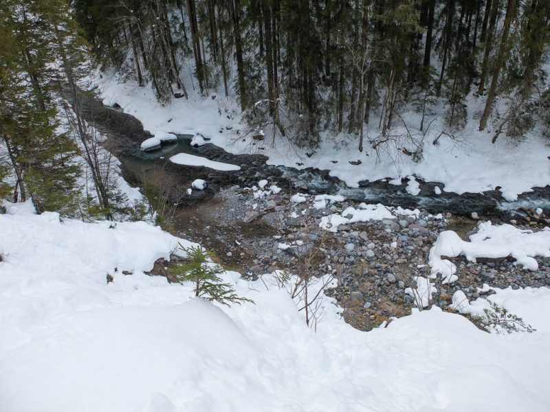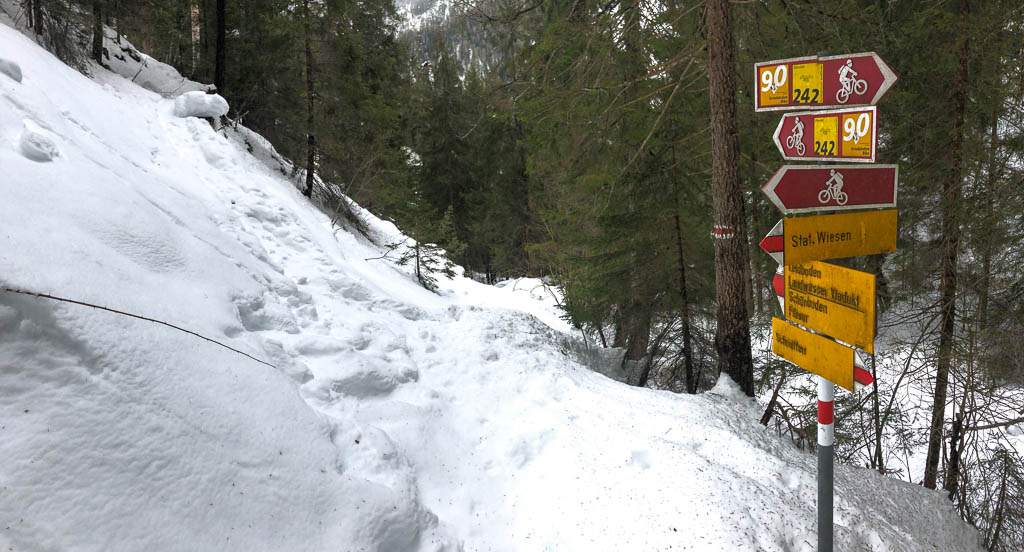 Diese Schwierigkeit meistern wir, aber wenige Meter weiter müssen wir dann doch umkehren: Dieses Mal versperrt uns ein extrem steiler und zudem spiegelglatter Lawinenabgang den Weg. Wir müssen also zurück zu einer Kreuzung oberhalb von Leidboden und probieren auf Weg Nummer zwei Wiesen zu erreichen. Zurück an der Wegkreuzung: