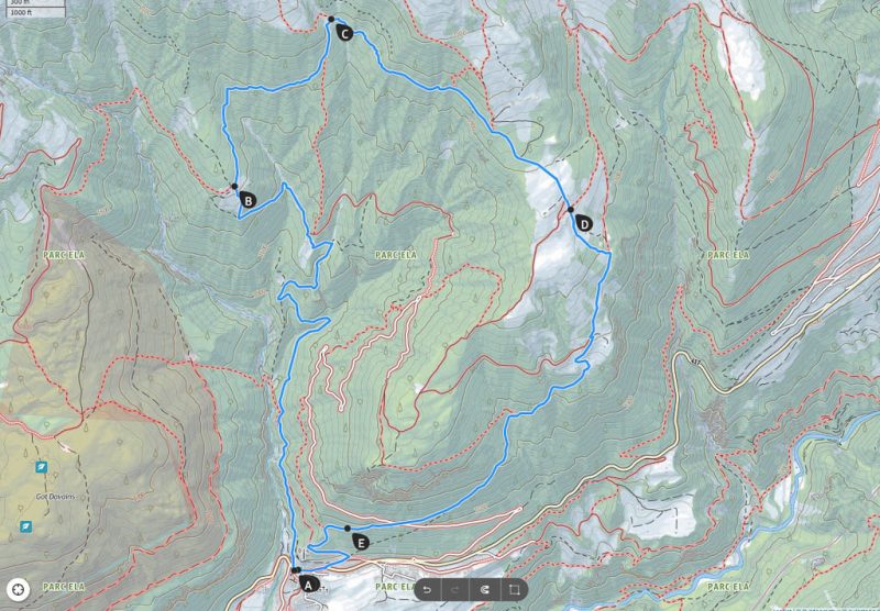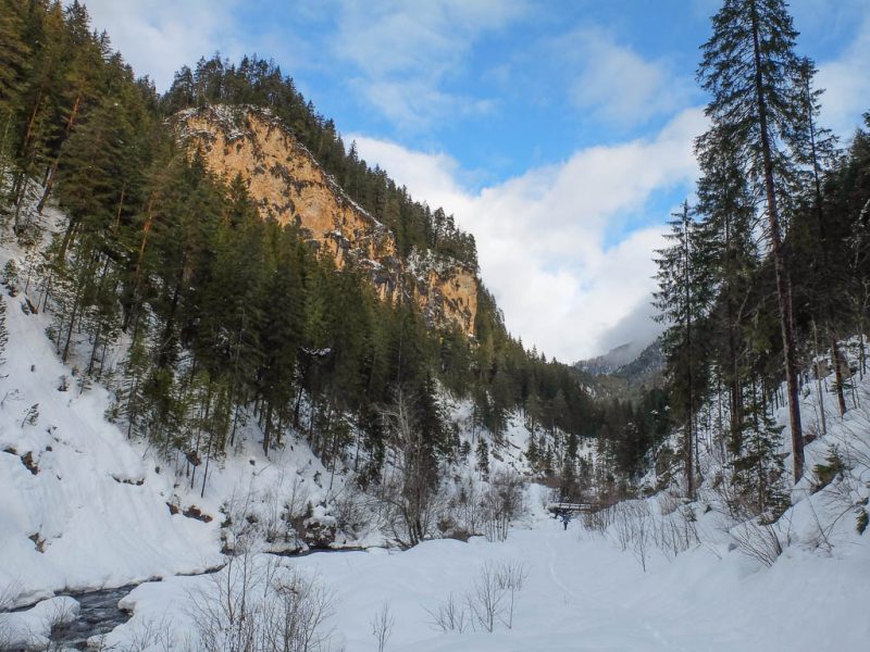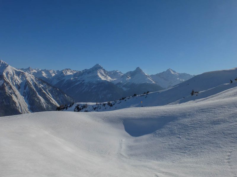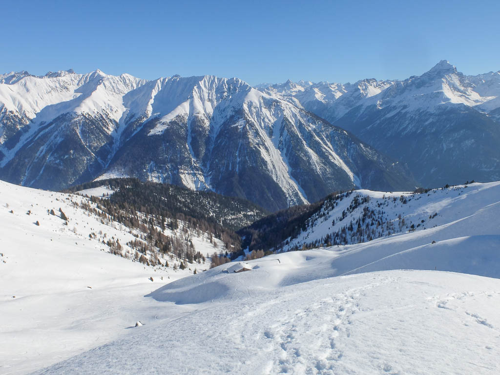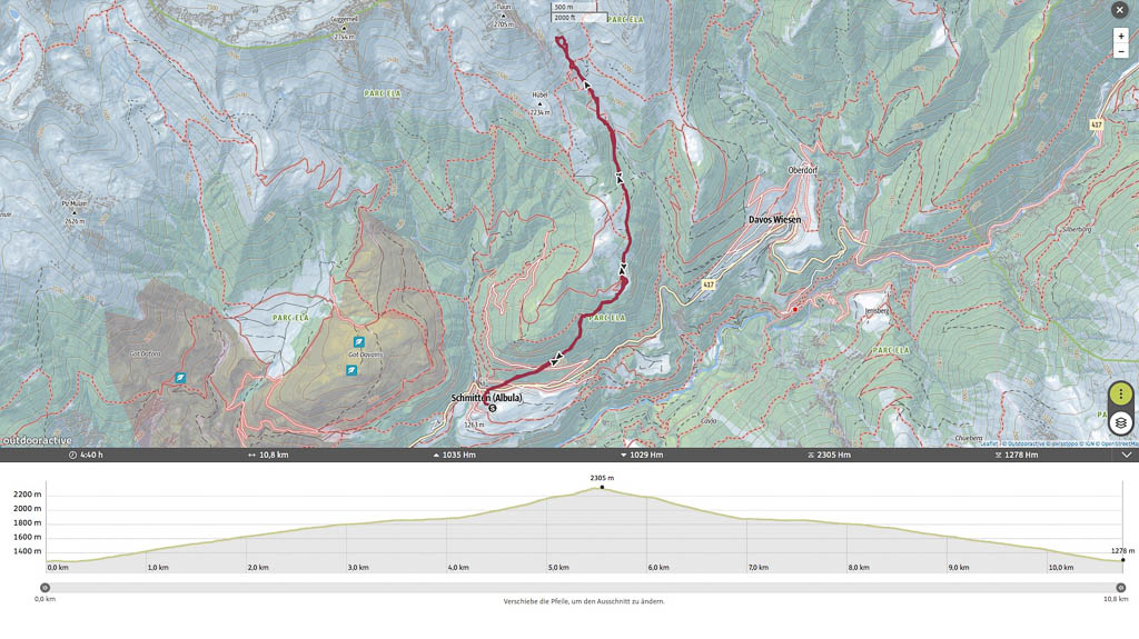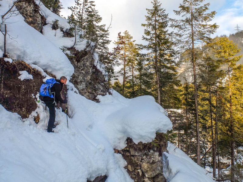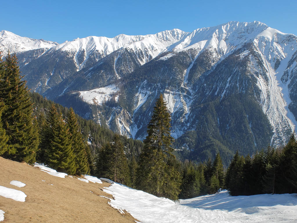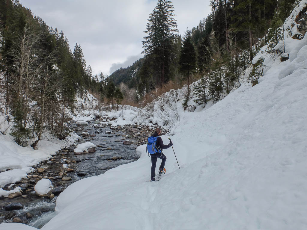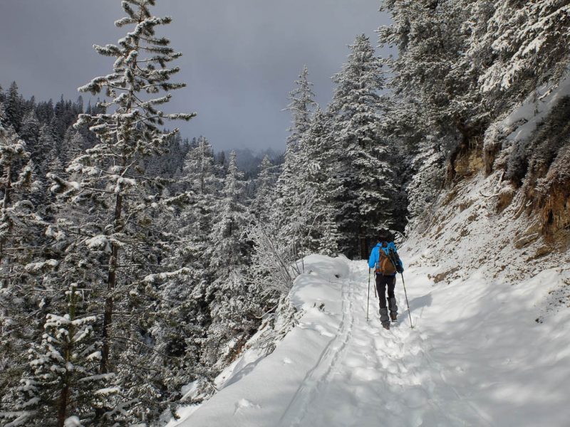 Diese Schwierigkeit meistern wir, aber wenige Meter weiter müssen wir dann doch umkehren: Dieses Mal versperrt uns ein extrem steiler und zudem spiegelglatter Lawinenabgang den Weg. Wir müssen also zurück zu einer Kreuzung oberhalb von Leidboden und probieren auf Weg Nummer zwei Wiesen zu erreichen. Zurück an der Wegkreuzung: