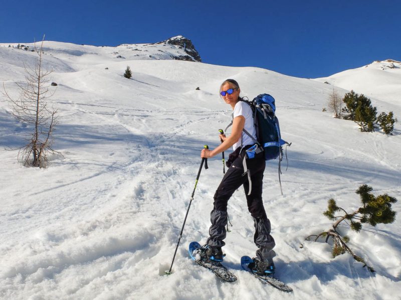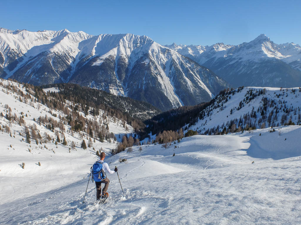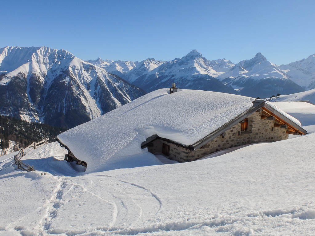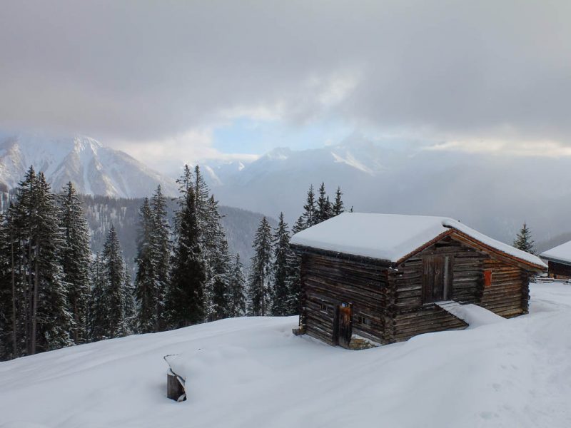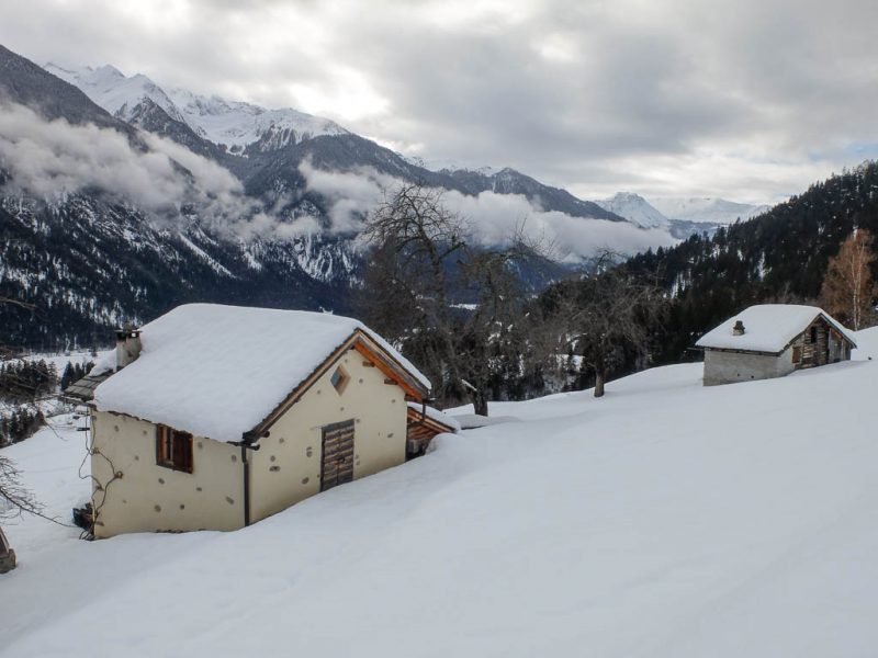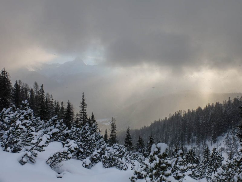Seit Mittwoch herrscht Föhnwetter, dementsprechend mild sind die Temperaturen. Heute liegen sie in Schmitten um die Mittagszeit bei 10 °C. Während einer Schneeschuhwanderung von Schmitten nach Wiesen kommen Guido und ich daher ziemlich ins Schwitzen und meine Jacke wandert in der Rucksack. Von Schmitten nach Wiesen führen mehrere Wege. Zuerst versuchen wir es über Leidboden. Hinter Leidboden wird der Weg allerdings zusehends mühsamer. Die vielleicht heikelste Stelle der Tour, das Queren einer kleinen Lawine: