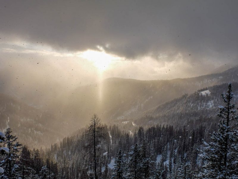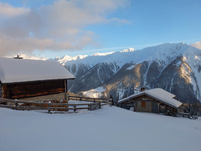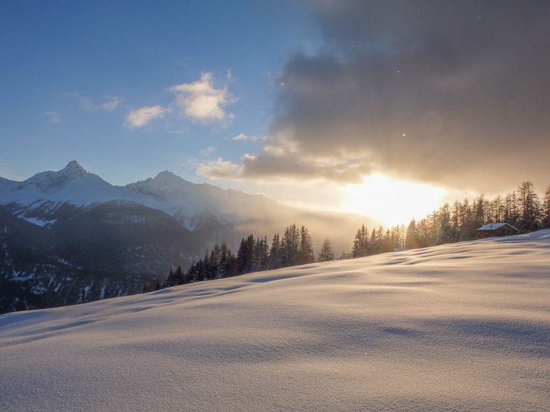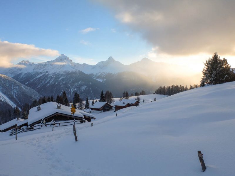 Weg Nummer zwei ist weitaus angenehmer zu gehen. Allerdings wird es langsam dunkel um uns herum und die Zeit bis zur Abfahrt des Busses, der uns von Wiesen zurück nach Schmitten bringen soll, knapp. So schnell es geht, stapfen wir daher durch den Tiefschnee und schaffen es tatsächlich, auf die Minute genau an der Haltestelle einzutreffen. Der Bus lässt allerdings auf sich warten, er hat Verspätung. Nun ja, besser so, als andersherum, denn der Bus hätte mit Sicherheit nicht auf uns gewartet.