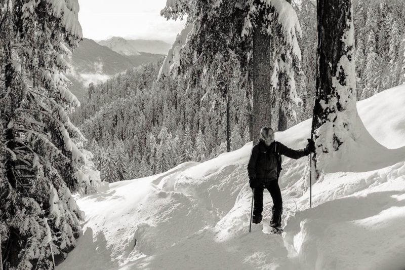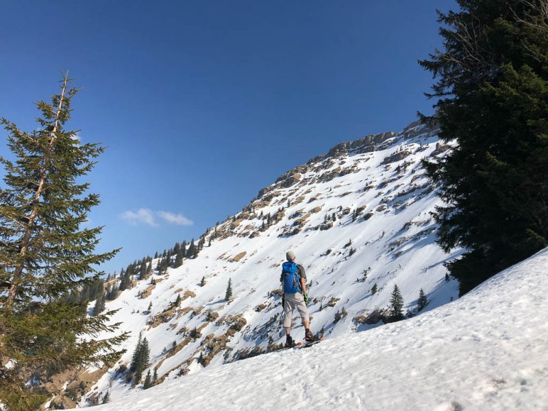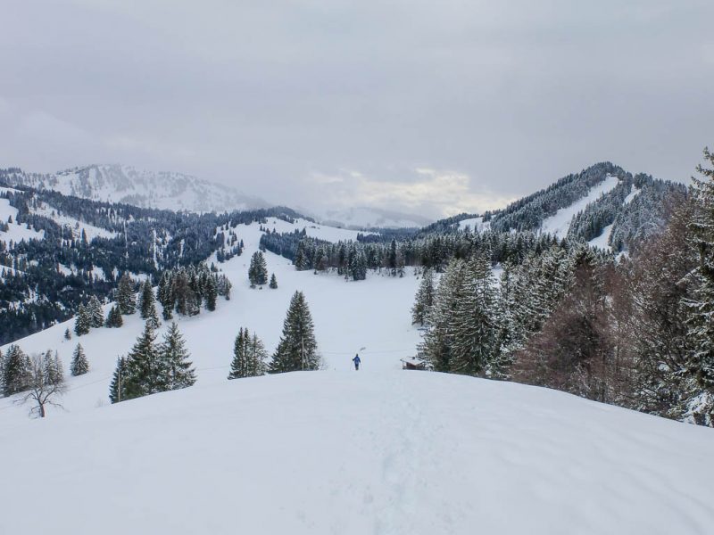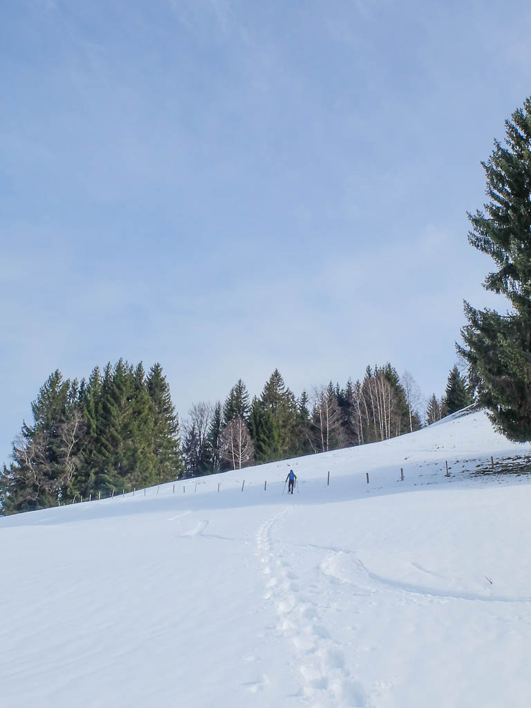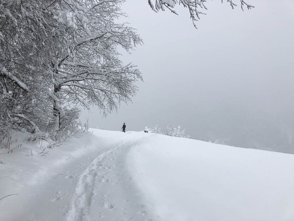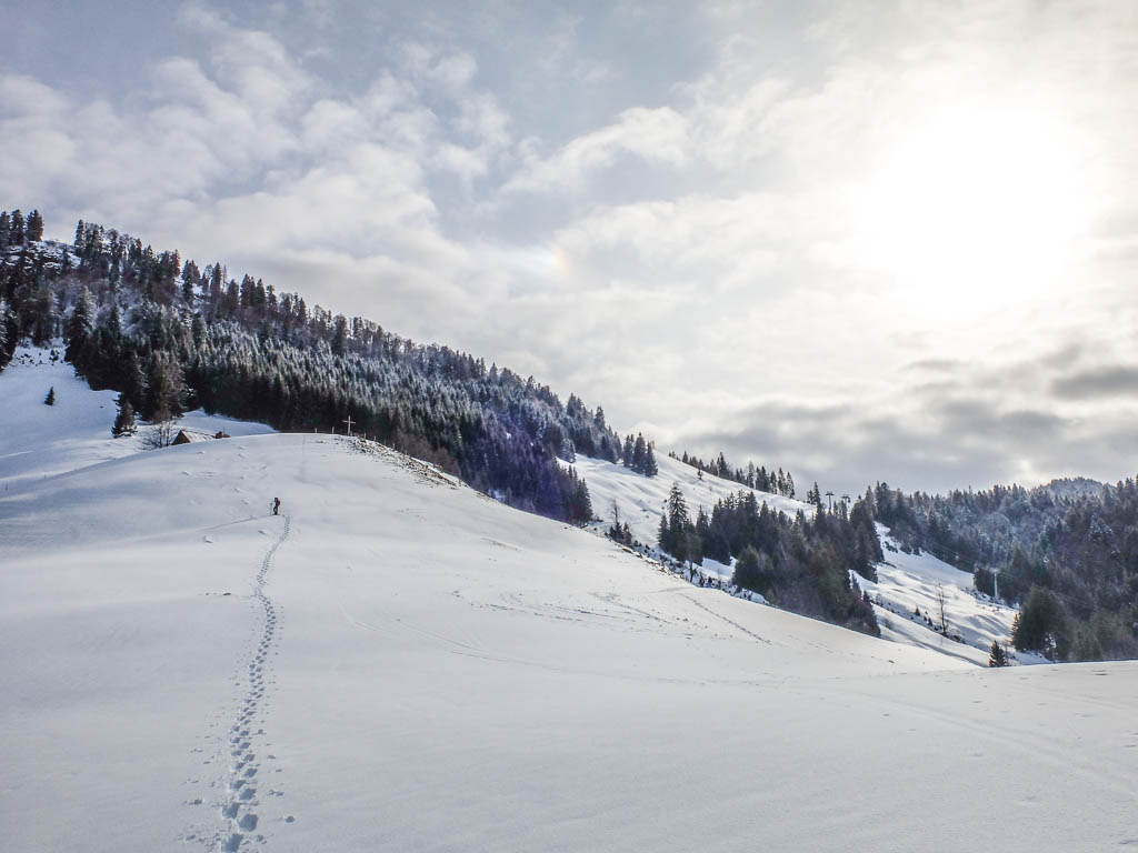 Am unteren linken Bildrand sieht man die Spur, die Guido und ich gestern in den Schnee gestapft haben. Am frühen Nachmittag sind wir erneut mit Schneeschuhen unterwegs, dieses Mal allerdings bei deutlich freundlicherem Wetter: