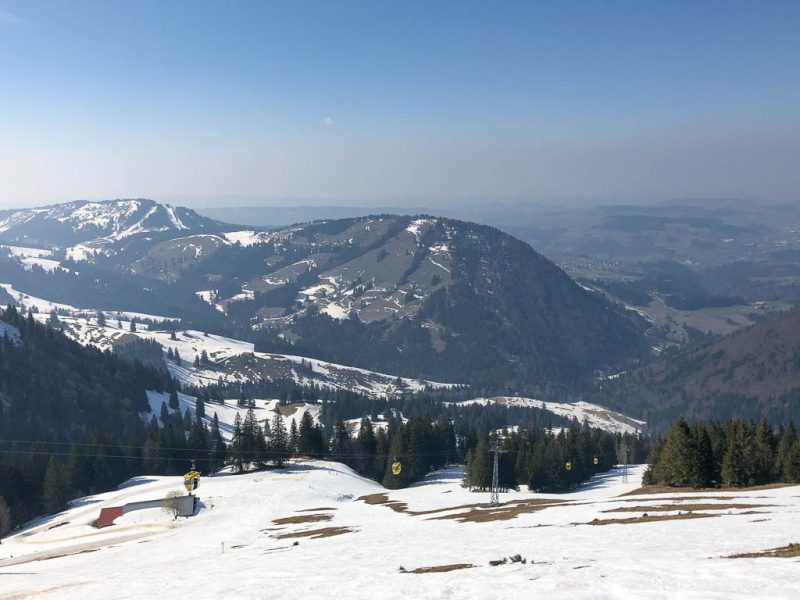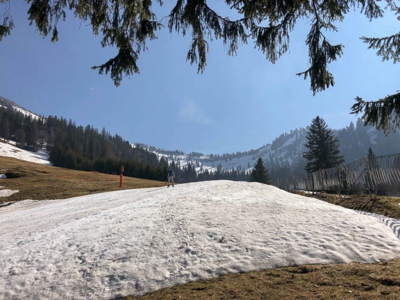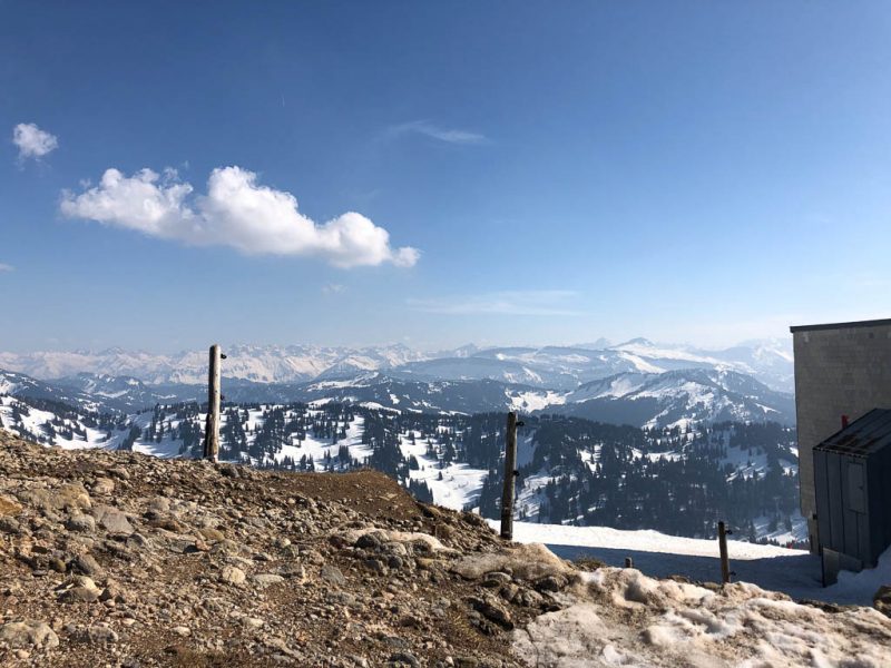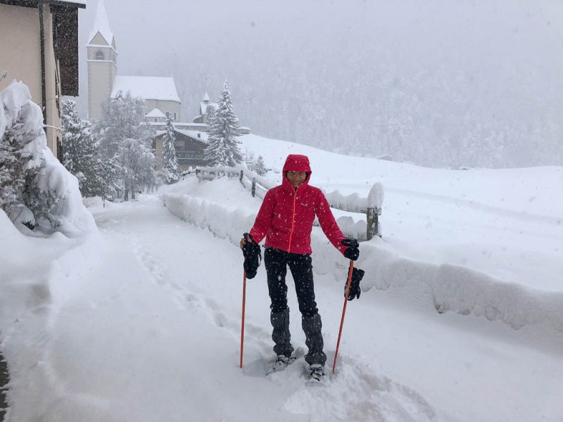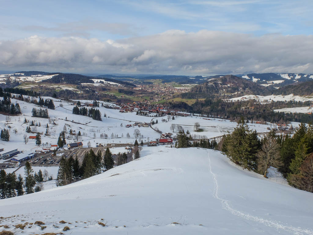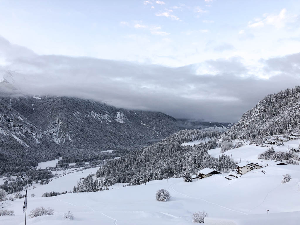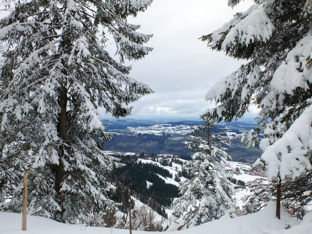 Am unteren linken Bildrand sieht man die Spur, die Guido und ich gestern in den Schnee gestapft haben. Am frühen Nachmittag sind wir erneut mit Schneeschuhen unterwegs, dieses Mal allerdings bei deutlich freundlicherem Wetter: