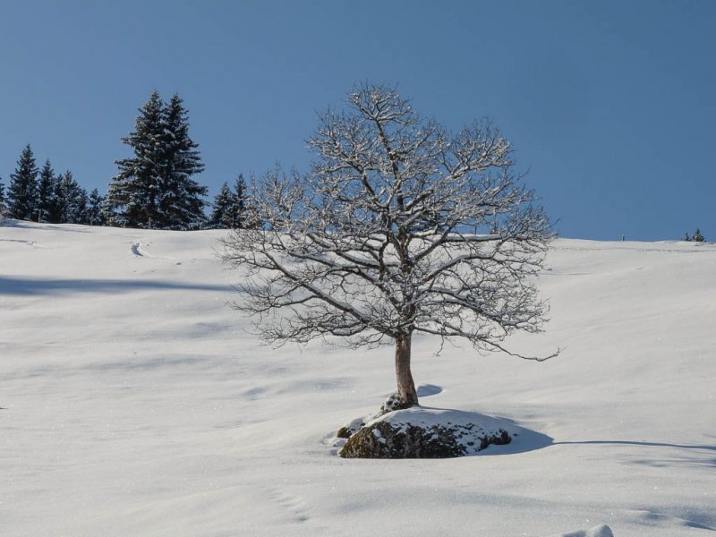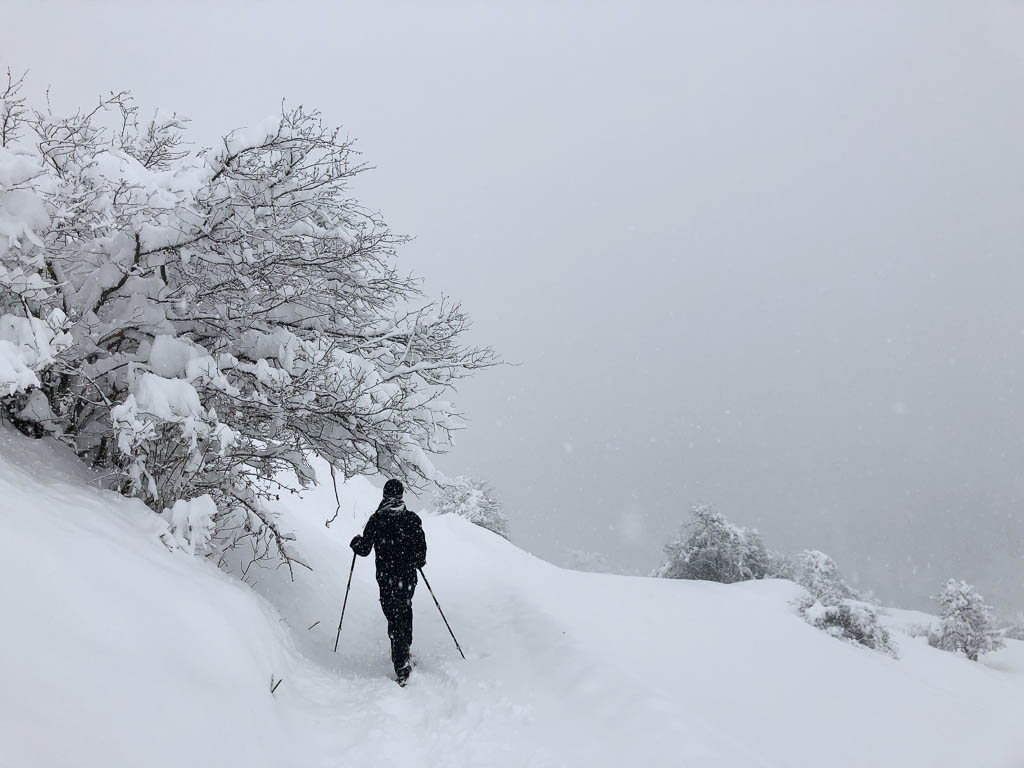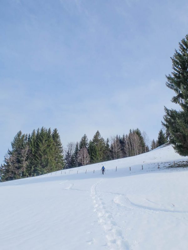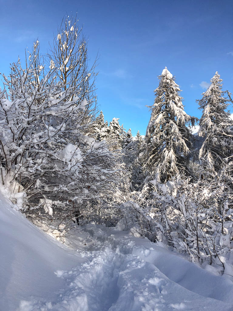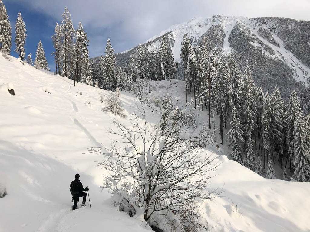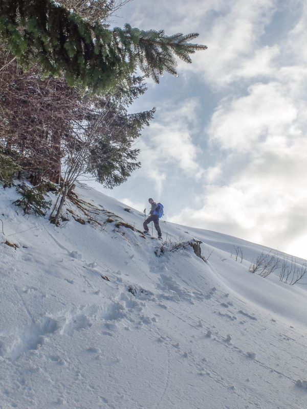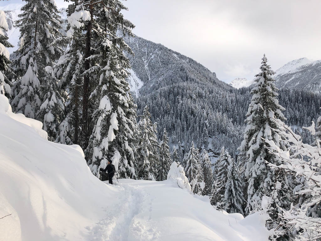 Die Stapferei durch den Pulverschnee, egal ob bergab oder bergauf, ist anstrengend und oftmals kommen wir nur im Schneckentempo vorwärts. Das Erleben der tiefverschneiten Natur um uns herum ist diese Anstrengung jedoch auf jeden Fall wert.